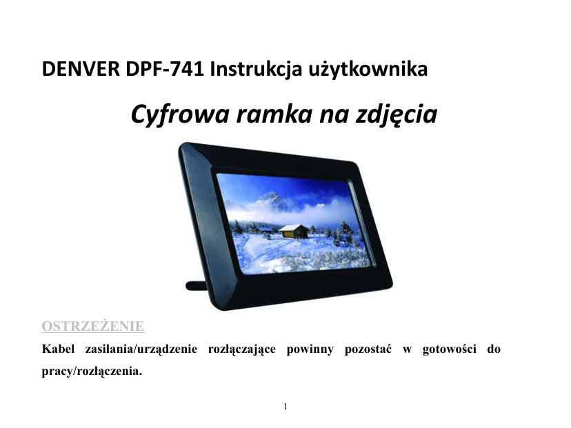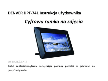 DENVER DPF‐741 Instrukcja użytkownika Cyfrowa ramka na zdjęcia OSTRZEŻENIE Kabel zasilania/urządzenie rozłączające powinny pozostać w gotowości do pracy/rozłączenia. 1 Wprowadzenie Gratulujemy zakupu cyfrowej ramki na zdjęcia Digital Photo Frame. Przed uruchomieniem urządzenia prosimy dokładnie zapoznać się z instrukcją i zachować ją na przyszłość. Dzięki instrukcji będzie można skorzystać z wszystkich atrakcyjnych funkcji urządzenia i oglądanie cyfrowej ramki na zdjęcia Digital Photo Frame będzie sprawiało większą przyjemność. Cyfrowa ramka na zdjęcia Digital Photo Frame umożliwia oglądanie cyfrowych zdjęć bezpośrednio z karty pamięci aparatu. Można także utworzyć pokaz slajdów z różnorodnymi efektami przejścia. Nie jest wymagane żadne połączenie z komputerem, aparatem cyfrowym ani Internetem. ●Odtwarza zdjęcia zapisane na urządzeniach do przechowywania danych poprzez port USB 2.0, różne czytniki kart lub z pamięci wbudowanej. 2 ●Obsługa kart SD, MMC oraz MS. ●Urządzenie kompatybilne z większością aparatów cyfrowych zapisujących zdjęcia jako pliki JPEG. ●Automatyczny pokaz slajdów z różnorodnymi efektami przejścia oraz regulowanym czasem wyświetlania. ●Kartę pamięci należy wkładać rowkami w kierunku do siebie. Nie wkładaj karty pamięci do gniazda na siłę. ●Jeśli nie można łatwo włożyć karty pamięci do końca, być może jest włożona niewłaściwą stroną. Uwaga: DPF = Cyfrowa ramka na zdjęcia Digital Photo Frame. Środki zapobiegawcze i konserwacja • Wyłącznie do użytku w pomieszczeniach. • Aby uniknąć uszkodzenia plików lub porażenia elektrycznego, nie należy narażać tego 3 urządzenia na wilgoć. • Aby uniknąć przegrzania, nigdy nie należy blokować otworów wentylacyjnych z tyłu ramki. • Multimedialną cyfrową ramkę na zdjęcia należy trzymać z dala od bezpośredniego światła słonecznego. Bezpośrednie światło słoneczne może ją uszkodzić. • Nie należy rozmontowywać multimedialnej cyfrowej ramki na zdjęcia. Istnieje zagrożenie porażeniem elektrycznym. W środku nie ma części, które użytkownik mógłby serwisować samodzielnie. Rozmontowanie multimedialnej cyfrowej ramki na zdjęcia unieważni gwarancję. • Nie należy używać multimedialnej cyfrowej ramki na zdjęcia, jeśli warunki mogłyby doprowadzić do kondensacji lub uszkodzenia. 4 5 Przyciski kontrolne i funkcyjne: 1. Przycisk ENTER (wprowadzenie): Potwierdzanie wyboru, odtwarzania lub pauzy. 2. Przycisk PRZESUNIĘCIA W LEWO: Wybór funkcji przesunięciem kursora w lewo lub do góry, albo oglądanie poprzedniego zdjęcia. 3. Przycisk PRZESUNIĘCIA W PRAWO: Wybór funkcji przesunięciem kursora w prawo lub do dołu, albo oglądanie następnego zdjęcia. 4. Przycisk MENU: Naciśnięcie i przytrzymanie przycisku przez dwie sekundy wyświetla opcje menu ramki zdjęć. Krótkie przyciśnięcie przywraca menu poprzednie. 5. Przycisk GOTOWOŚCI: Wyłącza lub włącza DPF. 6 6. Wspornik 7 Czynności wstępne Umieść podpórkę w ramce Digital Photo Frame, aby podeprzeć ramkę. Podłącz wtyczkę zasilacza DC najpierw do odtwarzacza DPF, a następnie podłącz przewód zasilający do standardowego gniazdka w ścianie. Po włożeniu do ramki karty pamięci lub pamięci flash USB, zdjęcia zapisane na karcie pamięci lub pamięci flash USB automatycznie zaczną się pojawiać na ekranie. Zasilacz sieciowy DPF Gniazdko 8 9 Funkcje DPF ●WYBÓR KARTY W modelu z pokazem slajdów naciśnij trzykrotnie przycisk menu, aby wyświetlić menu wyboru urządzenia. Naciśnij przyciski strzałek, aby wybrać kartę, tarczę U albo pamięć wbudowaną. Naciśnij przycisk Enter, aby zatwierdzić (Rys.1). Rys.1 Rys.2 10 ●GŁÓWNE FUNKCJE Po wybraniu urządzenia, za pomocą przycisków strzałek można wybrać główne funkcje, takie jak Pokaz slajdów, Zdjęcie oraz Kalendarz (Rys.2). Naciśnij przycisk Enter wybierając określony tryb funkcji. 1. Pokaz slajdów: W tej funkcji menu naciśnięcie przycisku Enter włącza tryb pokazu slajdów, odtwarzacz wyświetli zdjęcie automatycznie. 2. Zdjęcie: Ta funkcja pozwala przeglądać zdjęcia w pojedynczym oknie albo sześciu oknach. 3. Kalendarz: Ta funkcja wyświetla użytkownikowi kalendarz oraz zegar. ●FUNKCJA ZDJĘCIA W tym trybie funkcji (Rys.3). 1. Naciśnij przyciski strzałek, aby wybrać przegląd zdjęć w sześciu oknach. 2. Naciśnij przycisk Enter, aby wyświetlić obrazki. 11 3. Naciśnij przycisk Menu, aby wyświetlić menu ustawień w pauzie pokazu slajdów. 4. Naciśnij przycisk menu, aby wyjść do głównego Rys.3 trybu funkcji. ●FUNKCJA KALENDARZA Funkcja ta służy do wyświetlania kalendarza oraz zegara (Rys.4). 1. Za pomocą przycisków strzałek można przeglądać kalendarz pokazywany po lewej stronie Rys.4 ramki DPF. 2. Jeśli na wybranej karcie znajdują się pliki jpg, można przeglądać zdjęcia w małym oknie. 3. Naciśnięcie przycisku menu oznacza wyjście z trybu wyświetlania kalendarza. Ustawienia ramki DPF Naciśnij przycisk Menu, aby wejść do menu 12 ustawień. W menu ustawień za pomocą przycisków strzałek można wybrać pozycję do ustawienia i obsługi. Jeśli pozycja wyświetlana jest na szaro, nie można w niej dokonać żadnych zmian (Rys. 5). 1. Rozmiar obrazu: Tryb wyświetlania pokazu slajdów. Zawiera trzy tryby: automatyczne dopasowanie, optymalizację oraz panel skanowania. 2. Efekt pokazu slajdów: Specjalne efekty przejścia z jednego zdjęcia na drugie w pokazie Rys.5 slajdów. 3. Odstęp w pokazie slajdów: Czas wyświetlania następnego zdjęcia. 4. Podział w pokazie slajdów: Ilość obrazów wyświetlanych w trybie wyświetlania według podziału w pokazie slajdów jest jeden albo cztery. 5. Rozpoczęcie pokazu slajdów: Rozpoczęcie pokazu slajdów. 6. Obracanie: Obracanie wyświetlanego zdjęcia o 90 stopni w lewo (w czasie pauzy w pokazie slajdów). 7. Przybliżanie: Przybliżanie