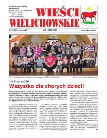 WIEŒCI WIELICHOWSKIE Urz¹d Miasta i Gminy Wielichowo Rynek 10, 64-050 Wielichowo tel. 061 44 33 001, 061 44 33 082 www.wielichowo.pl Nr 1 (39) styczeñ 2011 „Wieœci Wielichowskie” 1 ISSN 1898-7389 To im zawdziêczamy najwiêcej – wolontariusze WOŒP w Wielichowie. pismo bezp³atne Fot. za stron¹ www.wielichowo.pl XIX Fina³ WOŒP Wszystko dla chorych dzieci! Nadzwyczajnie hojni okazali siê mieszkañcy gminy Wielichowo w XIX-tym Finale Wielkiej Orkiestry Œwi¹tecznej Pomocy. Inicjatywa Jerzego Owsiaka trafi³a tu na podatny grunt. I trudno siê dziwiæ. W ten sposób mo¿na w namacalny sposób pomóc dzieciom. Chyba na ka¿dym szpitalnym oddziale dzieciêcym jest ju¿ zakupiony przez Orkiestrê nowoczesny sprzêt medyczny pomagaj¹cy ratowaæ ¿ycie najm³odszych. Orkiestra zagra³a 9 stycznia, a w gminie pobity zosta³ dotychczasowy jej finansowy wynik. Wrzucaj¹c pieni¹dze do 50 puszek i poprzez udzia³ w trzech koncertach: w £ubnicy, Wilkowie Polskim i Wielichowie uzbieraliœmy w sumie 13.928,55 z³. Szko³a w Gradowicach zebra³a 653,24 z³, szko³a w £ubnicy 1.700,81 z³, szko³a w Wilkowie 1.946,42 z³, harcerze 3.928,91 z³, a pracownicy Centrum Kultury i stra¿acy 1.919,17 z³. Do tego wypada jeszcze doliczyæ 3.780,00 z³ z aukcji. Dla porównania: w ubieg³ym roku sztab zebra³ 11.471,22 z³. Licytacje, koncerty, serduszka, zbiórka na pomoc dla chorych dzieci tworz¹ niezwykle przyjazny klimat jaki od wielu lat przyœwieca tej ogólnopolskiej akcji. Dziêki wielu osobom i instytucjom, co roku udaje siê w naszej gminie powiêkszaæ pulê zebranych pieniêdzy. Wielkie podziêkowania nale¿¹ siê najwiêkszym sponsorom, firmom: Santano, Grzybmar, RZD Wielichowo, Elagra Zielêcin, GS Wielichowo, Terra oraz pozosta³ym zak³adom pracy i wielu darczyñcom prywatnym. Prowadzonej w Centrum Kultury w Wielichowie aukcji towarzyszy³y poka- zy grup tanecznych, koncerty gitarzystów i keybordzistów, popisy wokalne najm³odszych i tych trochê starszych, jase³ka bo¿onarodzeniowe przedszkolaków oraz przeja¿d¿ki samochodem stra¿ackim i malowanie twarzy. Organizatorzy dziêkuj¹ przede wszystkim licznym wolontariuszom, którzy nie licz¹c swego czasu i z wielkim zaanga¿owaniem, wytrwale d¹¿yli do uzyskania jak najlepszego ostatecznego rezultatu. Podziêkowania nale¿¹ siê te¿ wszystkim, którzy w jakikolwiek inny sposób przyczynili siê do zorganizowania XIX Fina³u, a tak¿e koñcowego sukcesu i rekordowego wyniku zbiórki pieniêdzy przeznaczonych przecie¿ na szczytny cel. Sie ma!!! I do zobaczenia za rok, na jubileuszowym XX-tym Finale WOŒP, który – co ju¿ wiemy – odbêdzie siê 8 stycznia 2012 roku. (o) 2 „Wieœci Wielichowskie” Dla œwietlicy w Reñsku Czêœæ halowa oraz techniczno-socjalna budynku SUW. Fot. J. Malkiewicz Stacja Uzdatniania Wody Trwaj¹ prace Trwaj¹ roboty przy budowie stacji uzdatniania wody prowadzone przez Przedsiêbiorstwo EUROAQUA Sp. z o.o. z Poznania. Inwestycja z dnia na dzieñ nabiera realnych kszta³tów. Jest to niezbêdne, ale kosztowne przedsiêwziêcie, tote¿ postêp prac mieszkañcy obserwuj¹ ze zrozumia³ym zainteresowaniem. Do tej pory wykonana zosta³a linia napowietrzna œredniego napiêcia oraz stacja transformatorowa, która docelowo bêdzie zasilaæ stacjê uzdatniania wody, a obecnie dostarcza energiê elektryczn¹ na plac budowy. Wybudowano czêœæ halow¹ oraz technicznosocjaln¹ budynku SUW. Obecnie prowadzone s¹ prace przy budowie dwukomorowego ¿el- betowego zbiornika wody o pojemnoœci 600 m 3 . Prace przebiegaj¹ zgodnie z przyjêtym harmonogramem. Termin zakoñczenia robót ustalono na 31 maja 2011 r. Koszt budowy wyniesie 2.868.837,63 z³. Inwestycja jest czêœci¹ projektu pn. „Budowa sieci wodoci¹gowej w miejscowoœci Wielichowo, WielichowoWieœ, Ziemin, sieci tranzytowej do Œniat, £ubnicy, Trzcinicy, kanalizacji sanitarnej w czêœci m. Wielichowo oraz stacji uzdatniania wody dla gminy Wielichowo” realizowanego w ramach dzia³ania „Podstawowe us³ugi dla gospodarki i ludnoœci wiejskiej” Programu Rozwoju Obszarów Wiejskich 2007-2013. JM Babski wieczór We wtorkowy wieczór 11 stycznia odby³o siê spotkanie cz³onkiñ Stowarzyszenia Kó³ Gospodyñ Wiejskich w Wielichowie. Licznie zebrane panie przywita³a El¿bieta Stachecka, prezes stowarzyszenia. By³o to pierwsze spotkanie w nowym roku, zatem nie mog³o zabrakn¹æ noworocznego toastu, ¿yczeñ i oczywiœcie pysznoœci na stole, które panie same przygotowa³y. Goœciom czas umili³ zespó³ dzieciêcy „Weso³e Chmurki” pod opiek¹ Damiana Popio³kiewicza, goœcinnie wyst¹pi³ te¿ chór Wielis³aw. Spotkanie up³ynê³o w mi³ej atmosferze, Panie mog³y chocia¿ na chwilkê zapomnieæ i uciec od domowych obowi¹zków. RJ „Wieœci Wielichowskie”. Miesiêcznik informacyjny. Redaguje Urz¹d Miasta i Gminy Wielichowo. Red. naczelny Jolanta Napiera³a. Wspó³pracownicy: Renata Jarczyñska, Tadeusz J¹der (red. prowadz¹cy numer), Anna Piechota, Bart³omiej K¹tny. Adres: Centrum Kultury „Pod Wie¿¹” 64-050 Wielichowo, ul. Pocztowa 16, tel. (061) 44 33 199. Pod mailowym adresem: [email protected] mo¿na do "Wieœci Wielichowskich" przekazywaæ swoje uwagi, propozycje i zapytania. Wydawca: Przedsiêbiorstwo AGA. Druk: Zak³ad Poligraficzny Zb. So³tysiak, Koœcian. Nak³ad 1000 egzemplarzy. Dziêki wdro¿onemu w powiecie g r o d z i s k i m p r o g r a m o w i L e a d e r, œwietlica wiejska w Reñsku otrzyma³a wsparcie finansowe na zakup wyposa¿enia kuchennego. Wniosek o dofinansowanie w ramach dzia³ania 413 „Wdra¿anie lokalnych strategii rozwoju dla ma³ych projektów za poœrednictwem Lokalnej Grupy Dzia³ania” gmina Wielichowo z³o¿y³a w marcu ubr., natomiast 7 grudnia 2010 r. burmistrz podpisa³ umowê o przyznaniu dofinansowania. Za uzyskane œrodki zakupiono m.in. meble kuchenne, kuchenkê gazow¹, porcelanê obiadow¹, sztuæce, garnki, szklanki, termosy. £¹czny koszt zakupu wymienionych artyk