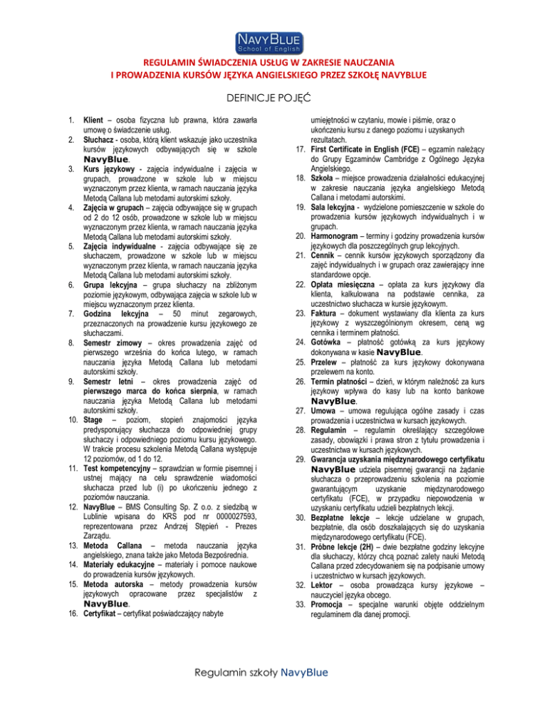 REGULAMIN ŚWIADCZENIA USŁUG W ZAKRESIE NAUCZANIA I PROWADZENIA KURSÓW JĘZYKA ANGIELSKIEGO PRZEZ SZKOŁĘ NAVYBLUE DEFINICJE POJĘĆ 1. 2. 3. 4. 5. 6. 7. 8. 9. 10. 11. 12. 13. 14. 15. 16. Klient – osoba fizyczna lub prawna, która zawarła umowę o świadczenie usług. Słuchacz - osoba, którą klient wskazuje jako uczestnika kursów językowych odbywających się w szkole NavyBlue. Kurs językowy - zajęcia indywidualne i zajęcia w grupach, prowadzone w szkole lub w miejscu wyznaczonym przez klienta, w ramach nauczania języka Metodą Callana lub metodami autorskimi szkoły. Zajęcia w grupach – zajęcia odbywające się w grupach od 2 do 12 osób, prowadzone w szkole lub w miejscu wyznaczonym przez klienta, w ramach nauczania języka Metodą Callana lub metodami autorskimi szkoły. Zajęcia indywidualne - zajęcia odbywające się ze słuchaczem, prowadzone w szkole lub w miejscu wyznaczonym przez klienta, w ramach nauczania języka Metodą Callana lub metodami autorskimi szkoły. Grupa lekcyjna – grupa słuchaczy na zbliżonym poziomie językowym, odbywająca zajęcia w szkole lub w miejscu wyznaczonym przez klienta. Godzina lekcyjna – 50 minut zegarowych, przeznaczonych na prowadzenie kursu językowego ze słuchaczami. Semestr zimowy – okres prowadzenia zajęć od pierwszego września do końca lutego, w ramach nauczania języka Metodą Callana lub metodami autorskimi szkoły. Semestr letni – okres prowadzenia zajęć od pierwszego marca do końca sierpnia, w ramach nauczania języka Metodą Callana lub metodami autorskimi szkoły. Stage – poziom, stopień znajomości języka predysponujący słuchacza do odpowiedniej grupy słuchaczy i odpowiedniego poziomu kursu językowego. W trakcie procesu szkolenia Metodą Callana występuje 12 poziomów, od 1 do 12. Test kompetencyjny – sprawdzian w formie pisemnej i ustnej mający na celu sprawdzenie wiadomości słuchacza przed lub (i) po ukończeniu jednego z poziomów nauczania. NavyBlue – BMS Consulting Sp. Z o.o. z siedzibą w Lublinie wpisana do KRS pod nr 0000027593, reprezentowana przez Andrzej Stępień - Prezes Zarządu. Metoda Callana – metoda nauczania języka angielskiego, znana także jako Metoda Bezpośrednia. Materiały edukacyjne – materiały i pomoce naukowe do prowadzenia kursów językowych. Metoda autorska – metody prowadzenia kursów językowych opracowane przez specjalistów z NavyBlue. Certyfikat – certyfikat poświadczający nabyte 17. 18. 19. 20. 21. 22. 23. 24. 25. 26. 27. 28. 29. 30. 31. 32. 33. umiejętności w czytaniu, mowie i piśmie, oraz o ukończeniu kursu z danego poziomu i uzyskanych rezultatach. First Certificate in English (FCE) – egzamin należący do Grupy Egzaminów Cambridge z Ogólnego Języka Angielskiego. Szkoła – miejsce prowadzenia działalności edukacyjnej w zakresie nauczania języka angielskiego Metodą Callana i metodami autorskimi. Sala lekcyjna - wydzielone pomieszczenie w szkole do prowadzenia kursów językowych indywidualnych i w grupach. Harmonogram – terminy i godziny prowadzenia kursów językowych dla poszczególnych grup lekcyjnych. Cennik – cennik kursów językowych sporządzony dla zajęć indywidualnych i w grupach oraz zawierający inne standardowe opcje. Opłata miesięczna – opłata za kurs językowy dla klienta, kalkulowana na podstawie cennika, za uczestnictwo słuchacza w kursie językowym. Faktura – dokument wystawiany dla klienta za kurs językowy z wyszczególnionym okresem, ceną wg cennika i terminem płatności. Gotówka – płatność gotówką za kurs językowy dokonywana w kasie NavyBlue. Przelew – płatność za kurs językowy dokonywana przelewem na konto. Termin płatności – dzień, w którym należność za kurs językowy wpływa do kasy lub na konto bankowe NavyBlue. Umowa – umowa regulująca ogólne zasady i czas prowadzenia i uczestnictwa w kursach językowych. Regulamin – regulamin określający szczegółowe zasady, obowiązki i prawa stron z tytułu prowadzenia i uczestnictwa w kursach językowych. Gwarancja uzyskania międzynarodowego certyfikatu NavyBlue udziela pisemnej gwarancji na żądanie słuchacza o przeprowadzeniu szkolenia na poziomie gwarantującym uzyskanie międzynarodowego certyfikatu (FCE), w przypadku niepowodzenia w uzyskaniu certyfikatu udzieli bezpłatnych lekcji. Bezpłatne lekcje – lekcje udzielane w grupach, bezpłatnie, dla osób doszkalających się do uzyskania międzynarodowego certyfikatu (FCE). Próbne lekcje (2H) – dwie bezpłatne godziny lekcyjne dla słuchaczy, którzy chcą poznać zalety nauki Metodą Callana przed zdecydowaniem się na podpisanie umowy i uczestnictwo w kursach językowych. Lektor – osoba prowadząca kursy językowe – nauczyciel języka obcego. Promocja – specjalne warunki objęte oddzielnym regulaminem dla danej promocji. Regulamin szkoły NavyBlue §1 1. 2. 3. 4. POSTANOWIENIA OGÓLNE NavyBlue świadczy usługi w zakresie kursów językowych języka angielskiego, w oparciu i w zakresie określonym w Umowie, Regulaminie, Harmonogramie i Cenniku. NavyBlue może odmówić uczestnictwa w kursie językowym słuchaczowi w szkoleniu w grupie, z uwagi na tzw. „dobro grupy” lub w przypadku nie uzyskania satysfakcjonującego wyniku z testu. NavyBlue zastrzega sobie prawo dokonywania zmian i przenoszenia słuchaczy z jednej do innej grupy na tym samym poziomie. NavyBlue prowadzi kursy językowe w oparciu o Metodę Callana i zastrzega sobie prawo do wprowadzania zmian i modyfikacji w systemie nauczania, które mają na celu poprawienie skuteczności nauczania i dostosowanie do indywidualnych uwarunkowań słuchaczy. 6. 7. 8. §4 1. 2. 3. §2 1. 2. 3. 4. 5. ZAKRES I WARUNKI PROWADZENIA KURSÓW JĘZYKOWYCH NavyBlue świadczy usługi w zakresie kursów językowych języka angielskiego na rzecz klienta i dla słuchaczy, w oparciu i w zakresie określonym w Umowie, Regulaminie, Harmonogramie i Cenniku. NavyBlue zobowiązuje się zapewnić jak najleps
