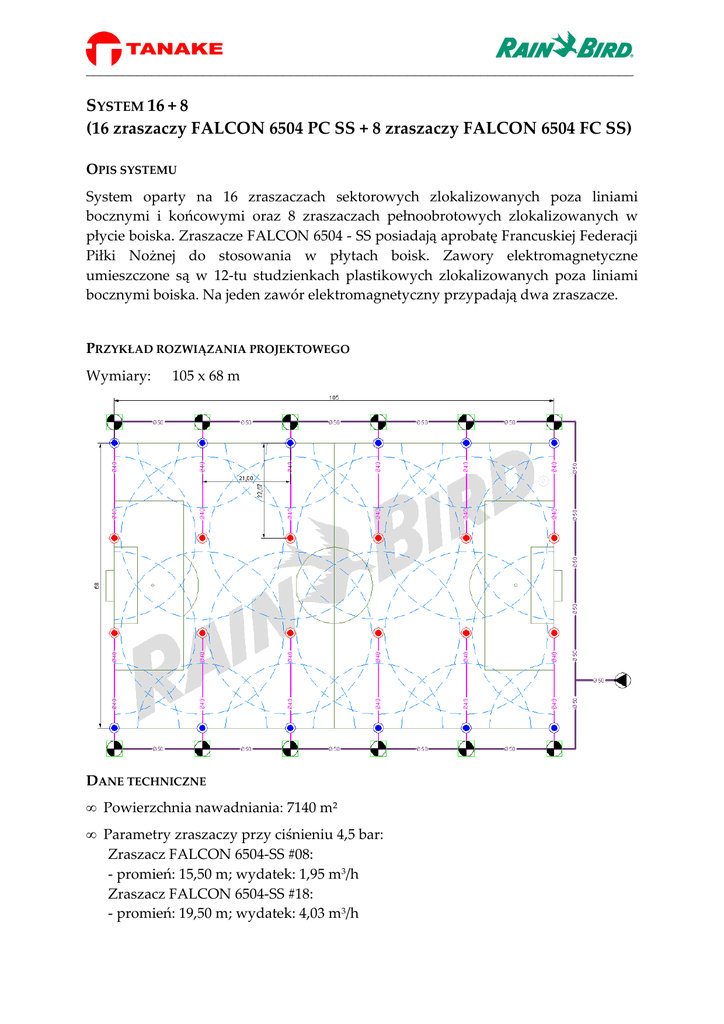 ___________________________________________________________________________ SYSTEM 16 + 8 (16 zraszaczy FALCON 6504 PC SS + 8 zraszaczy FALCON 6504 FC SS) OPIS SYSTEMU System oparty na 16 zraszaczach sektorowych zlokalizowanych poza liniami bocznymi i końcowymi oraz 8 zraszaczach pełnoobrotowych zlokalizowanych w płycie boiska. Zraszacze FALCON 6504 - SS posiadają aprobatę Francuskiej Federacji Piłki Nożnej do stosowania w płytach boisk. Zawory elektromagnetyczne umieszczone są w 12-tu studzienkach plastikowych zlokalizowanych poza liniami bocznymi boiska. Na jeden zawór elektromagnetyczny przypadają dwa zraszacze. PRZYKŁAD ROZWIĄZANIA PROJEKTOWEGO Wymiary: 105 x 68 m DANE TECHNICZNE • Powierzchnia nawadniania: 7140 m² • Parametry zraszaczy przy ciśnieniu 4,5 bar: Zraszacz FALCON 6504-SS #08: - promień: 15,50 m; wydatek: 1,95 m3/h Zraszacz FALCON 6504-SS #18: - promień: 19,50 m; wydatek: 4,03 m3/h ___________________________________________________________________________ • Rozstawa zraszaczy: 21,00 x 22,67 m • Liczba sekcji nawadniających: - 4 sekcje x 1 zraszacz 6504 PC SS 900 + 1 zraszacz 6504 PC SS 1800 - 8 sekcji x 1 zraszacz 6504 PC SS 1800 + 1 zraszacz 6504 FC SS 3600 Razem: 12 sekcji • Wymagane parametry źródła wody: Wydatek max.: 6 m3/h Ciśnienie: 5,5 bar PRZYKŁADOWE ZUŻYCIE WODY I CZAS TRWANIA NAWADNIANIA Zraszacze 6504-SS 900 + 1800 – 20 min. x 4 kpl. = 80 min. Zraszacze 6504-SS 1800 + 3600 – 40 min. x 8 kpl. = 320 min. Razem: 400 min. (6 h 40 min.) Całkowity czas nawadniania 6 h 40 min. Zużycie wody 40 m3 Dawka polewowa 5,6 mm PODSTAWOWE ELEMENTY SYSTEMU 24 zraszacze Falcon 6504 - SS Sterownik ESP Modular 12 sekcji 12 zaworów 1.5” PGA