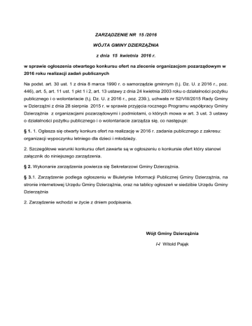 ZARZĄDZENIE NR 15 /2016 WÓJTA GMINY DZIERZĄŻNIA z dnia 15 kwietnia 2016 r. w sprawie ogłoszenia otwartego konkursu ofert na zlecenie organizacjom pozarządowym w 2016 roku realizacji zadań publicznych Na podst. art. 30 ust. 1 z dnia 8 marca 1990 r. o samorządzie gminnym (t.j. Dz. U. z 2016 r., poz. 446), art. 5, art. 11 ust. 1 pkt 1 i 2, art. 13 ustawy z dnia 24 kwietnia 2003 roku o działalności pożytku publicznego i o wolontariacie (t.j. Dz. U. z 2016 r., poz. 239.), uchwała nr 52/VIII/2015 Rady Gminy w Dzierzążni z dnia 28 sierpnia 2015 r. w sprawie przyjęcia rocznego Programu współpracy Gminy Dzierzążnia z organizacjami pozarządowymi i podmiotami, o których mowa w art. 3 ust. 3 ustawy o działalności pożytku publicznego i o wolontariacie zarządza się, co następuje: § 1. 1. Ogłasza się otwarty konkurs ofert na realizację w 2016 r. zadania publicznego z zakresu: organizacji wypoczynku letniego dla dzieci i młodzieży. 2. Szczegółowe warunki konkursu ofert zawarte są w ogłoszeniu o konkursie ofert który stanowi załącznik do niniejszego zarządzenia. § 2. Wykonanie zarządzenia powierza się Sekretarzowi Gminy Dzierzążnia. § 3.1. Zarządzenie podlega ogłoszeniu w Biuletynie Informacji Publicznej Gminy Dzierzążnia, na stronie internetowej Urzędu Gminy Dzierzążnia, oraz na tablicy ogłoszeń w siedzibie Urzędu Gminy Dzierzążnia 2. Zarządzenie wchodzi w życie z dniem podpisania. Wójt Gminy Dzierzążnia /-/ Witold Pająk Załącznik do zarządzenia Nr 15/206 z dnia 15 kwietnia 2016 roku Wójt Gminy Dzierzążnia ogłasza otwarty konkurs ofert na zlecenie organizacjom pozarządowym w 2016 roku realizacji zadań publicznych W oparciu o ustawę z dnia 24 kwietnia 2003 r. o działalności pożytku publicznego i o wolontariacie (t.j. Dz. U. z 2016 r., poz. 239 ze zm.) i uchwała NR 52/VIII/2015 Rady Gminy w Dzierzążni z dnia 28 sierpnia 2015 r w sprawie przyjęcia rocznego Programu współpracy Gminy Dzierzążnia z organizacjami pozarządowymi i podmiotami, o których mowa w art. 3 ust. 3 ustawy o działalności pożytku publicznego i o wolontariacie Wójt Gminy Dzierzążnia ogłasza konkurs ofert na zlecenie organizacjom pozarządowym w roku 2016 następujących zadań: I. Rodzaj zadania 1) organizacja wypoczynku letniego dla dzieci i młodzieży: z programem profilaktyki uzależnień Kwota przeznaczona na realizację zadania – 15 000,00 zł. Wysokość środków publicznych przeznaczonych na realizację zdania: Na realizacje zadań w roku 2016 są przeznaczone środki w kwocie 15 000,00 zł. II. Zasady przyznawania dotacji: Zasady przyznawania dotacji na realizację ww. zadań określają przepisy - ustawy z dnia 24 kwietnia 2003 r. o działalności pożytku publicznego i wolontariacie (t.j. Dz. U. z 2016 r., poz. 239) - ustawa z dnia 27 sierpnia 2009 r. o finansach publicznych (t.j. Dz. U. z 2013 r., poz. 885 z późn. zm.) 1) W konkursie mogą wziąć udział organizacje pozarządowe oraz podmioty wymienione w art. 3 ust. 3 ustawy o działalności pożytku publicznego i wolontariacie działające statutowo w obszarze wymienionych w pkt. I zadań, 2) Warunkiem ubiegania się o dofinansowanie lub finansowanie realizacji zadania publicznego przez oferentów jest złożenie formularza ofertowego, zgodnego ze wzorem określonym w Rozporządzeniu Ministra Pracy i Polityki Społecznej z dnia 15 grudnia 2010 r. w sprawie wzoru oferty i ramowego wzoru umowy dotyczących realizacji zadania publicznego oraz wzoru sprawozdania z wykonania tego zadania (Dz. U. z 2011 r., Nr 6 poz. 25). 3) Do oferty należy dołączyć wymagane załączniki: a) aktualny odpis z właściwego rejestru lub ewidencji (zgodny ze stanem faktycznym i prawnym), b) statut organizacji, c) tytuł prawny lub umowę dla obiektu niezbędnego do realizacji wspieranego zadania, d) sprawozdanie merytoryczne i finansowe za 2015 r. z działalności oferenta, 4) Kosztorys w ofercie musi być czytelny i logiczny. W kosztorysie należy szczegółowo wykazać koszty rodzajowe wraz z kosztami jednostkowymi planowanego zadania. Wydatki przedstawione w kosztorysie muszą znajdować pełne uzasadnienie w opisie zadania (np. liczba uczestników, itp.). 5) Kopie dokumentów dołączanych do oferty powinny być poświadczone za zgodność z oryginałem na każdej stronie. . 6) Wysokość przyznanej dotacji może być niższa niż wnioskowana w ofercie. 7) Złożenie oferty nie jest równoznaczne z przyznaniem dotacji. Dotacje na realizacje zadania otrzyma podmiot, którego oferta zostanie wybrana w postępowaniu konkursowym. III. Termin i warunki realizacji zadań 1) Zadanie publiczne, o których mowa w pkt. I obejmują działania na rzecz dzieci i młodzieży z Gminy Dzierzążnia realizowane od 30 czerwca 2016 r do 30 sierpnia 2016 roku. 2) Szczegółowe warunki lokalowe realizacji zadania: a) zakwaterowanie w pokojach 3-5 osobowych ( wyposażone w węzeł sanitarny umywalkę, w.c., natrysk) b) całodzienne wyżywienie ( śniadanie, obiad, podwieczorek, kolacja) c) przewóz dzieci z Dzierzążni do miejsca zakwaterowania i z powrotem d) zapewnienie odpowiednio wyszkolonej kadry e) minimum dwie wycieczki autokarowe do miejsc atrakcyjnych turystycznie ( np.: muzea, miejsca pamięci narodowej, zabytki itp.) Ośrodek wypoczynkowy winien być ogrodzony, wyposażony w stołówkę, plac zabaw, miejsce na zorganizowanie ogniska. 3) Rozpoczęcie realizacji zadania może nastąpić nie wcześniej niż w dniu zawarcia umowy, o której mowa w ust. 2. Szczegółowy termin i warunki realizacji poszczególnych zadań wynikać będą z zawartych umów. 4) Warunki realizacji zadań określać będzie umowa wg wzoru określonego w Rozporządzeniu Ministra Pracy i Polityki Społecznej z dnia 15 grudnia 2010 r. w sprawie wzoru oferty i ramowego wzoru umowy dotyczących realizacji zadania publicznego oraz wzoru sprawozdania z wykonania tego zadania (Dz. U. z 2011 r., Nr 6 poz. 25). IV. Tryb i kryteria stosowane p