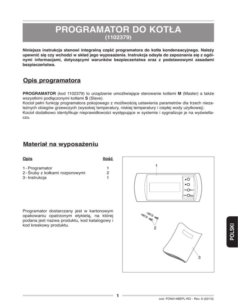 PROGRAMATOR DO KOTŁA (1102379) Niniejsza instrukcja stanowi integralną część programatora do kotła kondensacyjnego. Należy upewnić się czy wchodzi w skład jego wyposażenia. Instrukcja odsyła do zapoznania się z ogólnymi informacjami, dotyczącymi warunków bezpieczeństwa oraz z podstawowymi zasadami bezpieczeństwa. Opis programatora PROGRAMATOR (kod 1102379) to urządzenie umożliwiające sterowanie kotłami M (Master) a także wszystkimi podłączonymi kotłami S (Slave). Kocioł pełni funkcję programatora pokojowego z możliwością ustawienia parametrów dla trzech niezależnych obiegów grzewczych (wysokiej temperatury, niskiej temperatury i ciepłej wody użytkowej). Kocioł dodatkowo identyfikuje nieprawidłowości występujące w systemie i sygnalizuje je na wyświetlaczu. Materiał na wyposażeniu 1-Programator 2-Śruby z kołkami rozporowymi 3-Instrukcja Ilość 1 1 2 1 Programator dostarczany jest w kartonowym opakowaniu opatrzonym etykietą, na której podana jest nazwa produktu, kod katalogowy i kod kreskowy produktu. Polski Opis 2 3 1 cod. FON014BEPL-RO - Rev. 6 (02/13) Spis treści OPIS PROGRAMATORA str. 41 MATERIAŁ NA WYPOSAŻENIU str. 41 SPIS TREŚCI str. 42 INSTALACJA - Podłączenia elektryczne str. 43 “ 44 PROGRAMATOR - Ogólne informacje na wyświetlaczu str. 46 “ 46 ZASTOSOWANIE PROGRAMATORA - Informacje ogólne - Informacja o błędach - Menu główne -Tryb “CONFIGURATION” (Konfiguracja) - Ustawianie języka - Ustawianie dnia tygodnia, daty i godziny - Ustawianie korekty temperatury otoczenia - Tryb “INSTALLATION” (Instalacja) - Kontrola obiegów grzewczych - Parametry - Automatyczna komutacja Lato/Zima - Pełna lista parametrów - Tryb “Program” (Programowanie czasowe): - Programowanie czasowe (dzień-godzina) - Programowanie czasowe i programowanie temperatury wody - Obieg centralnego ogrzewania – zmniejszanie - Obieg ciepłej wody użytkowej – funkcja zapobiegająca powstawaniu bakterii legionelli - Tryb “INFORMATION” (Informacje): - Informacje dotyczące funkcjonowania systemu - Informacje dotyczące instalacji: 3 obiegi grzewcze oraz dodatkowych stref mieszanych (1/5) - Informacje dotyczące instalacji: temperatura zewnętrzna i temperatura pokojowa (2/5) - Informacje dotyczące instalacji: różne (3/5) - Informacje dotyczące instalacji: pompy (4/5) - Informacje dotyczące instalacji: czas działania instalacji (5/5) - Informacje dotyczące nieprawidłowości - Lista kodów błędów master – slave str. 47 “ 47 “ 48 “ 48 2 “ 48 “ 48 “ 49 “ “ “ “ 49 50 51 51 “ 53 “ 53 “ 54 “ 54 “ 55 “ 55 “ 56 “ 56 “ 56 “ 57 “ 57 “ 58 Instalowanie Programator powinien być zainstalowany przez Autoryzowany Serwis. W celu wykonania prawidłowej instalacji należy pamiętać, że: -programator powinien być zainstalowany na ścianie wewnętrznej, przez którą nie przechodzą rury -by umożliwić dogodny odczyt wyświetlacza, urządzenie powinno być zainstalowane na wysokości 1,5 m od poziomu posadzki. -Ważne, by urządzenie było chronione przed bezpośrednim wpływem ciepła jak i przeciągów, których wpływ może rzutować na prawidłowe działanie. W celu zamocowania programatora na ścianie należy wykonać następujące czynności: B -Odłączyć panel sterowania (A) od podstawy (B) poprzez naciśnięcie plastikowego zaczepu (C). -Użyć podstawę (B) do zaznaczenia na ścianie punktów mocowania -Wykonać otwory w ścianie (otwory Ø 5 mm) A -Przez otwór (E) przewlec kabel trójbiegunowy (D) o przekroju między 0,5 a 1 mm2 (nie będący na wyposażeniu) w celu wykonania podłączenia programatora do kotła. C bUpewnić się czy powierzchnia montażowa ściany jest płaska, co gwarantuje prawidłowe funkcjonowanie programatora. -Kabel wychodzący z zacisków “15- 16-17” Karty Master w kotle należy podłączyć do zacisków “BUS-Com-24V” kostki (F) w programatorze. Naklejka wskazuje prawidłowe położenie okablowania. F -Przymocować podstawę (B) do ściany przy pomocy śrub i kołków rozporowych (G) będących na wyposażeniu. D E G Polski B -Złożyć z powrotem panel sterowania (A) z podstawą (B) bMaksymalna odległość połączenia pomiędzy panelem sterowania a kotłem wynosi 100 m. bKabel łączący panel sterowania i kocioł nie powinien mieć złączek. Jeżeli są konieczne, należy je uszczelnić i odpowiednio zabezpieczyć. bEwentualne przepusty kabla łączącego powinny być oddzielone od kabli pod napięciem (230 Volt). 3 PODŁĄCZENIA ELEKTRYCZNE Przed wykonaniem jakiejkolwiek czynności należy odłączyć zasilanie elektryczne kotła wyłączając wyłącznik główny instalacji oraz wyłącznik główny urządzenia. W celu wykonania podłączeń elektrycznych: -Odkręcić śruby (I) mocujące panel przedni kotła (L). L -Podstawę panelu (L) pociągnąć najpierw ku sobie, a następnie w górę i zdjąć. I M -Opuścić panel kontrolny (M) (o 90°) i wyjąć cztery śruby (N) N -Zidentyfikować kostkę zaciskową (O) i wykonać połączenia, jak przedstawiono na schemacie (na stronie 45). O Po wykonaniu podłączeń zamontować z powrotem komponenty wykonując opisane czynności w odwrotnej kolejności. 4 KOSTKA ZACISKOWA WEWNĄTRZ PANELU STEROWANIA MASTER 28 PB (*) sonda NTC obigu 1 wysokiej temperatury Pompa obiegowa ciepłej wody użytkowej 27 26 PZ1 (*) Pompa obiegowa strefy wysokiej temperatury 25 24 PZ2 (*) Pompa obiegowa lub pierścieniowa Pbas (*) Pompa obiegowa strefy 23 niskiej temperatury 22 VM (*) 21 SZ1 Czujnik zasobnika SB Sonda NTC strefy 2 niskiej temperatury SZ2 Sonda zewnętrzna SE Zawór mieszający 20 19 1 2 3 4 5 6 7 8 Styk do sygnalizacji alarmu 18 TA2 Termostat środowiskowy strefy niskiej temperatury TA1 Termostat środowiskowy strefy wysokiej temperatury BUS Com 24V IA Wejście analogowe 0-10V 17 16 15 14 13 12 11 10 9 17-24V 15-BUS 16-Com Polski (*) 230V~50Hz KOSTKA ZACISKOWA WEWNĄTRZ PROGRAMATORA 5 PROGRAMATOR Po podłącze