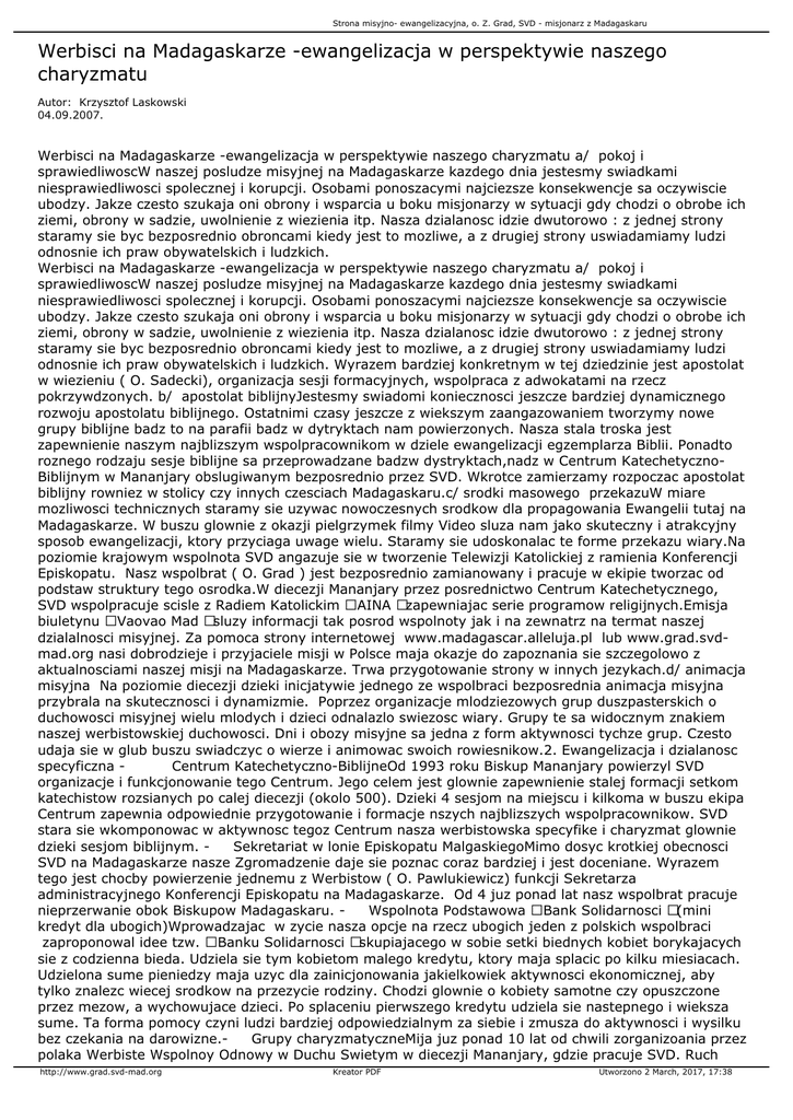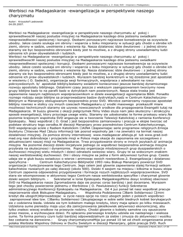 Strona misyjno- ewangelizacyjna, o. Z. Grad, SVD - misjonarz z Madagaskaru Werbisci na Madagaskarze -ewangelizacja w perspektywie naszego charyzmatu Autor: Krzysztof Laskowski 04.09.2007. Werbisci na Madagaskarze -ewangelizacja w perspektywie naszego charyzmatu a/ pokoj i sprawiedliwoscW naszej posludze misyjnej na Madagaskarze kazdego dnia jestesmy swiadkami niesprawiedliwosci spolecznej i korupcji. Osobami ponoszacymi najciezsze konsekwencje sa oczywiscie ubodzy. Jakze czesto szukaja oni obrony i wsparcia u boku misjonarzy w sytuacji gdy chodzi o obrobe ich ziemi, obrony w sadzie, uwolnienie z wiezienia itp. Nasza dzialanosc idzie dwutorowo : z jednej strony staramy sie byc bezposrednio obroncami kiedy jest to mozliwe, a z drugiej strony uswiadamiamy ludzi odnosnie ich praw obywatelskich i ludzkich. Werbisci na Madagaskarze -ewangelizacja w perspektywie naszego charyzmatu a/ pokoj i sprawiedliwoscW naszej posludze misyjnej na Madagaskarze kazdego dnia jestesmy swiadkami niesprawiedliwosci spolecznej i korupcji. Osobami ponoszacymi najciezsze konsekwencje sa oczywiscie ubodzy. Jakze czesto szukaja oni obrony i wsparcia u boku misjonarzy w sytuacji gdy chodzi o obrobe ich ziemi, obrony w sadzie, uwolnienie z wiezienia itp. Nasza dzialanosc idzie dwutorowo : z jednej strony staramy sie byc bezposrednio obroncami kiedy jest to mozliwe, a z drugiej strony uswiadamiamy ludzi odnosnie ich praw obywatelskich i ludzkich. Wyrazem bardziej konkretnym w tej dziedzinie jest apostolat w wiezieniu ( O. Sadecki), organizacja sesji formacyjnych, wspolpraca z adwokatami na rzecz pokrzywdzonych. b/ apostolat biblijnyJestesmy swiadomi koniecznosci jeszcze bardziej dynamicznego rozwoju apostolatu biblijnego. Ostatnimi czasy jeszcze z wiekszym zaangazowaniem tworzymy nowe grupy biblijne badz to na parafii badz w dytryktach nam powierzonych. Nasza stala troska jest zapewnienie naszym najblizszym wspolpracownikom w dziele ewangelizacji egzemplarza Biblii. Ponadto roznego rodzaju sesje biblijne sa przeprowadzane badzw dystryktach,nadz w Centrum KatechetycznoBiblijnym w Mananjary obslugiwanym bezposrednio przez SVD. Wkrotce zamierzamy rozpoczac apostolat biblijny rowniez w stolicy czy innych czesciach Madagaskaru.c/ srodki masowego przekazuW miare mozliwosci technicznych staramy sie uzywac nowoczesnych srodkow dla propagowania Ewangelii tutaj na Madagaskarze. W buszu glownie z okazji pielgrzymek filmy Video sluza nam jako skuteczny i atrakcyjny sposob ewangelizacji, ktory przyciaga uwage wielu. Staramy sie udoskonalac te forme przekazu wiary.Na poziomie krajowym wspolnota SVD angazuje sie w tworzenie Telewizji Katolickiej z ramienia Konferencji Episkopatu. Nasz wspolbrat ( O. Grad ) jest bezposrednio zamianowany i pracuje w ekipie tworzac od podstaw struktury tego osrodka.W diecezji Mananjary przez posrednictwo Centrum Katechetycznego, SVD wspolpracuje scisle z Radiem Katolickim « AINA » zapewniajac serie programow religijnych.Emisja biuletynu « Vaovao Mad » sluzy informacji tak posrod wspolnoty jak i na zewnatrz na termat naszej dzialalnosci misyjnej. Za pomoca strony internetowej www.madagascar.alleluja.pl lub www.grad.svdmad.org nasi dobrodzieje i przyjaciele misji w Polsce maja okazje do zapoznania sie szczegolowo z aktualnosciami naszej misji na Madagaskarze. Trwa przygotowanie strony w innych jezykach.d/ animacja misyjna Na poziomie diecezji dzieki inicjatywie jednego ze wspolbraci bezposrednia animacja misyjna przybrala na skutecznosci i dynamizmie. Poprzez organizacje mlodziezowych grup duszpasterskich o duchowosci misyjnej wielu mlodych i dzieci odnalazlo swiezosc wiary. Grupy te sa widocznym znakiem naszej werbistowskiej duchowosci. Dni i obozy misyjne sa jedna z form aktywnosci tychze grup. Czesto udaja sie w glub buszu swiadczyc o wierze i animowac swoich rowiesnikow.2. Ewangelizacja i dzialanosc specyficzna Centrum Katechetyczno-BiblijneOd 1993 roku Biskup Mananjary powierzyl SVD organizacje i funkcjonowanie tego Centrum. Jego celem jest glownie zapewnienie stalej formacji setkom katechistow rozsianych po calej diecezji (okolo 500). Dzieki 4 sesjom na miejscu i kilkoma w buszu ekipa Centrum zapewnia odpowiednie przygotowanie i formacje nszych najblizszych wspolpracownikow. SVD stara sie wkomponowac w aktywnosc tegoz Centrum nasza werbistowska specyfike i charyzmat glownie dzieki sesjom biblijnym. Sekretariat w lonie Episkopatu MalgaskiegoMimo dosyc krotkiej obecnosci SVD na Madagaskarze nasze Zgromadzenie daje sie poznac coraz bardziej i jest doceniane. Wyrazem tego jest chocby powierzenie jednemu z Werbistow ( O. Pawlukiewicz) funkcji Sekretarza administracyjnego Konferencji Episkopatu na Madagaskarze. Od 4 juz ponad lat nasz wspolbrat pracuje nieprzerwanie obok Biskupow Madagaskaru. Wspolnota Podstawowa « Bank Solidarnosci » (mini kredyt dla ubogich)Wprowadzajac w zycie nasza opcje na rzecz ubogich jeden z polskich wspolbraci zaproponowal idee tzw. « Banku Solidarnosci » skupiajacego w sobie setki biednych kobiet borykajacych sie z codzienna bieda. Udziela sie tym kobietom malego kredytu, ktory maja splacic po kilku miesiacach. Udzielona sume pieniedzy maja uzyc dla zainicjonowania jakielkowiek aktywnosci ekonomicznej, aby tylko znalezc wiecej srodkow na przezycie rodziny. Chodzi glownie o kobiety samotne czy opuszczone przez mezow, a wychowujace dzieci. Po splaceniu pierwszego kredytu udziela sie nastepnego i wieksza sume. Ta forma pomocy czyni ludzi bardziej odpowiedzialnym za siebie i zmusza do aktywnosci i wysilku bez czekania na darowizne.Grupy charyzmatyczneMija juz ponad 10 lat od chwili zorganizoania przez polaka Werbiste Wspolnoy Odnowy w Duchu Swietym w diecezji Mananjary, gdzie pracuje SVD. Ruch http://www.grad.svd-mad.org Kreator PDF Utworzono 2 March, 2017, 17:38 Strona misyjno- ewangelizacyjna, o. Z. Grad, SVD - misjonarz z Madagaskaru zostal wprowadzony z mysla uzycia go jako instrumentu pierwszej ewangelizacji. Na dzien dzisiejszy wspolnoty Odnowy dzielnie towarzyszysza mi