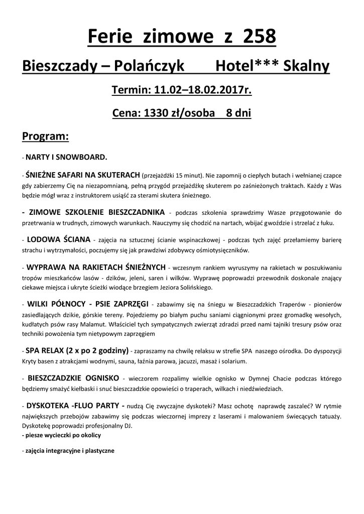 Ferie zimowe z 258 Bieszczady – Polańczyk Hotel*** Skalny Termin: 11.02–18.02.2017r. Cena: 1330 zł/osoba 8 dni Program: - NARTY I SNOWBOARD. - ŚNIEŻNE SAFARI NA SKUTERACH (przejażdżki 15 minut). Nie zapomnij o ciepłych butach i wełnianej czapce gdy zabierzemy Cię na niezapomnianą, pełną przygód przejażdżkę skuterem po zaśnieżonych traktach. Każdy z Was będzie mógł wraz z instruktorem usiąść za sterami skutera śnieżnego. - ZIMOWE SZKOLENIE BIESZCZADNIKA - podczas szkolenia sprawdzimy Wasze przygotowanie do przetrwania w trudnych, zimowych warunkach. Nauczymy się chodzić na nartach, wbijać gwoździe i strzelać z łuku. - LODOWA ŚCIANA - zajęcia na sztucznej ścianie wspinaczkowej - podczas tych zajęć przełamiemy barierę strachu i wytrzymałości, poczujemy się jak prawdziwi zdobywcy ośmiotysięczników. - WYPRAWA NA RAKIETACH ŚNIEŻNYCH - wczesnym rankiem wyruszymy na rakietach w poszukiwaniu tropów mieszkańców lasów - dzików, jeleni, saren i wilków. Wyprawę poprowadzi przewodnik doskonale znający ciekawe miejsca i ukryte ścieżki wiodące brzegiem Jeziora Solińskiego. - WILKI PÓŁNOCY - PSIE ZAPRZĘGI - zabawimy się na śniegu w Bieszczadzkich Traperów - pionierów zasiedlających dzikie, górskie tereny. Pojedziemy po białym puchu saniami ciągnionymi przez gromadkę wesołych, kudłatych psów rasy Malamut. Właściciel tych sympatycznych zwierząt zdradzi przed nami tajniki tresury psów oraz techniki powożenia tym nietypowym zaprzęgiem - SPA RELAX (2 x po 2 godziny) - zapraszamy na chwilę relaksu w strefie SPA naszego ośrodka. Do dyspozycji Kryty basen z atrakcjami wodnymi, sauna, łaźnia parowa, jacuzzi, masaż i solarium. - BIESZCZADZKIE OGNISKO - wieczorem rozpalimy wielkie ognisko w Dymnej Chacie podczas którego będziemy smażyć kiełbaski i snuć bieszczadzkie opowieści o traperach, wilkach i niedźwiedziach. - DYSKOTEKA -FLUO PARTY - nudzą Cię zwyczajne dyskoteki? Masz ochotę naprawdę zaszaleć? W rytmie największych przebojów zabawimy się podczas wieczornej imprezy z laserami i malowaniem świecących tatuaży. Dyskotekę poprowadzi profesjonalny DJ. - piesze wycieczki po okolicy - zajęcia integracyjne i plastyczne