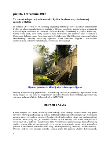 piątek, 4 września 2015 73. rocznica deportacji rabczańskich Żydów do obozu natychmiastowej zagłady w Bełżcu 30 sierpnia 2015 roku, w 73. rocznicę tragicznej deportacji około sześciuset rabczańskich Żydów do obozu natychmiastowej zagłady w Bełżcu, uczciliśmy pamięć o tym wydarzeniu spacerem spod amfiteatru na cmentarz - Miejsce Pamięci Narodowej przy ulicy Słonecznej. Wśród wielu osób, które brały udział w tym wydarzeniu nie zabrakło także ocalałych z Holocaustu Rabczan - pani Anny Janowskiej-Ciońćka, pani Marii Kruczała oraz pana Stefana Dubrowskiego. Oprawę muzyczną zapewniła Alina Jabłońska. Zdjęcia z uroczystości dostarczyli Jan Ceklarz i Hubert Rapta. Serdecznie dziękujemy! Spacer pamięci - kliknij aby zobaczyć zdjęcia Poniżej przedstawiamy poprawiony i uzupełniony artykuł przybliżający wydarzenia, które miały miejsce 73 lata temu pt. "Deportacja" autorstwa Narcyza Listkowskiego, opublikowany rok temu na łamach Wieści Rabczańskich nr 6(22)/2014. DEPORTACJA Koniec sierpnia 2015 roku, ostatni tydzień wakacji, ulice naszego miasta Rabki-Zdrój pełne turystów, którzy przechadzają się pięknie zadbanymi alejkami parku zdrojowego. Kuracjusze sączący napoje w kawiarni parkowej, bawiące się dzieci na placu zabaw pod czujnym okiem rodziców. Kończy się lato, już wkrótce zacznie się rok szkolny - dla wielu młodych ludzi nowe wyzwania, nadzieje i oczekiwania. Gdy 76 lat temu do granic naszego kraju zbliżali się naziści, pewnie nikt nie przypuszczał, że ta wojna bezpowrotnie ograbi wiele przyszłych pokoleń z możliwości poznania Polski innej, wielowyznaniowej, barwnej i wielokulturowej. Decyzję podjęto bez naszego udziału. Dzisiaj mało kto pamięta Żydów Rabczańskich, 1 naszych dawnych sąsiadów, którzy współtworzyli nasze miasto, mieli wpływ na życie towarzyskie i kulturalne. Pozostało jednak trochę śladów. Zabudowa rynku, parę budynków na zboczu Gilówki, schody do nieistniejącej synagogi oraz kilka willi w górnej Rabce niemych świadków tamtych dni. Są jeszcze nasi krewni i znajomi, ostatnie osoby, które dają świadectwo istnienia społeczności Żydowskiej Rabki. Jest ich jednak coraz mniej. Jestem przekonany, że powinniśmy wysłuchać ich i przechować historię dla potomnych, dla naszych dzieci i wnuków. Zróbmy to! Musimy pamiętać, aby ta ofiara niewinnie pomordowanych Rabczan nie była zmarnowana, a okazała się lekcją dla każdego. Tylko wtedy pojmiemy czym jest wolność dzisiaj, wolność, której czasem nie doceniamy, a tamtym pokoleniom została zabrana. Chciałbym przywołać z otchłani zapomnienia smutną rocznicę z historii naszego miasta, ostatnie dni sierpnia 1942 roku. Rocznicę, która szczególnie była dramatyczna dla Podhalańskich i Rabczańskich Żydów. W tym roku minęło 73 lata od czasu deportacji Żydów z Rabki oraz Podhala przez nazistów do obozu zagłady w Bełżcu. Kilka faktów z historii. W przedwojennej Rabce żyła około 450-cio osobowa diaspora Żydowska o różnym przekroju społecznym. Byli ludzie prowadzący sklepy - głównie w rynku, lekarze, właściciele pensjonatów i składów budowlanych, tartaków, a także rzemieślnicy wolnych zawodów. Ustanowiony był Kahał, na zboczu Gilówki stała drewniana synagoga. Była rytualna rzeźnia i mykwa. Co trzeci Żyd mieszkał w rynku i na zboczu Gilówki. Do 1939 roku społeczność rozwijała się. Ponad stuletnia obecność Starozakonnych, sprzyjała rozwojowi Rabki. Rabczańska Bożnica znajdowała się nad rzeką Rabą, w dzielnicy zamieszkiwanej przez społeczność żydowską. Fot. ze zbiorów Józefa Szlagi 3 września 1939 roku naziści zajęli Rabkę. Pierwsze lata okupacji był to okrutny czas dla wszystkich - brak nadziei, wszechobecny terror na ulicach miasta, utracona wolność. Restrykcje dotykały coraz bardziej Żydów, którzy zostali w sposób szczególny potraktowani przez nazistów. Społeczność ta od początku okupacji była bezwzględnie prześladowana, okradana, przymuszana do niewolniczej pracy, maltretowana i mordowana - przestawała stopniowo istnieć. Bestialska machina pod nazwą Narodowego Socjalizmu reprezentowana przez katów spod sztandarów Austrii, Niemiec czy Rekrutów Ukraińskich, mających dowództwo w willi "Tereska" w Rabce, nie robiła wyjątków dla kobiet starców czy dzieci. Świat miał być wolny od Żydów. Blisko 450-cio osobowa społeczność żydowska naszych 2 dawnych sąsiadów plus około 300-tu Żydów z różnych miejsc, którzy znaleźli się w Rabce by szukać wybawienia, znalazło się w pułapce. Podczas trzech lat terroru prawie każda żydowska rodzina kogoś straciła. Większe egzekucje w Rabce trwały od wiosny 1942 roku. Rabka stała się ostatnim przystankiem dla Żydów ze Starego Sącza. Ludzie byli wyłapywani na ulicach, wyciągani z domów, nie mieli gdzie uciec czy schronić się - tracili nadzieję, a za jakąkolwiek pomoc Żydom groziła kara śmierci. Nie mieli możliwości jako społeczność spełnić zachcianek okupanta, oddali wszystko co miało jakąkolwiek wartość, pozostało tylko życie. „Schody Rosenbauma” przed willą „Tereska”, w czasie okupacji mieszczącej Szkołę Dowódców Policji Bezpieczeństwa i Służby Bezpieczeństwa. Schody wykonano z pomników marmurowych ze zlikwidowanych w okolicy cmentarzy żydowskich. Nadeszła słoneczna niedziela 30 sierpienia 1942 roku. Dzień deportacji. Wszystko zostało zaplanowane i przygotowane z niemiecką dokładnością i precyzją. Zgromadzone dzień wcześniej posiłki formacji SS weszły do użycia. O świcie Żydzi zostali wypędzeni ze swoich domów i mieszkań. Mają opuścić je na zawsze. Zabrali podręczny dobytek - resztkę nędznego mienia. Niedopita kawa, herbata została na stole - nie ma czasu, wszystko miało przebiegać sprawnie. Całe rodziny, mężczyzn, kobiety, starców i dzieci - wszystkich odprowadzono na dobrze strzeżony plac prz