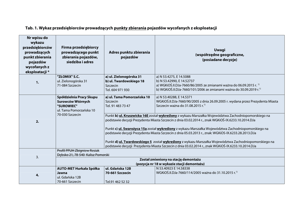 Tab. 1. Wykaz przedsiębiorców prowadzących punkty zbierania pojazdów wycofanych z eksploatacji Nr wpisu do wykazu przedsiębiorców prowadzących punkt zbierania pojazdów wycofanych z eksploatacji * 1. Firma przedsiębiorcy prowadzącego punkt zbierania pojazdów, siedziba i adres Adres punktu zbierania pojazdów Uwagi (współrzędne geograficzne, (posiadane decyzje) "ZŁOMIX" S.C. ul. Zielonogórska 31 71-084 Szczecin a) ul. Zielonogórska 31 b) ul. Twardowskiego 18 Szczecin Tel. 604 971 930 a) N 53.4275, E 14.5088 b) N 53.42990, E 14.52737 a) WGKiOŚ.II.DJa-7660/86/2005 ze zmianami ważna do 06.09.2015 r. 1) b) WGKiOŚ.II.DJa-7660/101/2006 ze zmianami ważna do 30.09.2019 r.1) Spółdzielnia Pracy Skupu Surowców Wtórnych "SUROWIEC" ul. Tama Pomorzańska 10 70-030 Szczecin a) ul. Tama Pomorzańska 10 Szczecin Tel. 91 483 73 47 a) N 53.40288, E 14.5371 WGKiOŚ.II.DJa-7660/90/2005 z dnia 26.09.2005 r. wydana przez Prezydenta Miasta Szczecin ważna do 31.08.2015 r.1) 2. Punkt b) ul. Kruszwicka 16E został wykreślony z wykazu Marszałka Województwa Zachodniopomorskiego na podstawie decyzji Prezydenta Miasta Szczecin z dnia 03.02.2014 r., znak WGKiOŚ-IX.6233.10.2014.DJa Punkt c) ul. Swarożyca 15a został wykreślony z wykazu Marszałka Województwa Zachodniopomorskiego na podstawie decyzji Prezydenta Miasta Szczecin z dnia 05.03.2013 r., znak: WGKiOS-IX.6233.28.2013.DJa Punkt d) ul. Twardowskiego 5 został wykreślony z wykazu Marszałka Województwa Zachodniopomorskiego na podstawie decyzji Prezydenta Miasta Szczecin z dnia 03.02.2014 r., znak WGKiOŚ-IX.6233.10.2014.DJa 3. 4. Profil PPUH Zbigniew Resiak Dębsko 21, 78-540 Kalisz Pomorski AUTO-MET Hurkała Spółka Jawna ul. Gdańska 12B 70-661 Szczecin ul. Gdańska 12B 70-661 Szczecin Tel.91 462 52 32 Został zmieniony na stację demontażu (pozycja nr 18 w wykazie stacji demontażu) N 53.40923 E 14.58338 WGKiOŚ.II.DJa-7660/114/2005 ważna do 31.10.2015 r.1) 5. 6. 7. 8. 9. 10. 11. 12. Andrzej Żywot ul. Jana Pawła II 34B/1, 74-202 Bielice AGRI TRADING Sp. z o.o. Kłos 28 76-004 Sianów Firma Handlowo-Usługowa "FIDLER" ul. 5 Marca 30, 78320 Połczyn Zdrój TOM Sp. z o.o. ul. Lipowa 16 71-734 Szczecin Sprzedaż hurtowa odpadów i złomu Magdalena Żywot ul. Spokojna 65 74-202 Bielice ul. Spokojna 65, 74-202 Bielice OŚLiR-Ma-7660/92/2005 ważna do 01.11.2008 r. Zakończenie działalności 30.11.2008 r. Kłos 28, 76-004 Sianów OŚ.II.7623-4/2/06 ważna do 28.11.2016 r. Zakończenie działalności 28.06.2010 r. ul. Kolejowa (dawna rampa OŚ/7645/I/07/2006 ważna do 31.03.2017 r. kolejowa), 78-320 Połczyn Zdrój Zakończenie działalności 30.06.2008 r. N 53.38911 ul. Pomorska 112 E 14.68313 70-812 Szczecin WGKiOŚ.IV.LR-7660/14/2007 ważna do 31.01.2017 r.1) Tel: 91 469 2170 wew. 502 ul. Spokojna 65, OŚLiR-MA-7660/72/2008 ważna do 08.12.2018 r. 74-202 Bielice Tel. 507 523 419 Zakończenie działalności 01.10.2013 r. Punkt wykreślony z rejestru Marszałka Województwa Zachodniopomorskiego w dniu 23.01.2014 r. na podstawie decyzji Starosty Pyrzyckiego z dnia 01.10.2013 r., znak OŚLiR.6233.9.2.2013.RM AUTO ZŁOM – KUBA Ul. Kolejowa (plac przy byłej OŚ/ 7645/I/20/08/09 ważna do 18.09.2018 r. Agnieszka Nowocień, bocznicy kolejowej), Połczyn Pl. Orła Białego 1/6, 78-320 Zdrój Połczyn Zdrój Zakończenie działalności 31.12.2012 r. (decyzja Starosty Świdwińskiego OŚ.6233.1.2012) N 52.739877 „ZŁOMIX” Skup złomu i Ul. Tartaczna 2, E 14.717342 metali kolorowych 74-400 Dębno BOŚ.6223.10.2011.RL ważna do 04.05.2021 r.1) ul. Tartaczna 2, Podmiot na podstawie ww. decyzji przekazuje zebrane pojazdy do stacji demontażu 74-400 Dębno w woj. lubuskim: PW GEOMET Piotr Borowski, ul. Białkowska 1, 69-108 Cybinka N 53.414955 ALMEX Sp. z o.o. Ul. Ks. St. Kujota 1-4, E 14.578553 ul. Ks. St. Kujota 1-4, 70-605 Szczecin WGKiOŚ-IX.6233.81.2012.DJa ważna do 31.08.2022 r.1) 70-605 Szczecin Podmiot na podstawie ww. decyzji przekazuje zebrane pojazdy do stacji demontażu w woj. lubuskim: ALMEX Recykling Sp. z o.o. ul. Podmiejska 15e, 66-407 Gorzów Wielkopolskiºº Tab. 2. Wykaz przedsiębiorców prowadzących stacje demontażu pojazdów wycofanych z eksploatacji Nr wpisu do wykazu przedsiębiorców prowadzących stacje demontażu pojazdów wycofanych z eksploatacji * 1. 2. 3. Firma przedsiębiorcy prowadzącego stację demontażu, siedziba i adres Adres stacji demontażu pojazdów Zakład Kasacji Pojazdów Iwona Dąbrowska ul. Krzywoustego 29 72-100 Goleniów ul. Krzywoustego 29 72-100 Goleniów AUTO-CZĘŚCI Zakład Kasacji Pojazdów S.C. ul. Ks. Stanisława Ruta 7/4 72-300 Gryfice Gryfice, Osada Zdrój 9 (działka nr 53/7 obręb Brodniki) "Andrzejczuk" Sp. z o.o. ul. Szpitalna 7 78-100 Kołobrzeg ul. Kwiatów Polskich 8 78-100 Kołobrzeg – Zieleniewo Tel. 91 407 41 69 Tel. 91 384 66 11 Tel. 94 354 26 33, 94 353 00 74 Uwagi (współrzędne geograficzne, posiadane decyzje) N 53º 32’37.47” E 14º 52’11.03” Decyzja Marszałka Województwa Zachodniopomorskiego z dnia 11.09.2014 r. znak WOŚ.II.7243.11.4.2014.AS, ważna do dnia 11.09.2024 r. N 53º 54.223’ E 15º 12.579’ Decyzja Marszałka Województwa Zachodniopomorskiego z dnia 11.12.2013 r. znak WOŚ-II.7243.7.4.2013.AS, ważna do dnia 11.12.2023 r. Decyzja Marszałka Województwa Zachodniopomorskiego z dnia 10.07.2014 r. znak WOŚ.II.7243.8.3.2014.AS stwierdzająca wygaśnięcie decyzji Wojewody Zachodniopomorskiego z dnia 20.07.2005 r., znak KSR-Ś-5-6620/24-2/05, zmienionej decyzją Wojewody Zachodniopomorskiego z dnia 22.10.2007 r., znak K-SR-Ś-56620/20-2/07 oraz decyzją Regionalnego Dyrektora Ochrony Środowiska w Szczecinie z dnia 30.01.2009 r., znak RDOŚ-32-WSTI-66201-2/09/mc, udzielającej pozwolenia na wytwarzanie odpadów, z uwzględnieniem wymagań dla zezwolenia na prowadzenie działalności w zakresie odzysku, zbierania i transportu odpadów. STACJA ZAKOŃCZYŁA DZIAŁALNOŚĆ Z DNIEM 30.05.2014 r. 4. 5. 6. "U JANA" Auto Komis Warsztat Sprzeda