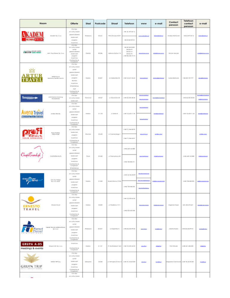 Naam Offerte Stad Postcode Straat Warszawa 02-661 Wita Stwosza 44/37 Telefoon www e-mail Contact persoon Telefoon contact persoon e-mail www.akadem.pl [email protected] Andrzej Malinowski +48 22 875 04 16 [email protected] www.activtours.com.pl [email protected] Michał Jasiczek www.arturtravel.pl [email protected] Łukasz Barłowski City trips en cultuur reizen Akadem Sp. Z o.o. gespecialiseerd +48 22 875 04 16 bedevaart jongeren +48 22 825 89 53 Incentives City trips en cultuur reizen +48 58 344-38-80 actief 344-38-79 gespecialiseerd Aktiv Tours Reisen Sp. Z o.o. bedevaart 345-05-15 Gdańsk 80-286 Jaśkowa Dolina 114 jongeren 344-06-70 [email protected] (+48 58) 520-19-13 Incentives Conferenties & Congressen City trips en cultuur reizen actief gespecialiseerd bedevaart ARTUR Travel Barłowscy Spółka Jawna jongeren Kraków 30-837 Ul. Aleksandry 30 (+48 12) 651-06-63 Katowice 40-527 ul. Gawronów 20 (+48 32) 205-38-30 . +48 602-109-777 [email protected] Business Incentives SPA&Wellness Golf Conferenties & Congressen City trips AVE Polonia Incoming Touroperator en cultuur reizen www.ave.turystyka.pl [email protected] (+48 32) 205-38-30 [email protected] www.ave-polonia.eu [email protected] bedevaart City trips en cultuur reizen www.avenatravel.pl actief gespecialiseerd AVENA TRAVEL bedevaart Kraków 31-153 ul. Szlak 65 (+48 12) 633-11-34 (+48 12) 633-11-34 [email protected] [email protected] jongeren www.go2poland.pl Incentives Conferenties & Congressen City trips (+48 71) 344-58-99 en cultuur reizen Biuro Podróży PROFI-TOUR bedevaart jongeren Wrocław 53-650 ul. Czarnieckiego 1 Incentives www.profi-tour.pl [email protected] [email protected] www.chopintravel.pl [email protected] (+48) 668-165-888 [email protected] [email protected] (+48) 728-448-205 [email protected] (+48 71) 344 42 81 Conferenties & Congressen City trips en cultuur reizen (+48) 668-165-888 actief gespecialiseerd CHOPINTRAVEL.PL bedevaart Płock 09-400 ul. Przemysłowa 20 jongeren Incentives (+48) 728-486-311 Conferenties & Congressen SPA&Wellness City trips en cultuur reizen www.discovercracow.eu . (+48 12) 346-38-99 actief City Tour Polska Sp. z o.o. Sp.K. gespecialiseerd bedevaart Kraków 31-042 www.cracowsightseeing.eu Rynek Główny 7/10b jongeren (+48) 728-448-205 Incentives www.transferpoland.eu Conferenties & Congressen City trips en cultuur reizen (+48 12) 633-65-56 actief gespecialiseerd Ernesto Travel bedevaart Kraków 30-009 ul. Friedleina 17/11 www.ernesto-travel.pl [email protected] Dagmara Trojan +48 605-670-567 [email protected] jongeren (+48) 502-535-458 Incentives Conferenties & Congressen City trips en cultuur reizen actief FURNEL TRAVEL INTERNATIONAL Sp. z o.o. gespecialiseerd bedevaart Warszawa 00-367 ul. Kopernika 3 (+48 22) 244-99-00 www.furnel.pl [email protected] Jolanta Kosiec (+48 22) 244-99-31 [email protected] Kraków 31-101 Pl. Na Groblach 14/2 (+48 12) 429-62-23 www.a05.pl [email protected] Piotr Wilczek (+48) 601-428-400 [email protected] Zakopane 34-500 ul. Tetmajera 35 lok.14 (+48 18 ) 20-20-200 www.trip.pl [email protected] Kraków 31-525 ul. Misiołka 8 (48 12) 665-14-50 (-51) www.janpol.com [email protected] jongeren Incentives Conferenties & Congressen Incentives Grupa A-05 Sp. z o.o. Conferenties & Congressen City trips en cultuur reizen actief GRUPA TRIP Sp.j. bedevaart Małgorzata Czechowska (+48 18) 20-20-200 [email protected] jongeren Incentives Conferenties & Congressen City trips en cultuur reizen JAN-POL Incoming Tour Operator Sp. z o.o. Emilia Kowalska (+48 12) 665-14-50 [email protected] actief JAN-POL Incoming Tour Operator Sp. z o.o. gespecialiseerd bedevaart Kraków 31-525 ul. Misiołka 8 (48 12) 665-14-50 (-51) www.janpol.com [email protected] Emilia Kowalska (+48 12) 665-14-50 [email protected] Warszawa 00-696 ul. Pankiewicza 3 (+48 22) 623-83-90 www.polandtour.pl [email protected] Dorota Racz (+48 22) 623-83-90 [email protected] Warszawa 02-306 ul. Niemcewicza 26 (+48 22) 55-66-320 www.supertour-dmc-poland.pl [email protected] Roman Głażewski Wrocław 51-206 ul. Zagrzebska 3 (+48 71) 345-44-45 www.skorpion.wroclaw.pl [email protected] Alicja Wrona (+48 71) 345-44-45 [email protected] Kraków 30-015 (+48 12) 341-07-67 www.terratour.pl Małgorzata Gil (+48 12) 341-07-68 [email protected] Kraków 30-728 (+48 12) 652-01-13 www.toptravelservice.pl [email protected] Barbara Marchewka Warszawa 01-938 ul. K. Wóycickiego 7 B lok. 3 (+48 22) 889-55-40 www.traveldesigners.pl [email protected] Jagoda Olszówka [email protected] Gdańsk 80-831 ul. Długi targ 1-7/13 (+48 58) 346-31-18 www.travelplus.com.pl [email protected] Iwona Leonowicz [email protected] Warszawa 03-841 ul. Grochowska 278 (+48 22) 870-76-00 www.travel-projekt.com.pl [email protected] Joanna Montenarh [email protected] Warszawa 01-836 ul. Kasprowicza 57 (+48 22) 834-05-26 www.travpol.pl [email protected] Ewa Hajnrych (+48 22) 834-05-26 [email protected] Kraków 31-150 ul. Św. Filipa 23/3 (+48 12) 429-30-96 www.4travel.pl [email protected] Karolina Różańska +48512-128-132 [email protected] Warszawa 03-687 ul. Wyspowa 6/59 (+48 22) 618-07-21 www.vengo.pl [email protected] Magdalena Samoraj (+48 22) 618-07-21 [email protected] Brwinów 05-840 Ul. Bratnia 30 (+48 22) 850-49-65 www.gmtravel.pl [email protected] Katarzyna Rak +48692-918-949 [email protected] jongeren Incentives Conferenties & Congressen City trips en cultuur reizen actief gespecialiseerd POLAND TOUR bedevaart jongeren Incentives Conferenties & Congressen City trips en cultuur reizen actief Przedsiębiorstwo Turystyczno Handlowe „SUPERTOUR” Sp. z o.o. gespecialiseerd bedevaart [email protected] jongeren Incentives Conferenties & Congressen City trips SKORPION Biuro Obsługi Turystycznej Alicja Wrona en cultuur reizen gespecialiseerd jongeren bedevaart City trips en cultuur reizen actief gespecialiseerd TERRA TOUR Sp. z o.o. bedevaart Ul. Cieszyńska 12/1-2 jongeren Incentives Conferenties & Congressen SPA&Wellness City trips en cultuur r