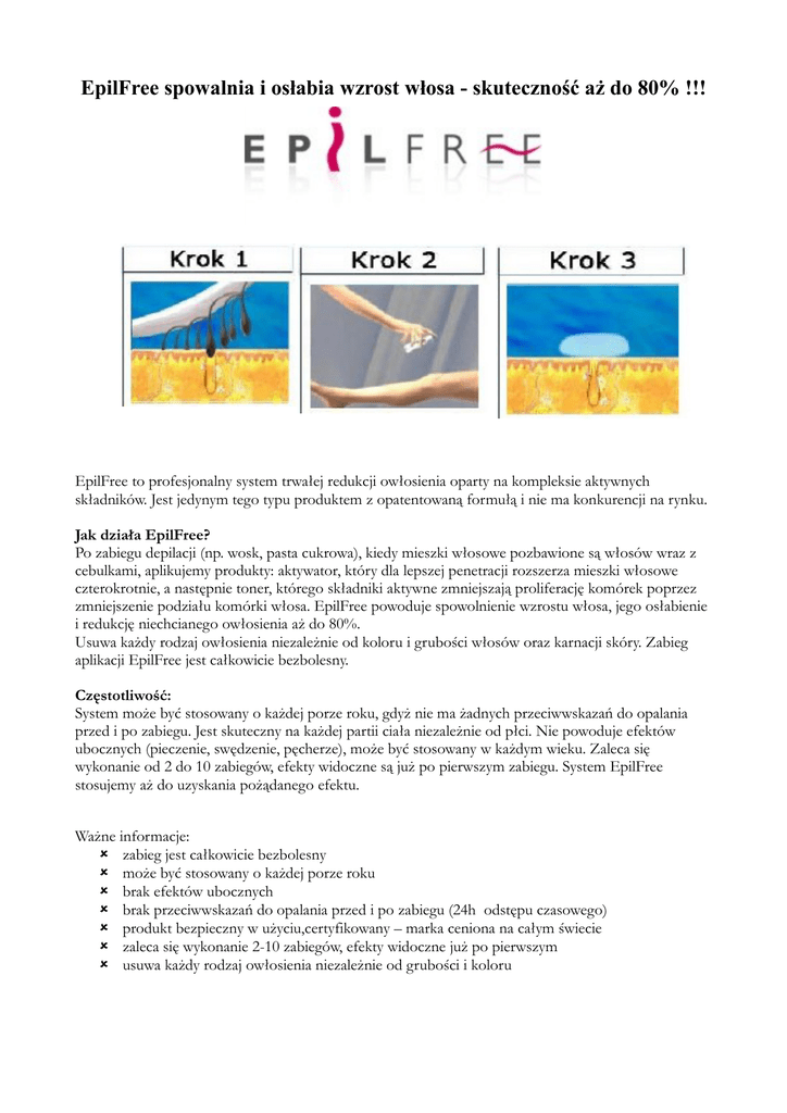 EpilFree spowalnia i osłabia wzrost włosa - skuteczność aż do 80% !!! EpilFree to profesjonalny system trwałej redukcji owłosienia oparty na kompleksie aktywnych składników. Jest jedynym tego typu produktem z opatentowaną formułą i nie ma konkurencji na rynku. Jak działa EpilFree? Po zabiegu depilacji (np. wosk, pasta cukrowa), kiedy mieszki włosowe pozbawione są włosów wraz z cebulkami, aplikujemy produkty: aktywator, który dla lepszej penetracji rozszerza mieszki włosowe czterokrotnie, a następnie toner, którego składniki aktywne zmniejszają proliferację komórek poprzez zmniejszenie podziału komórki włosa. EpilFree powoduje spowolnienie wzrostu włosa, jego osłabienie i redukcję niechcianego owłosienia aż do 80%. Usuwa każdy rodzaj owłosienia niezależnie od koloru i grubości włosów oraz karnacji skóry. Zabieg aplikacji EpilFree jest całkowicie bezbolesny. Częstotliwość: System może być stosowany o każdej porze roku, gdyż nie ma żadnych przeciwwskazań do opalania przed i po zabiegu. Jest skuteczny na każdej partii ciała niezależnie od płci. Nie powoduje efektów ubocznych (pieczenie, swędzenie, pęcherze), może być stosowany w każdym wieku. Zaleca się wykonanie od 2 do 10 zabiegów, efekty widoczne są już po pierwszym zabiegu. System EpilFree stosujemy aż do uzyskania pożądanego efektu. Ważne informacje: zabieg jest całkowicie bezbolesny może być stosowany o każdej porze roku brak efektów ubocznych brak przeciwwskazań do opalania przed i po zabiegu (24h odstępu czasowego) produkt bezpieczny w użyciu,certyfikowany – marka ceniona na całym świecie zaleca się wykonanie 2-10 zabiegów, efekty widoczne już po pierwszym usuwa każdy rodzaj owłosienia niezależnie od grubości i koloru