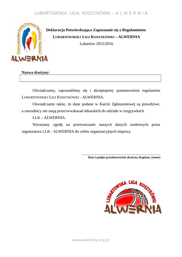 LUBARTOWSKA LIGA KOSZYKÓWKI – A L W E R N I A Deklaracja Potwierdzająca Zapoznanie się z Regulaminem LUBARTOWSKIEJ LIGI KOSZYKÓWKI – ALWERNIA Lubartów 2015/2016 Nazwa drużyny: Oświadczamy, zapoznaliśmy się i akceptujemy postanowienia regulaminu LUBARTOWSKIEJ LIGI KOSZYKÓWKI - ALWERNIA. Oświadczamy także, że dane podane w Karcie Zgłoszeniowej są prawdziwe, a zawodnicy nie mają przeciwwskazań lekarskich do udziału w rozgrywkach LLK – ALWERNIA. Wyrażamy zgodę na przetwarzanie naszych danych osobowych przez organizatora LLK - ALWERNIA do celów organizacyjnych imprezy. ……………………………………………………………………………………. Data i podpis przedstawiciela drużyny (kapitan, trener) www.alwernia.org.pl