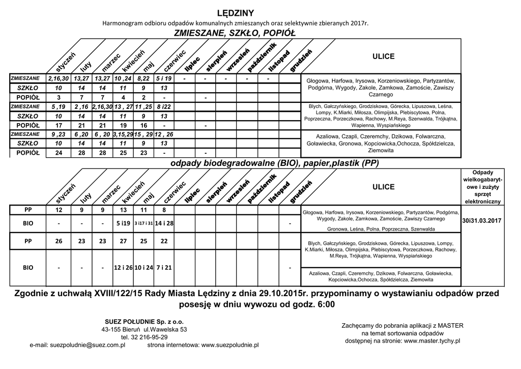LĘDZINY Harmonogram odbioru odpadów komunalnych zmieszanych oraz selektywnie zbieranych 2017r. ZMIESZANE 2,16,30 13,27 13,27 10 ,24 8,22 SZKŁO 10 POPIÓŁ 3 5 ,19 7 7 4 2 2 ,16 2,16,30 13 , 27 11 ,25 8 i22 SZKŁO 10 17 9 ,23 10 14 21 6 ,20 14 POPIÓŁ 24 28 ZMIESZANE SZKŁO POPIÓŁ ZMIESZANE 14 14 11 9 - 25 es ie ń pa źd zi er ni lis k to pa d gr ud zi eń - - - Głogowa, Harfowa, Irysowa, Korzeniowskiego, Partyzantów, Podgórna, Wygody, Zakole, Zamkowa, Zamoście, Zawiszy Czarnego 13 23 - Blych, Gałczyńskiego, Grodziskowa, Górecka, Lipuszowa, Leśna, Lompy, K.Miarki, Miłosza, Olimpijska, Plebiscytowa, Polna, Poprzeczna, Porzeczkowa, Rachowy, M.Reya, Szenwalda, Trójkątna, Wapienna, Wyspiańskiego - - ULICE w rz pi eń - 14 11 9 13 21 19 16 6 , 20 3,15,29 15 , 29 12 , 26 14 11 9 13 28 si er ie c ie c 5 i 19 lip cz er w ar ze c kw ie ci eń m aj m st yc ze ń lu ty ZMIESZANE, SZKŁO, POPIÓŁ Azaliowa, Czapli, Czeremchy, Dzikowa, Folwarczna, Goławiecka, Gronowa, Kopciowicka,Ochocza, Spółdzielcza, Ziemowita - 13 11 8 BIO - - - 5 i19 3 i17 i 31 14 i 28 PP 26 23 23 27 25 BIO - - - eń pi es ie ń pa źd zi er ni lis k to pa d gr ud zi eń 9 ULICE w rz 9 si er 12 ie c ie c PP lip cz er w m aj ie ń kw ie c ze m ar lu ty st yc ze c ń odpady biodegradowalne (BIO), papier,plastik (PP) - 22 12 i 26 10 i 24 7 i 21 Głogowa, Harfowa, Irysowa, Korzeniowskiego, Partyzantów, Podgórna, Wygody, Zakole, Zamkowa, Zamoście, Zawiszy Czarnego Odpady wielkogabarytowe i zużyty sprzęt elektroniczny 30i31.03.2017 Gronowa, Leśna, Polna, Poprzeczna, Szenwalda Blych, Gałczyńskiego, Grodziskowa, Górecka, Lipuszowa, Lompy, K.Miarki, Miłosza, Olimpijska, Plebiscytowa, Porzeczkowa, Rachowy, M.Reya, Trójkątna, Wapienna, Wyspiańskiego - Azaliowa, Czapli, Czeremchy, Dzikowa, Folwarczna, Goławiecka, Kopciowicka,Ochocza, Spółdzielcza, Ziemowita Zgodnie z uchwałą XVIII/122/15 Rady Miasta Lędziny z dnia 29.10.2015r. przypominamy o wystawianiu odpadów przed posesję w dniu wywozu od godz. 6:00 SUEZ POŁUDNIE Sp. z o.o. 43-155 Bieruń ul.Wawelska 53 tel. 32 216-95-29 e-mail: [email protected] strona internetowa: www.suezpoludnie.pl Zachęcamy do pobrania aplikacji z MASTER na temat sortowania odpadów dostępnej na stronie: www.master.tychy.pl