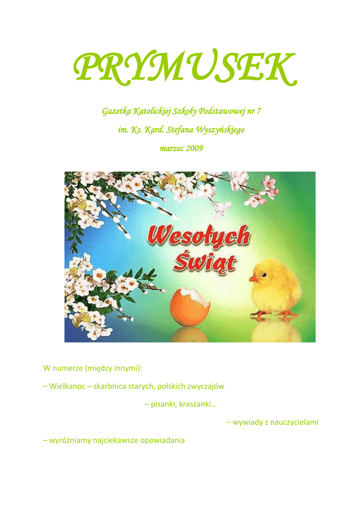 PRYMUSEK Gazetka Katolickiej Szkoły Podstawowej nr 7 im. Ks. Kard. Stefana Wyszyńskiego marzec 2009 W numerze (między innymi): – Wielkanoc – skarbnica starych, polskich zwyczajów – pisanki, kraszanki… – wywiady z nauczycielami – wyróżniamy najciekawsze opowiadania Słowo do czytelnika Marzec jest miesiącem, w którym rozpoczyna się najpiękniejsza pora roku: wiosna! Wiosna kojarzy się z kwiatami, słońcem i oczywiście świętami. Wielkanoc pozwala mieć nadzieję na odrodzenie, na rozpoczęcie wszystkiego od nowa. Ile polskich zwyczajów wielkanocnych przetrwało do dziś? Dowiecie się tego z naszej gazetki. Świąteczne życzenia Zdrowych, Pogodnych Świąt Wielkanocnych, Pełnych wiary, miłości i pokoju. Serdecznych spotkań w rodzinnym gronie oraz wesołego Alleluja Dyrekcji, Nauczycielom, Pracownikom szkoły i Rodzicom Życzy Redakcja Redakcja: Krystyna Deresz Barbara Dylak Martyna Piszczorowicz Julia Rocławska Natalia Rutkowska Julia Szcześniak 2 Wielkanoc – Świętem Zmartwychwstania Zbliża się Wielkanoc, najważniejsze święto chrześcijańskie obchodzone na pamiątkę Zmartwychwstania Jezusa Chrystusa. Rozpoczyna je Środa Popielcowa. Wielkanoc poprzedzona jest Wielkim Tygodniem, obchodzona na rozpoczyna pamiątkę go Niedziela uroczystego Palmowa, wjazdu Jezusa do Jerozolimy. W Niedzielę Palmową święci się w kościołach palmy. U nas zazwyczaj są to gałązki wierzby, obsypane szarymi kotkami. W oczekiwaniu na Wielkanoc przeżywamy Wielki Post. W Wielkim Poście odprawiane są nabożeństwa : Gorzkie Żale (odprawiane w niedzielę) oraz Droga Krzyżowa ( odprawiana w piątek). Wielki Post jest okresem, w którym zastanawiamy się nad życiem. Każdy ma postanowienia, które pomagają zmierzyć się z własnymi słabościami. Staramy się zbliżyć do Boga. W pierwszą sobotę – Wielką Sobotę, po czterdziestu dniach Postu, spotykamy się z rodziną. W kościele obywa się święcenie pokarmów: jaj, chleba, kiełbas, pieprzu, soli, chrzanu, baranków cukrowych. Następnego dnia, w Wielką Niedzielę, zasiadamy do śniadania spożywając poświecone pokarmy. Tego dnia zaczyna się Wielkanoc, cieszymy się ze zmartwychwstania Pana Jezusa. W Wielką Niedzielę rano odbywa się Rezurekcja, uroczysta Msza Św. z procesją, na pamiątkę Zmartwychwstania Jezusa Chrystusa. Jest to jedna z głównych 3 prawd wiary chrześcijańskiej, jest znakiem zwycięstwa nad śmiercią i zapowiedzią zmartwychwstania wszystkich wiernych. Symbolem Świąt Wielkanocy jest baranek, utożsamia on samego Jezusa. Jezus umarł za nas, aby odkupić nasze grzechy. Teraz z pewnością jecie baranki z cukru, które kojarzymy z Wielkanocą. Często przyozdabiamy nimi domy, taką ozdobą są też pisanki. Na pewno wiele razy je robiliście. Wystarczy tylko zrobić mała dziurkę w jajku, poczekać aż wypłynie środek i pomalować. Pisanka już gotowa! Sympatyczną tradycją jest składanie życzeń bliskim podczas świąt. Aby zrobić podwójną przyjemność można wykonać kartkę. Najlepiej własnoręcznie np. dla rodziców czy dziadków. Na pewno będą zadowoleni! Pamiętajcie, że Wielkanoc to czas radości. 4 „Pietruszkowa pisanka” Materiały: Jajko, listki świeżej pietruszki, klej, mały pędzelek, kawałek pończochy lub rajstop, mocna nitka, łupiny z ok. 0,5 kg cebuli (inne barwniki) Instrukcja wykonania: 1) Jajko ugotuj na twardo i wystudź. 2) Listki pietruszki rozłóż delikatnie i posmaruj klejem z jednej strony za pomocą pędzelka. Naklejaj je na skorupkę jajka, układając w dowolny wzór. 3) Zwiąż jeden koniec kawałka pończochy mocną nitką. Po wyschnięciu kleju włóż ostrożnie jajko w „siatkę” z kawałka pończochy tak, aby przy dnie „siatki” znalazł się grubszy koniec jajka. Obciągnij pończochę na jajku i zwiąż jej drugi koniec przy cieńszym końcu jajka. 4) Zagotuj wodę. Wrzuć do wrzątku łupinki cebuli (lub inny barwnik) i gotuj na wolnym ogniu około 10 minut. Następnie wyjmij łupiny za pomocą łyżki cedzakowej, a do gotującej się wody włóż jajko w „siatce”. Gotuj 5 do 10 minut. 5 5) Delikatnie wyjmij jajko z wody, po wystygnięciu zdejmij ostrożnie siatkę. Zeskrob listki pietruszki paznokciem lub nożykiem. „Pietruszkowa pisanka” gotowa! Skąd się wziął śmigus-dyngus? Od dawna wierzono, że woda ma moc oczyszczania człowieka z jego dotychczasowych grzechów i złych skłonności. Oblewanie się wodą w „lany poniedziałek” ma nam przypomnieć, że powinniśmy unikać wszystkich złych uczynków, jakie popełniliśmy wcześniej. Wszędzie Poniedziałek Wielkanocny był dniem, kiedy polewano przede wszystkim dziewczęta i mężatki. Mężczyźni musieli się mieć na baczności dopiero od wtorku, a wszyscy pamiętali, że – do Zielonych Świątek można się lać w każdy piątek. 6 Podkrakowscy chłopcy, przebrani za ułanów, jeździli z „traczykiem” – drewnianym Barankiem na wózku i śpiewali: Miły gospodarzu, puśćcie nas do izby, boć nas tu niewiela, nie zrobimy ciżby. Stoimy za drzwiami jest Pan Jezus z nami. Do izby nas puśćcie, bo my po śmiguście. A dajcie, co macie dać bo nam tutaj zimno stać, krótkie mamy kożuszki to nam pomarzną brzuszki Wpuszczeni, pokazywali prócz Baranka jeszcze Bożą Mękę. Przebierańcy otrzymywali coś ze świątecznego stołu. Tak, jak otrzymywali też śpiewacy, którzy chodzili z „gaikiem zielonym” albo z „z kogutkiem”. Witano wiosnę, prosząc o dary: Lato idzie,zima schodzi, oj, nas kogutek boso chodzi. A złóżcie się po grosowi, kupcie buciny kogutkowi… Julia Szcześniak i Julia Rocławska 7 Jan Paweł II (18 V 1920 – 02 IV 2005) 2 kwietnia 2005 r. o godzinie 21.37 odszedł do „domu Ojca” wielki Polak – Papież Jan Paweł II. Zachęcamy więc wszystkich wysłuchania słów, które Ojciec Święty sam do nas kierował, wsłuchania się w słowa poezji oraz do wspólnej modlitwy w intencji zmarłego 