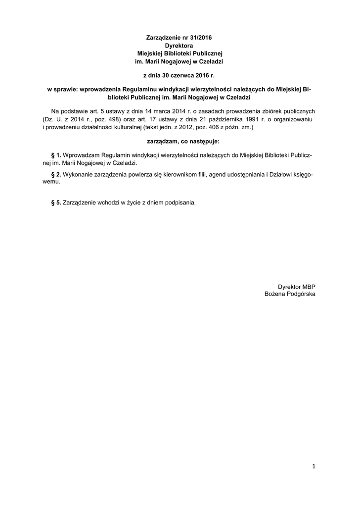 Zarządzenie nr 31/2016 Dyrektora Miejskiej Biblioteki Publicznej im. Marii Nogajowej w Czeladzi z dnia 30 czerwca 2016 r. w sprawie: wprowadzenia Regulaminu windykacji wierzytelności należących do Miejskiej Biblioteki Publicznej im. Marii Nogajowej w Czeladzi Na podstawie art. 5 ustawy z dnia 14 marca 2014 r. o zasadach prowadzenia zbiórek publicznych (Dz. U. z 2014 r., poz. 498) oraz art. 17 ustawy z dnia 21 października 1991 r. o organizowaniu i prowadzeniu działalności kulturalnej (tekst jedn. z 2012, poz. 406 z późn. zm.) zarządzam, co następuje: § 1. Wprowadzam Regulamin windykacji wierzytelności należących do Miejskiej Biblioteki Publicznej im. Marii Nogajowej w Czeladzi. § 2. Wykonanie zarządzenia powierza się kierownikom filii, agend udostępniania i Działowi księgowemu. § 5. Zarządzenie wchodzi w życie z dniem podpisania. Dyrektor MBP Bożena Podgórska 1 Załącznik Nr 1 do Zarządzenia nr 31/2016 Dyrektora Miejskiej Biblioteki Publicznej im. Marii Nogajowej w Czeladzi z dnia 30 czerwca 2016 r. REGULAMIN WINDYKACJI WIERZYTELNOŚCI NALEŻĄCYCH DO MIEJSKIEJ BIBLIOTEKI PUBLICZNEJ IM. MARII NOGAJOWEJ W CZELADZI § 1 Zasady ogólne 1. Regulamin określa sposób postępowania prowadzonego w celu skutecznego egzekwowania wierzytelności należących do Miejskiej Biblioteki Publicznej im. Marii Nogajowej w Czeladzi. 2. Postanowienia Regulaminu mają zastosowanie do wierzytelności powstałych z tytułu: a. niezwróconych w terminie materiałów bibliotecznych, b. nieuregulowanych opłat za przetrzymanie wypożyczonych materiałów bibliotecznych, c. opłat za upomnienia telefoniczne i pocztowe, d. opłat związanych z przedsądowym wezwaniem do zapłaty. 3. Windykacja prowadzona będzie w stosunku do osób, które ukończyły 18 lat. 4. W stosunku do osób niepełnoletnich odpowiedzialność za zaległe zobowiązania ponoszą ich opiekunowie prawni. 5. Windykacji nie prowadzi się w stosunku do dłużników, których suma zaległych wierzytelności nie przekracza łącznych kosztów korespondencji windykacyjnej tj. kwoty 10,00 zł. 6. Windykacja prowadzona jest przez pracownika pisemnie upoważnionego do prowadzenia spraw związanych z windykacją. 7. Nadzór nad prawidłowością prowadzonych działań windykacyjnych sprawuje pracownik Działu Finansowo-Administracyjnego. § 2 Zasady szczegółowe 1. Procedura windykacyjna zostaje rozpoczęta jeżeli czytelnik nie zwróci w terminie wypożyczonych materiałów bibliotecznych lub nie uregulował należnej opłaty, o których mowa w ust. 2 § 1 niniejszego regulaminu. 2. W trakcie roku kierownicy filii i agend zobowiązani są do prowadzenie czynności zmierzających do uregulowania zobowiązań wobec Miejskiej Biblioteki Publicznej im. Marii Nogajowej w Czeladzi w formie upomnień, kontaktu telefonicznego itp. 3. Windykacja prowadzona jest raz do roku w miesiącu grudniu za okres: a. w pierwszym roku obowiązywania niniejszego regulaminu za okres styczeń – listopad 2016 r., b. w latach następnych za okres: grudzień roku poprzedniego – listopad roku bieżącego, c. w stosunku do wierzytelności sprzed roku 2016 windykacja dokonywana będzie w oparciu o przedstawione zestawienia z poszczególnych filii i agend udostępniania w możliwie najkrótszym terminie nie powodującym przedawnienia wierzytelności wskazanych w zestawieniach. 2 d. do celów sprawozdawczych dokonuje się aktualizacji wierzytelności raz w roku wg stanu na 31 grudnia danego roku. 4. Filie i agendy udostępnień przekazują pracownikowi upoważnionemu do prowadzenie windykacji wykaz czytelników, wobec których ma być wszczęta procedura windykacyjna w terminie do 5-tego grudnia. 5. Wykaz osób przekazanych do windykacji wg wzoru stanowiącego załącznik nr 1 do niniejszego regulaminu podlega zatwierdzeniu przez Dyrektora Miejskiej Biblioteki Publicznej im. Marii Nogajowej w Czeladzi. 6. Do dłużników, o których mowa w ust. 4 niniejszego § zostają wysłane ostateczne wezwania do zwrotu i zapłaty określone wzorem stanowiącym załącznik nr 2 a i b do niniejszego regulaminu. 7. Osobami upoważnionymi do przygotowywania i podpisywania wezwań dotyczących wierzytelności powstałych do roku 2015 są kierownicy poszczególnych filii i agend udostępniania, a w zakresie powstałych wierzytelności po roku 2015 pracownik, o którym mowa w ust. 6 § 1 niniejszego regulaminu. 8. Osoby określone w ust. 7 niniejszego § wykonują wskazane czynności zgodnie z pisemnym upoważnieniem stanowiącym załącznik nr 3 do niniejszego regulaminu. W stosunku do podejmowanych działań windykacyjnych sprzed daty obowiązywania niniejszego zarządzenia czynności te wykonywane były w oparciu o ustne upoważnienie Dyrektora Miejskiej biblioteki Publicznej im. Marii Nogajowej w Czeladzi. 9. W pierwszej kolejności windykowani będą dłużnicy, którzy nie zwrócili wypożyczonych materiałów bibliotecznych. 10. W wezwaniu określa się termin na zwrot niezwróconych materiałów bibliotecznych oraz zapłaty zaległych wierzytelności. 11. Wezwanie wysyłane jest listem poleconym ze zwrotnym potwierdzeniem odbioru. 12. Zwrotu materiałów bibliotecznych można dokonać jedynie w miejscu ich wypożyczenia. 13. Spłatę zadłużenia można dokonać: a. w miejscu zwrotu przedmiotowych materiałów bibliotecznych, b. w kasie głównej Miejskiej Biblioteki Publicznej im. Marii Nogajowej w Czeladzi przy ul. 1 Maja 27 w godzinach pracy kasjera c. na rachunek bankowy Miejskiej Biblioteki Publicznej im. Marii Nogajowej w Czeladzi wskazany w wezwaniu do zapłaty. 14. W przypadku braku odpowiedzi na wezwanie do zapłaty ze strony dłużnika w terminie przewidzianym w wezwaniu do zapłaty, Dyrektor Miejskiej Biblioteki Publicznej im. Marii Nogajowej w Czeladzi podejmuje decyzję o skierowaniu sprawy na drogę sądową. 15. Wszelkie koszty związane z wszczęciem i prowadzeniem postępowania windykacyjnego, a także postepowania sądowego i egzekucyjnego, obc