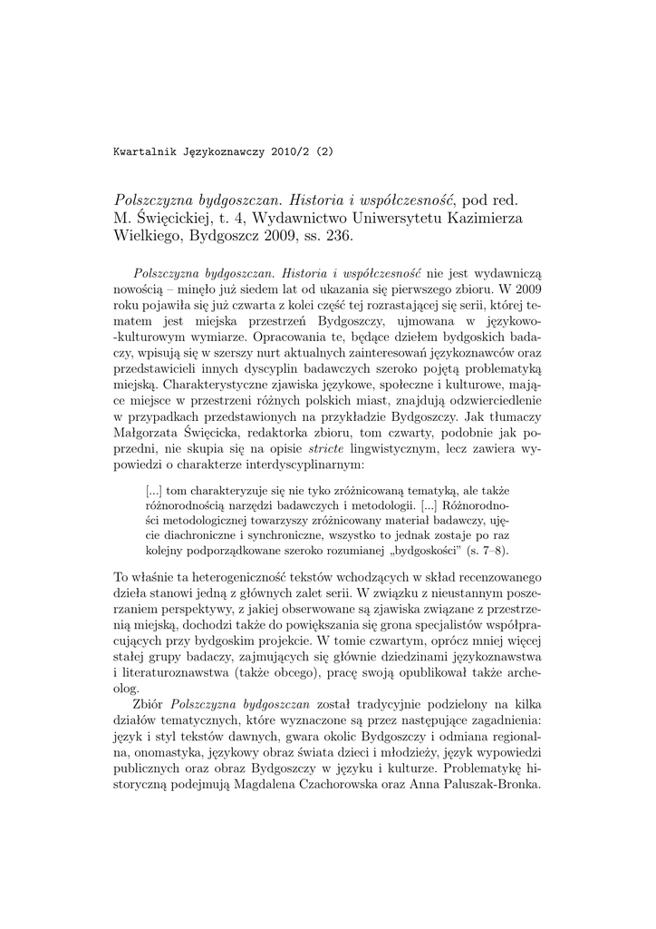 Kwartalnik Językoznawczy 2010/2 (2) Polszczyzna bydgoszczan. Historia i współczesność, pod red. M. Święcickiej, t. 4, Wydawnictwo Uniwersytetu Kazimierza Wielkiego, Bydgoszcz 2009, ss. 236. Polszczyzna bydgoszczan. Historia i współczesność nie jest wydawniczą nowością – minęło już siedem lat od ukazania się pierwszego zbioru. W 2009 roku pojawiła się już czwarta z kolei część tej rozrastającej się serii, której tematem jest miejska przestrzeń Bydgoszczy, ujmowana w językowo-kulturowym wymiarze. Opracowania te, będące dziełem bydgoskich badaczy, wpisują się w szerszy nurt aktualnych zainteresowań językoznawców oraz przedstawicieli innych dyscyplin badawczych szeroko pojętą problematyką miejską. Charakterystyczne zjawiska językowe, społeczne i kulturowe, mające miejsce w przestrzeni różnych polskich miast, znajdują odzwierciedlenie w przypadkach przedstawionych na przykładzie Bydgoszczy. Jak tłumaczy Małgorzata Święcicka, redaktorka zbioru, tom czwarty, podobnie jak poprzedni, nie skupia się na opisie stricte lingwistycznym, lecz zawiera wypowiedzi o charakterze interdyscyplinarnym: [...] tom charakteryzuje się nie tyko zróżnicowaną tematyką, ale także różnorodnością narzędzi badawczych i metodologii. [...] Różnorodności metodologicznej towarzyszy zróżnicowany materiał badawczy, ujęcie diachroniczne i synchroniczne, wszystko to jednak zostaje po raz kolejny podporządkowane szeroko rozumianej „bydgoskości” (s. 7–8). To właśnie ta heterogeniczność tekstów wchodzących w skład recenzowanego dzieła stanowi jedną z głównych zalet serii. W związku z nieustannym poszerzaniem perspektywy, z jakiej obserwowane są zjawiska związane z przestrzenią miejską, dochodzi także do powiększania się grona specjalistów współpracujących przy bydgoskim projekcie. W tomie czwartym, oprócz mniej więcej stałej grupy badaczy, zajmujących się głównie dziedzinami językoznawstwa i literaturoznawstwa (także obcego), pracę swoją opublikował także archeolog. Zbiór Polszczyzna bydgoszczan został tradycyjnie podzielony na kilka działów tematycznych, które wyznaczone są przez następujące zagadnienia: język i styl tekstów dawnych, gwara okolic Bydgoszczy i odmiana regionalna, onomastyka, językowy obraz świata dzieci i młodzieży, język wypowiedzi publicznych oraz obraz Bydgoszczy w języku i kulturze. Problematykę historyczną podejmują Magdalena Czachorowska oraz Anna Paluszak-Bronka. Recenzje 93 Autorka pierwszego ze szkiców, zatytułowanego Życie rzemieślników w dawnej Bydgoszczy na podstawie „Statutów i przywilejów cechów bydgoskich z lat 1434–1770” (s. 13–20), przedstawia obraz życia codziennego (zarówno w wymiarze zawodowym, jak i społecznym) członków bydgoskiego cechu rzemieślników, jaki wyłania się z informacji zawartych w dokumentach urzędowych: statutach i przywilejach. Z kolei druga badaczka kontynuuje podjęte w trzecim tomie serii rozważania na temat języka dawnych bydgoskich dokumentów (Księga mieszczan bydgoskich), tym razem skupiając swoją uwagę na zjawiskach fonetycznych, które jej zdaniem nie odróżniają XVI-wiecznej polszczyzny bydgoszczan od ówczesnego stanu języka ogólnopolskiego (Opis języka dokumentów bydgoskich z XVI wieku, s. 21–28). W dyskursy dotyczące zagadnień gwar i języka regionalnego ponownie wpisują się zajmujące się tą tematyką także i w poprzednich tomach Maria Pająkowska-Kensik oraz Zofia Sawaniewska-Mochowa. Pracę pierwszej z autorek, zatytułowaną O gwarze chełmińskiej (s. 31–36), uznać można za szczególnie znaczącą, gdyż zebrano w niej wyznaczniki odmiany językowej pomijanej nieco przez dialektologów, opisanej gruntownie tylko raz, przez A. Krasnowolskiego. Autorka podsumowuje więc dotychczasowe opracowania uwzględniając zastrzeżenia późniejszych badaczy. Z. Sawaniewska-Mochowa – w tekście Kresowa mowa w bydgoskich uszach (s. 37–44) – zwraca uwagę na złożoną tożsamość kulturową Bydgoszczy. Tożsamość ta jest dostrzegalna w aktach komunikacyjnych dzięki różnorodności językowych zachowań mieszkańców (w zależności od ich pochodzenia). Materiał badawczy tworzą wypowiedzi kresowiaków mieszkających w Bydgoszczy, skonfrontowane z językiem rodowitych bydgoszczan. Wraz z komplementarnym szkicem Bydgoska mowa w kresowych uszach (zawartym w drugiej części Polszczyzny bydgoszczan) praca stanowi interesujący opis wzajemnego oddziaływania poszczególnych języków regionalnych, jakie może mieć miejsce w miejskim tyglu kulturowym. Z pewnością warto by poczynić podobne obserwacje także w innych miastach, będących dawniej enklawami dla osób przesiedlonych. Tematyka onomastyczna została poruszona w trzech artykułach. Maria Czaplicka-Jedlikowska (O znaczeniu bazy apelatywnej bab’-i, babi-a w toponimii, s. 47–53) weryfikuje objaśnienia nazwy starej podbydgoskiej osady Babia Wieś poprzez konfrontację z innymi toponimami o podobnej bazie apelatywnej. Wnikliwie analizuje przy tym prace specjalistów w zakresie toponimii, m.in. Karola Zierhoffera. Małgorzata Jaracz w pracy o charakterze wstępnym pt. Nazewnicze świadectwa przeszłości Bydgoszczy w „Opisach parafii i kościołów bydgoskich 1791–1921” wydanych przez K. Śmigla (s. 54–67) na podstawie bogatego materiału źródłowego przedstawia wykaz antroponimów, toponimów i chrematonimów związanych z działalnością bydgoskich parafii. Problematyka onomastyczna została umiejętnie dopełniona przez stanowisko Recenzje 94 archeologa w szkicu Archeologia pradziejowa i historyczna w nazewnictwie bydgoskich ulic (s. 68–74) autorstwa Jacka Woźnego. Artykuł ten dostarcza obszernej i rzetelnej informacji na temat historycznych źródeł nazw ulic w Bydgoszczy, upatrywanych głównie w czasach wczesnego średniowiecza. Językowy obraz świata dzieci i młodzieży przedstawiają bydgoscy badac