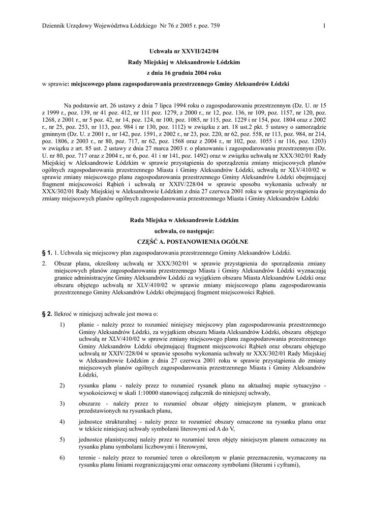 Dziennik Urzędowy Województwa Łódzkiego Nr 76 z 2005 r. poz. 759 1 Uchwała nr XXVII/242/04 Rady Miejskiej w Aleksandrowie Łódzkim z dnia 16 grudnia 2004 roku w sprawie: miejscowego planu zagospodarowania przestrzennego Gminy Aleksandrów Łódzki Na podstawie art. 26 ustawy z dnia 7 lipca 1994 roku o zagospodarowaniu przestrzennym (Dz. U. nr 15 z 1999 r., poz. 139, nr 41 poz. 412, nr 111 poz. 1279, z 2000 r., nr 12, poz. 136, nr 109, poz. 1157, nr 120, poz. 1268, z 2001 r., nr 5 poz. 42, nr 14, poz. 124, nr 100, poz. 1085, nr 115, poz. 1229 i nr 154, poz. 1804 oraz z 2002 r., nr 25, poz. 253, nr 113, poz. 984 i nr 130, poz. 1112) w związku z art. 18 ust.2 pkt. 5 ustawy o samorządzie gminnym (Dz. U. z 2001 r., nr 142, poz. 1591, z 2002 r., nr 23, poz. 220, nr 62, poz. 558, nr 113, poz. 984, nr 214, poz. 1806, z 2003 r., nr 80, poz. 717, nr 62, poz. 1568 oraz z 2004 r., nr 102, poz. 1055 i nr 116, poz. 1203) w związku z art. 85 ust. 2 ustawy z dnia 27 marca 2003 r. o planowaniu i zagospodarowaniu przestrzennym (Dz. U. nr 80, poz. 717 oraz z 2004 r., nr 6, poz. 41 i nr 141, poz. 1492) oraz w związku uchwałą nr XXX/302/01 Rady Miejskiej w Aleksandrowie Łódzkim w sprawie przystąpienia do sporządzenia zmiany miejscowych planów ogólnych zagospodarowania przestrzennego Miasta i Gminy Aleksandrów Łódzki, uchwałą nr XLV/410/02 w sprawie zmiany miejscowego planu zagospodarowania przestrzennego Gminy Aleksandrów Łódzki obejmującej fragment miejscowości Rąbień i uchwałą nr XXIV/228/04 w sprawie sposobu wykonania uchwały nr XXX/302/01 Rady Miejskiej w Aleksandrowie Łódzkim z dnia 27 czerwca 2001 roku w sprawie przystąpienia do zmiany miejscowych planów ogólnych zagospodarowania przestrzennego Miasta i Gminy Aleksandrów Łódzki Rada Miejska w Aleksandrowie Łódzkim uchwala, co następuje: CZĘŚĆ A. POSTANOWIENIA OGÓLNE § 1. 1. Uchwala się miejscowy plan zagospodarowania przestrzennego Gminy Aleksandrów Łódzki. 2. Obszar planu, określony uchwałą nr XXX/302/01 w sprawie przystąpienia do sporządzenia zmiany miejscowych planów zagospodarowania przestrzennego Miasta i Gminy Aleksandrów Łódzki wyznaczają granice administracyjne Gminy Aleksandrów Łódzki za wyjątkiem obszaru Miasta Aleksandrów Łódzki oraz obszaru objętego uchwałą nr XLV/410/02 w sprawie zmiany miejscowego planu zagospodarowania przestrzennego Gminy Aleksandrów Łódzki obejmującej fragment miejscowości Rąbień. § 2. Ilekroć w niniejszej uchwale jest mowa o: 1) planie - należy przez to rozumieć niniejszy miejscowy plan zagospodarowania przestrzennego Gminy Aleksandrów Łódzki, za wyjątkiem obszaru Miasta Aleksandrów Łódzki, obszaru objętego uchwałą nr XLV/410/02 w sprawie zmiany miejscowego planu zagospodarowania przestrzennego Gminy Aleksandrów Łódzki obejmującej fragment miejscowości Rąbień oraz obszaru objętego uchwałą nr XXIV/228/04 w sprawie sposobu wykonania uchwały nr XXX/302/01 Rady Miejskiej w Aleksandrowie Łódzkim z dnia 27 czerwca 2001 roku w sprawie przystąpienia do zmiany miejscowych planów ogólnych zagospodarowania przestrzennego Miasta i Gminy Aleksandrów Łódzki, 2) rysunku planu - należy przez to rozumieć rysunek planu na aktualnej mapie sytuacyjno wysokościowej w skali 1:10000 stanowiącej załącznik do niniejszej uchwały, 3) obszarze - należy przez to rozumieć obszar objęty niniejszym planem, w granicach przedstawionych na rysunkach planu, 4) jednostce strukturalnej - należy przez to rozumieć obszary oznaczone na rysunku planu oraz w tekście niniejszej uchwały symbolami literowymi od A do V, 5) jednostce planistycznej należy przez to rozumieć teren objęty niniejszym planem oznaczony na rysunku planu symbolami liczbowymi i literowymi, 6) terenie - należy przez to rozumieć teren o określonym w planie przeznaczeniu, wyznaczony na rysunku planu liniami rozgraniczającymi oraz oznaczony symbolami (literami i cyframi), Dziennik Urzędowy Województwa Łódzkiego Nr 76 z 2005 r. poz. 759 2 7) działce - należy przez to rozumieć nieruchomość gruntową lub działkę gruntu, której wielkość, cechy geometryczne, dostęp do drogi publicznej oraz wyposażenie w urządzenia infrastruktury technicznej spełniają wymogi realizacji obiektów budowlanych wynikające z odrębnych przepisów i aktów prawa miejscowego, 8) przeznaczeniu podstawowym - rozumie się przez to określony w planie rodzaj przeznaczenia, które przeważa na danym terenie, 9) przeznaczeniu uzupełniającym - należy przez to rozumieć określone rodzaje przeznaczenia, inne niż podstawowe, które uzupełniają przeznaczenie podstawowe, 10) budynkach modernizowanych - należy przez to rozumieć budynki, w których przeprowadza się działania dokonywane głównie w ramach istniejącej bryły budynku, 11) budynkach rozbudowywanych – należy przez to rozumieć budynki istniejące, w których powiększa się ich kubaturę, 12) usługach, przemyśle - rozumie się przez to usługi oraz przemysł z grupy przedsięwzięć mogących znacząco oddziaływać na środowisko, dla których sporządzenie raportu może być wymagane, zgodnie z aktualnie obowiązującymi przepisami, 13) usługach - rozumie się przez to usługi związane z zaopatrzeniem i bytowaniem mieszkańców wbudowane w bryłę budynku mieszkalnego lub wolnostojące na terenach mieszkaniowych. § 3. Celem regulacji zawartych w ustaleniach planu jest przekształcenie zainwestowania na obszarze gminy w sposób umożliwiający wyznaczenie nowych terenów budowlanych i poprawę ładu przestrzennego, przy minimalizacji wzajemnych konfliktów i optymalizacji korzyści, wynikających ze wspólnych działań. CZĘŚĆ B - USTALENIA PLANU Rozdział I Ustalenia ogólne § 4. Miejscowy plan zagospodarowania przestrzennego Gminy Aleksandrów Łódzki, o którym mowa w § 1 niniejszej uchwały, przedstawiono w jednostkach planistycznych. § 5. 1. Dla terenów, o których mowa w Rozdziale II plan us