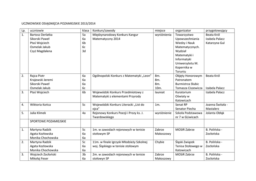 UCZNIOWSKIE OSIĄGNIĘCIA POZAMIEJSKIE 2013/2014 Lp. 1. uczniowie Bartosz Derlatka Sikorski Paweł Ptaś Wojciech Osmelak Jakub Czyż Magdalena klasa 5a 6a 6b 6c 3d Konkurs/zawody Międzynarodowy Konkurs Kangur Matematyczny 2014 miejsce wyróżnienia organizator Towarzystwo Upowszechniania Wiedzy i Nauk Matematycznych. Wydział Matematyki i Informatyki Uniwersytetu M. Kopernika w Toruniu Objęty Honorowym Patronatem Burmistrza Słubic Tomasza Ciszewicza Kuratorium Oświaty w Katowicach Senat RP Senator Piecha Szkoła Podstawowa nr 7 w GLiwicach przygotowujący Beata Król Izabela Palacz Katarzyna Gul 2. 6a 6a 6a 6c 6b Ogólnopolski Konkurs z Matematyki „Leon” 3. Rajca Piotr Krajewski Jeremi Sikorski Paweł Osmelak Jakub Ptaś Wojciech 8m. 8m. 8m. 10m. laureat 4. Wiktoria Końca 5c 1m. 5. Julia Klimek 4a Wojewódzki Konkurs Literacki „List do ojca” Rejonowy Konkurs Poezji i Prozy ks. J. Twardowskiego 1m. w zawodach rejonowych w tenisie stołowym SP Zabrze Makoszowy MOSIR Zabrze B. Polińska Zocłońska 11m. w finale Igrzysk Młodzieży Szkolnej woj. Śląskiego w tenisie stołowym Chybie 2m. w zawodach rejonowych w tenisie stołowyn SP Zabrze Makoszowy Śląski Związek B. Polińska Tenisa Stołowego w Zocłońska Katowicach MOSiR Zabrze B. Polińska Zocłońska Wojewódzki Konkurs Przedmiotowy z Matematyki z elementami Przyrody wyróżnienie Beata Król Izabela Palacz Izabela Palacz Joanna Świtała Mastalerz Jolanta Obłąk SPORTOWE POZAMIEJSKIE 1. 2. 3. Martyna Radzik Agata Kozłowska Monika Chochowska Martyna Radzik Agata Kozłowska Monika Chochowska Wojciech Zocłoński Mikołaj Feser 5c 6a 6a 5c 6a 6a 3b 6a 4. 5. 6. 7. 8. 9. Mikołaj Naleśnik Dawid Mryka, Mikołaj Feser, Jeremi Krajewski, Mikołaj Naleśnik, Szczepan Mryka, M.Dworaczek, Paweł Sikorski, Kamil Wojciuch Daniel Strzyżewski, Michał Dudzik, Mikołaj Naleśnik, Dawid Mryka, Mikołaj Feser Bartosz Stępiński Jakub Kubica Julia Radziejewska Hanna Radziejewska Barbara Borowy, Monika Skworc, Oliwia Wilk, Oliwia Barczak, Monika Chochowska, Agata Kozłowska, Angelika Marciniak, Karolina Huchmann, Weronika Makola, Kasia Honorowicz j.w. 6a 6a 2m. w zawodach rejonowych w piłce ręcznej Sp Zabrze MOSiR Zabrze Michał Jendryczko 6a 5m. w zawodach rejonowych w badmintonie SP Ruda Śląska MOSiR Zabrze 4a 5m. w zawodach rejonowych chłopców SP w szachach 6m. w zawodach rejonowych dziewcząt SP w szachach 1m. w zawodach rejonowych dziewcząt SP w piłce siatkowej Ruda Śląska MOSiR Ruda Śląska L.Cyrys, M. Jendryczko, B.Zocłońska p. Janiszewski Ruda Śląska MOSiR Ruda Śląska p. Janiszewski Ruda Śląska SP 24 MOSiR Ruda Śląska M. Widera p. Patryacha 6a 3m. w półfinale wojewódzkim w mini piłce siatkowej SP Ruda Śląska MOSiR Ruda Śląska M. Widera p. Patryacha IV Miasto Ruda Śląska A.Kilkowska wyróżnienie A.Kilkowska 6a MIEJSKIE OSIĄGNIĘCIA PRZEDMIOTOWE I ARTYSTYCZNE 1. Wojciech Ptaś 6b 2. Julia Kalisz 5c IX edycja Olimpiad Przedmiotowych Szkół Podstawowych z Informatyki Anioł 2013 3. 4. 5. Patryk Potyka Alicja Piątek Zofia Gawenda Tymoteusz Tobiasz Kamil Gwizdała Wojciech Ptaś 5c 4b 3 Najpiękniejsza Pisanka Wielkanocna Najpiękniejsza Pisanka Wielkanocna Konkurs Przyrodniczy 3m. wyróżnienie 2m. Dom Kultury w Rudzie Śląskiej TPD TPD SP nr 13 6b IX Edycja Olimpiad Przedmiotowych Szkół Podstawowych z Historii 3m. Miasto Ruda Śląska 6. A.Kilkowska A.Kilkowska A,Sroka J. Grzondziel M.Pawłowska B.Swoboda 7. Naleśnik Róża Brzęczek Olga John Natalia Dędek laura Woźniczek Alicja Szmida Aleksandra 3b Rudzki Konkurs Piosenki i Poezji Obcojęzycznej 1m. Gimnazjum nr 9 K. Gołąbek A. Mańka Sz. Gołąbek 4b Rudzki Konkurs Piosenki i Poezji Obcojęzycznej wyróżnienie Gimnazjum nr 9 9. 10. Jakub Krzyziński Natalia Kłodziej 2b 5c 1m. 3m. PCK 11. Dominika Paduch 5c 12. Dominika Paduch 5c 13. 14. 15. Tymon Magiera Monika Pietrasik Julia Klimek 3a 5a 4a 16. Czyż Magdalena 3d 3d 17. Gawenda Zofia Tobiasz Tymoteusz Jeremi Krajewski Wojciech Ptaś Monika Chochowska Wielkanocna Pisanka Międzyszkolny Konkurs Recytatorski w Gwarze Śląskiej w ramach obchodów Dni Ślonski Godki Miejski Konkurs „Śląskie mieszkanie dawniej” Miejski Konkurs „Śląskie potrawy gwarą – książka” Konkurs Miejski „Wczoraj, dziś i jutro” Konkurs miejski „Razem łatwiej” Miejski Konkurs Świetlic Szkolnych (plastyczny)„Jesienne inspiracje” 1m. w konkursie Macmillan Primary School (konkurs wiedzy j.angielskiego) Konkurs matematyczny „Kangur” 2m. w konkursie przyrodniczym K. Gołąbek A. Mańka Sz. Gołąbek M.Wrana Joanna Świtała Mastalerz Miejska Olimpiada z Matematyki finalista wyróżnienie Alicja Piątek Klaudia Marek Bartosz Derlatka Mateusz Szczygieł Kamil Gwizdała 4b 6b 5a 6b 3c Miejski Konkurs „Matematyczne Wyszywanki” Szkolny Konkurs „Mistrz Matematyki” Miejski Konkurs Przedmiotowy z przyrody 2m. w konkursie przyrodniczym 8. 18. 19. 20. 21. 6a 6b 6a 2m. wyróżnienie nagroda wyróżnienie MCK Ruda Śląska MDK Ruda Śląska SP 41 Ruda Śl. Joanna Świtała Mastalerz Joanna Świtała Mastalerz J. Malejka J.Malejka J. Rzepka 1m. SP1 K. Gul 2m. Wyróżnienie SP nr 13 2m. B.Król I. Palacz B. Król 1m. SP nr 6 w Rudzie Śląskiej SP nr 18 w Rudzie Śląskiej SP nr 24 1m. 2m. SP nr 24 SP nr 13 Paweł Piela Iza Toborek B.Król I. Palacz