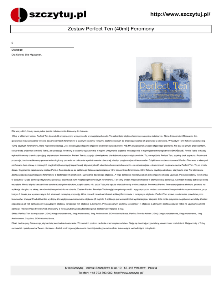 http://www.szczytuj.pl/ Zestaw Perfect Ten (40ml) Feromony 0 Dla kogo Dla Kobiet, Dla Mężczyzn, Dla wszystkich, którzy cenią sobie jakość i skuteczność.Zalecany do: biznesu Witaj w elitarnym klubie. Perfect Ten to produkt przeznaczony wyłącznie dla wymagających osób. To najbardziej stężone feromony na rynku światowym. Stone Independent Research, Inc. gwarantuje niewiarygodnie wysoką zawartość trzech feromonów o łącznym stężeniu 1 mg/ml, zbalansowanych do średniej proporcji ich produkcji u człowieka. W każdym 10ml flakonie znajduje się 10mg czystych feromonów, które naprawdę działają. Jest to najwyższe legalne stężenie dozwolone przez prawo. NIE MA drugiego tak wysoce stężonego produktu. Nie daj się zmylić producentom, którzy będą próbować wmówić Tobie, że sprzedają feromony o stężeniu wyższym niż 1 mg/ml. Utrzymanie stężenia wyższego niż 1 mg/ml jest technologicznie NIEMOŻLIWE. Powie Tobie to każdy wykwalifikowany chemik zajmujący się tematem feromonów. Perfect Ten to pozycja obowiązkowa dla doświadczonych użytkowników. To, co wyróżnia Perfect Ten, zupełny brak zapachu. Producent przyznaje, że skomplikowany proces technologiczny pozwala na całkowite wyeliminowanie ubocznej, niezbyt przyjemnej woni feromonów. Dzięki temu możesz stosować Perfect Ten wraz z własnymi perfumami, bez obawy o zmianę ich oryginalnej kompozycji zapachowej. Wysoka jakość, absolutny brak zapachu oraz to, co najważniejsze - skuteczność, to główne cechy Perfect Ten. To po prostu działa. Oryginalnie zapakowany zestaw Perfect Ten składa się ze szklanego flakonu zawierającego 10ml koncentratu feromonów, 30ml flakonu czystego alkoholu, strzykawki oraz 7ml atomizera. Zestaw pozwala na zmieszanie feromonów z dostarczanym alkoholem i uzyskania dowolnego stężenia. A więc dokładnie kontrolujesz jak silne stężenie chcesz uzyskać. Po rozcieńczeniu feromonów w stosunku 1:2 (za pomocą strzykawki z zestawu) otrzymasz 30ml nieprzeciętnie mocnych feromonów. Tak silny środek możesz umieścić w atomizerze (z zestawu). Atomizer możesz zabrać ze sobą wszędzie. Mieści się do kieszeni i nie zawiera żadnych nadruków, dzięki czemu nikt poza Tobą nie będzie wiedział co się w nim znajduje. Ponieważ Perfect Ten oparty jest na alkoholu, pozwala na aplikację nie tylko na skórę, ale również bezpośrednio na ubranie. Zestaw Perfect Ten daje Tobie wyjątkową elastyczność i wygodę użycia: możesz zastosować bezpośrednio super-koncentrat, przy którym 1 dawka jest wystarczająca, lub stosować rozsądną proporcję, która pozwoli nawet na kilkaset aplikacji feromonów o mniejszym stężeniu. Perfect Ten sprawi, że docenisz prawdziwą moc feromonów. Uwaga! Produkt bardzo wydajny. Ze względu na ekstremalne stężenie (1 mg/ml), 1 aplikacja jest w zupełności wystarczająca. Większa ilość może przynieść negatywne rezultaty. Zestaw pozwala na aż 195 aplikacji przy najwyższym stężeniu (proporcje 1:2, stężenie 0,33mg/ml). Przy zalecanym stężeniu (proporcje 1:4 stężenie 0,20mg/ml) zestaw pozwoli Tobie na uzyskanie aż 325 aplikacji. Produkt może być również zmieszany z Twoją ulubioną wodą toaletową (lub zastosowany łącznie z nią). Skład: Perfect Ten dla mężczyzn (10ml): 6mg Androstenone, 3mg Androstenol, 1mg Androsteron, SD40 Alcohol base. Perfect Ten dla kobiet (10ml): 3mg Androstenone, 5mg Androstenol, 1mg Androsteron, Copulins, SD40 Alcohol base. Efekt: Ludzie przy Tobie czują się bardziej swobodnie i naturalnie. Wzrasta ich poziom zaufania oraz bezpieczeństwa. Stają się bardziej przyjacielscy, otwarci oraz rozluźnieni. Mają ochotę z Tobą rozmawiać i przebywać w Twoim otoczeniu. Jesteś postrzegany jako osoba bardziej atrakcyjna seksualnie, interesująca, wzbudzająca pożądanie. SklepSzczytuj - Adres: Szczęśliwa 8 lok.19, 53-446 Wrocław, Polska Telefon: +48 793 393 082, http://www.szczytuj.pl/ http://www.szczytuj.pl/ SklepSzczytuj - Adres: Szczęśliwa 8 lok.19, 53-446 Wrocław, Polska Telefon: +48 793 393 082, http://www.szczytuj.pl/
