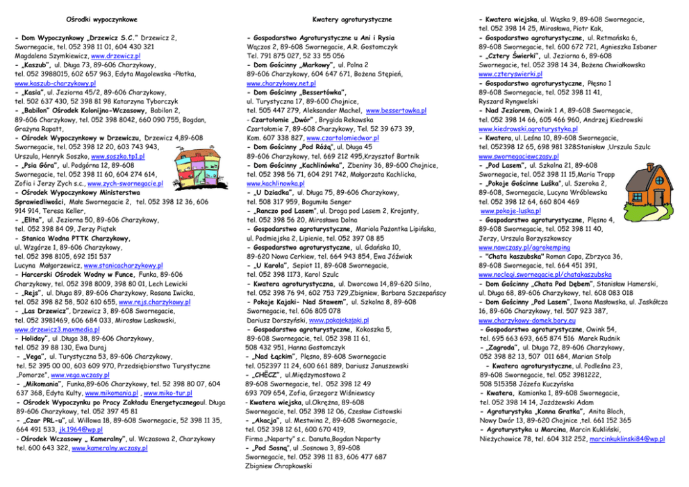 Ośrodki wypoczynkowe - Dom Wypoczynkowy „Drzewicz S.C.” Drzewicz 2, Swornegacie, tel. 052 398 11 01, 604 430 321 Magdalena Szymkiewicz, www.drzewicz.pl - „Kaszub”, ul. Długa 73, 89-606 Charzykowy, tel. 052 3988015, 602 657 963, Edyta Magolewska –Płotka, www.kaszub-charzykowy.pl - „Kasia”, ul. Jeziorna 45/2, 89-606 Charzykowy, tel. 502 637 430, 52 398 81 98 Katarzyna Tyborczyk - „Babilon” Ośrodek Kolonijno-Wczasowy, Babilon 2, 89-606 Charzykowy, tel. 052 398 8042, 660 090 755, Bogdan, Grażyna Rapatt, - Ośrodek Wypoczynkowy w Drzewiczu, Drzewicz 4,89-608 Swornegacie, tel. 052 398 12 20, 603 743 943, Urszula, Henryk Soszko, www.soszko.tp1.pl - „Psia Góra”, ul. Podgórna 12, 89-608 Swornegacie, tel. 052 398 11 60, 604 274 614, Zofia i Jerzy Zych s.c., www.zych-swornegacie.pl - Ośrodek Wypoczynkowy Ministerstwa Sprawiedliwości, Małe Swornegacie 2, tel. 052 398 12 36, 606 914 914, Teresa Keller, - „Elita”, ul. Jeziorna 50, 89-606 Charzykowy, tel. 052 398 84 09, Jerzy Piątek - Stanica Wodna PTTK Charzykowy, ul. Wzgórze 1, 89-606 Charzykowy, tel. 052 398 8105, 692 151 537 Lucyna Małgorzewicz, www.stanicacharzykowy.pl - Harcerski Ośrodek Wodny w Funce, Funka, 89-606 Charzykowy, tel. 052 398 8009, 398 80 01, Lech Lewicki - „Rejs”, ul. Długa 89, 89-606 Charzykowy, Rosana Iwicka, tel. 052 398 82 58, 502 610 655, www.rejs.charzykowy.pl - „Las Drzewicz”, Drzewicz 3, 89-608 Swornegacie, tel. 052 3981469, 606 684 033, Mirosław Laskowski, www.drzewicz3.maxmedia.pl - Holiday”, ul .Długa 38, 89-606 Charzykowy, tel. 052 39 88 130, Ewa Duraj - „Vega”, ul. Turystyczna 53, 89-606 Charzykowy, tel. 52 395 00 00, 603 609 970, Przedsiębiorstwo Turystyczne „Pomorze”, www.vega.wczasy.pl - „Mikomania”, Funka,89-606 Charzykowy, tel. 52 398 80 07, 604 637 368, Edyta Kulty, www.mikomania.pl , www.miko-tur.pl - Ośrodek Wypoczynku po Pracy Zakładu Energetycznegoul. Długa 89-606 Charzykowy, tel. 052 397 45 81 - „Czar PRL-u”, ul. Willowa 18, 89-608 Swornegacie, 52 398 11 35, 664 491 533, [email protected] - Ośrodek Wczasowy „ Kameralny”, ul. Wczasowa 2, Charzykowy tel. 600 643 322, www.kameralny.wczasy.pl Kwatery agroturystyczne - Gospodarstwo Agroturystyczne u Ani i Rysia Wączos 2, 89-608 Swornegacie, A.R. Gostomczyk Tel. 791 875 027, 52 33 55 056 - Dom Gościnny „Markowy”, ul. Polna 2 89-606 Charzykowy, 604 647 671, Bożena Stępień, www.charzykowy.net.pl - Dom Gościnny „Bessertówka”, ul. Turystyczna 17, 89-600 Chojnice, tel. 505 447 279, Aleksander Machel, www.bessertowka.pl - Czartołomie „Dwór” , Brygida Rekowska Czartołomie 7, 89-608 Charzykowy, Tel. 52 39 673 39, Kom. 607 338 827, www.czartolomiedwor.pl - Dom Gościnny „Pod Różą”, ul. Długa 45 89-606 Charzykowy, tel. 669 212 495,Krzysztof Bartnik - Dom Gościnny „Kachlinówka”, Zbeniny 36, 89-600 Chojnice, tel. 052 398 56 71, 604 291 742, Małgorzata Kachlicka, www.kachlinowka.pl - „U Dziadka”, ul. Długa 75, 89-606 Charzykowy, tel. 508 317 959, Bogumiła Senger - „Ranczo pod Lasem”, ul. Droga pod Lasem 2, Krojanty, tel. 052 398 56 20, Mirosława Dolna - Gospodarstwo agroturystyczne, Mariola Pażontka Lipińska, ul. Podmiejska 2, Lipienie, tel. 052 397 08 85 - Gospodarstwo agroturystyczne, ul. Gdańska 10, 89-620 Nowa Cerkiew, tel. 664 943 854, Ewa Jóźwiak - „U Karola”, Sepiot 11, 89-608 Swornegacie, tel. 052 398 1173, Karol Szulc - Kwatera agroturystyczna, ul. Dworcowa 14,89-620 Silno, tel. 052 398 76 94, 602 753 729,Zbigniew, Barbara Szczepańscy - Pokoje Kajaki- Nad Stawem”, ul. Szkolna 8, 89-608 Swornegacie, tel. 606 805 078 Dariusz Dorszyński, www.pokojekajaki.pl - Gospodarstwo agroturystyczne, Kokoszka 5, 89-608 Swornegacie, tel. 052 398 11 61, 508 432 951, Hanna Gostomczyk - „Nad Łąckim”, Plęsno, 89-608 Swornegacie tel. 052397 11 24, 600 661 889, Dariusz Januszewski - „CHËCZ”, ul.Międzymostowa 2 89-608 Swornegacie, tel. 052 398 12 49 693 709 654, Zofia, Grzegorz Wiśniewscy - Kwatera wiejska, ul.Okrężna, 89-608 Swornegacie, tel. 052 398 12 06, Czesław Cistowski - „Akacja”, ul. Mestwina 2, 89-608 Swornegacie, tel. 052 398 12 61, 600 670 419, Firma „Naparty” s.c. Danuta,Bogdan Naparty - „Pod Sosną”, ul .Sosnowa 3, 89-608 Swornegacie, tel. 052 398 11 83, 606 477 687 Zbigniew Chrapkowski - Kwatera wiejska, ul. Wąska 9, 89-608 Swornegacie, tel. 052 398 14 25, Mirosława, Piotr Kak, - Gospodarstwo agroturystyczne, ul. Retmańska 6, 89-608 Swornegacie, tel. 600 672 721, Agnieszka Isbaner - „Cztery Świerki”, ul. Jeziorna 6, 89-608 Swornegacie, tel. 052 398 14 34, Bożena Chwiałkowska www.czteryswierki.pl - Gospodarstwo agroturystyczne, Płęsno 1 89-608 Swornegacie, tel. 052 398 11 41, Ryszard Ryngwelski - Nad Jeziorem, Owink 1 A, 89-608 Swornegacie, tel. 052 398 14 66, 605 466 960, Andrzej Kiedrowski www.kiedrowski.agroturystyka.pl - Kwatera, ul. Leśna 10, 89-608 Swornegacie, tel. 052398 12 65, 698 981 328Stanisław ,Urszula Szulc www.swornegaciewczasy.pl - „Pod Lasem”, ul. Szkolna 21, 89-608 Swornegacie, tel. 052 398 11 15,Maria Trapp - „Pokoje Gościnne Luśka”, ul. Szeroka 2, 89-608, Swornegacie, Lucyna Wróblewska tel. 052 398 12 64, 660 804 469 www.pokoje-luska.pl - Gospodarstwo agroturystyczne, Plęsno 4, 89-608 Swornegacie, tel. 052 398 11 40, Jerzy, Urszula Borzyszkowscy www.nawczasy.pl/agrokemping - "Chata kaszubska" Roman Copa, Zbrzyca 36, 89-608 Swornegacie, tel. 664 451 391, www.noclegi.swornegacie.pl/chatakaszubska - Dom Gościnny „Chata Pod Dębem”, Stanisław Hamerski, ul. Długa 68, 89-606 Charzykowy, tel. 608 083 018 - Dom Gościnny „Pod Lasem”, Iwona Masłowska, ul. Jaskółcza 16, 89-606 Charzykowy, tel. 507 923 387, www.charzykowy-domek.bory.eu - Gospodarstwo agroturystyczne, Owink 54, tel. 695 663 693, 665 874 516 Marek Rudnik - „Zagroda”, ul. Długa 72, 89-606 Charzykowy, 052 398 82 13, 507 011 684, Marian Stolp - Kwatera agroturystyczne, ul. Podleśna 23, 89-608 Swo