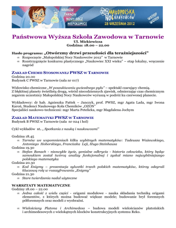 Państwowa Wyższa Szkoła Zawodowa w Tarnowie Ul. Mickiewicza Godzina: 18.00 – 22.00 Hasło programu: „Otwórzmy drzwi przeszłości dla teraźniejszości” • Rozpoczęcie „Małopolskiej Nocy Naukowców 2012” w Tarnowie • Rozstrzygnięcie konkursu plastycznego „Naukowiec XXI wieku” – etap lokalny, wręczenie nagród ZAKŁAD CHEMII STOSOWANEJ PWSZ W TARNOWIE Godzina 20.00 Budynek C PWSZ w Tarnowie (sala nr 017) Widowisko chemiczne „W poszukiwaniu gwiezdnego pyłu” – spektakl czarujący chemią. Z błękitnej planety świetlistą drogą, wśród niecodziennych zjawisk, odmierzając czas chemicznym zegarem uczestnicy Małopolskiej Nocy Naukowców wyruszą w podróż ku czerwonej planecie. Wykładowcy: dr hab. Agnieszka Pattek – Janczyk, prof. PWSZ, mgr Agata Lada, mgr Iwona Karoń, Studenci Naukowego Koła Chemików „OZON” Specjaliści naukowo-techniczni: mgr Marta Petelicka, mgr Magdalena Jochym ZAKŁAD MATEMATYKI PWSZ W TARNOWIE Budynek B PWSZ w Tarnowie (sala nr 024 i hol) Cykl wykładów nt. „ Spotkania z nauką i naukowcami” Godzina 18.45 • Tarnów we wspomnieniach kilku wybitnych matematyków: Tadeusza Ważewskiego, Antoniego Hoborskiego, Franciszka Leji, Hugo Steinhausa Godzina 19.30 • Stefan Banach - niezwykłe życie, genialne odkrycia - historia człowieka, który będąc samoukiem został twórcą analizy funkcjonalnej i zyskał miano najwybitniejszego polskiego matematyka Godzina 20.30 • Kod Enigmy – prezentacja sylwetki trzech polskich matematyków, którzy odegrali kluczową rolę w rozszyfrowaniu „Enigmy” Godzina 21.30 • Stare twierdzenia nadal użyteczne WARSZTATY MATEMATYCZNE Godziny 18.00 – 22.00 • Jedna całość z wielu części - origami modułowe - nauka składania techniką origami elementów, z których można budować większe modele; budowanie brył foremnych półforemnych oraz modeli z wyobraźni. • Wielościany Platona i Archimedesa – budowa modeli wielościanów platońskich i archimedesowych z wielokątnych klocków konstrukcyjnych systemu Reko. • Rozwiąż szkolne zadanie z matematyki prababci i pradziadka - uczestnicy zmierzą się z zadaniami matematycznymi z podręczników i zbiorów zadań sprzed 50, 75, 100 i 125 lat. Dorośli będą mogli sprawdzić swoją znajomość języka rosyjskiego i niemieckiego, rozwiązując zadania z czasów zaborów. • Spróbuj pomyśleć - ułóż, złóż, rozłóż.... - uczestnicy będą rozwiązywać łamigłówki logiczne, a także zagrać w mniej popularne lub zapomniane gry logiczne. WYSTAWA Polscy matematycy wciąż za mało znani - plakaty ze zdjęciami i informacjami o życiu i dorobku polskich matematyków XX wieku. Quizy tematycznie związane z prezentowanymi wykładami, warsztatami i wystawą. Wykładowcy: dr hab. Edward Tutaj, mgr Barbara Dziadkowiec, mgr Paweł Ozorka, dr hab. Mirosław Baran, dr Beata Milówka, Studenci Koła Naukowego Matematyków ZAKŁAD ELEKTROTECHNIKI Godziny: 18.00 – 22.00 Budynek D PWSZ w Tarnowie (sala nr 05) • • • • • • Pokaz „Znane i mniej znane wynalazki” Odkrywcy i wynalazcy mniej znani - Jan Szczepanik Pokaz filmu „Wielcy wynalazcy” Przejażdżka poduszkowcem Pokaz harfy laserowej Zabawy z elektrycznością - stanowiska pokazowe dla dzieci i młodzieży. Wykładowcy: dr inż. Agnieszka Lisowska – Lis, mgr inż. Grzegorz Aksamit, mgr inż. Tomasz Kołacz. PRACOWNIA FIZYCZNA Godziny: 18.00 – 22.00 Budynek D PWSZ w Tarnowie (sala 08) Hasło programu: „Od atomu do medycyny” • Właściwości światła – mechanizm widzenia, ruchy Browna – osoba prezentowana Marian Smoluchowski • Promieniowanie mikrofalowe – fale stojące w mikrofalówce • Własności materii w niskich temperaturach – postacie prezentowane Karol Olszewski, Zygmunt Wróblewski • Magnetyczny Rezonans Jądrowy – osoba prezentowana Izydor Rabi z Rymanowa • Promieniowanie jonizujące – obrazowanie i terapia – Centrum Terapii Hydronowej Godzina 19.00 i 21.00 Wykład okolicznościowy „Promieniowanie – mowa materii” Wykładowcy: prof. dr hab. Jan Stanek, prof. dr hab. Antoni Pędziwiatr, dr Tomasz Wietecha. ZAKŁAD INŻYNIERII MATERIAŁOWEJ Godziny: 18.00 – 21.00 Budynek D PWSZ w Tarnowie (sala nr 012) • Pokaz multimedialny procesu topienia • • • • • Formowanie wyrobów na kole garncarskim Pokaz szyby zespolonej niskoemisyjnej Badanie wyroszenia szyby zespolonej Pomiar punktu rosy szyby jako test przy zastosowaniu w budownictwie Prezentacja stanowiska badań mechanicznych Wykładowcy: prof. dr hab. inż. Jan Wasylak mgr inż. Marek Lisiecki, inż. Grzegorz Kuciński ZAKŁAD ELEKTRONIKI I TELEKOMUNIKACJI Godziny 18.00 – 22.00 Budynek C PWSZ w Tarnowie (sala nr 06) • • • • • • • • Pokaz zdalnie sterowanego samolotu z nawigacją i pomiarem parametrów lotu Pokaz inteligentnej kamery Pokaz autonomicznych mini-robotów Prezentacja elektronicznego przewodnika dla niewidomych Prezentacja głośnika plazmowego Pokaz wyświetlacza widmowego 3D Pokaz ekranu matrycowego LED Efekty świetlne Dodatkowo absolwenci kierunku Elektronika i Telekomunikacja tarnowskiej Uczelni zaprezentują: • minifrezarkę CNC sterowana z komputera klasy PC • zestaw ewaluacyjny z mikrokontrolerem ATMega128 z zaimplementowaną funkcją zamka kodowego wraz ze sterowanie elektromagnesem • zestaw ewaluacyjny z mikrokontrolerem PIC wraz z obsługą silników krokowych Wykładowcy: dr Ryszard Wiatr, mgr inż. Łukasz Mik, Koło Naukowe Elektroników „AMPER”, absolwenci ZAKŁAD PIELĘGNIARSTWA Godziny: 18.00 - 22.00 Budynek C PWSZ w Tarnowie (sala nr 313) Prezentacje i pokazy • Prezentacja sylwetki Hanny Chrzanowskiej – pielęgniarki, autorki podręczników pielęgniarskich, założycielki szkoły pielęgniarskiej w Tarnowie • Prezentacja strojów pielęgniarskich z lat 30-tych • Wystawa sprzętu medycznego do zabiegów pielęgniarskich z lat 60-tych • Ptaki i zwierzęta w „Orgiami” – nauka i 