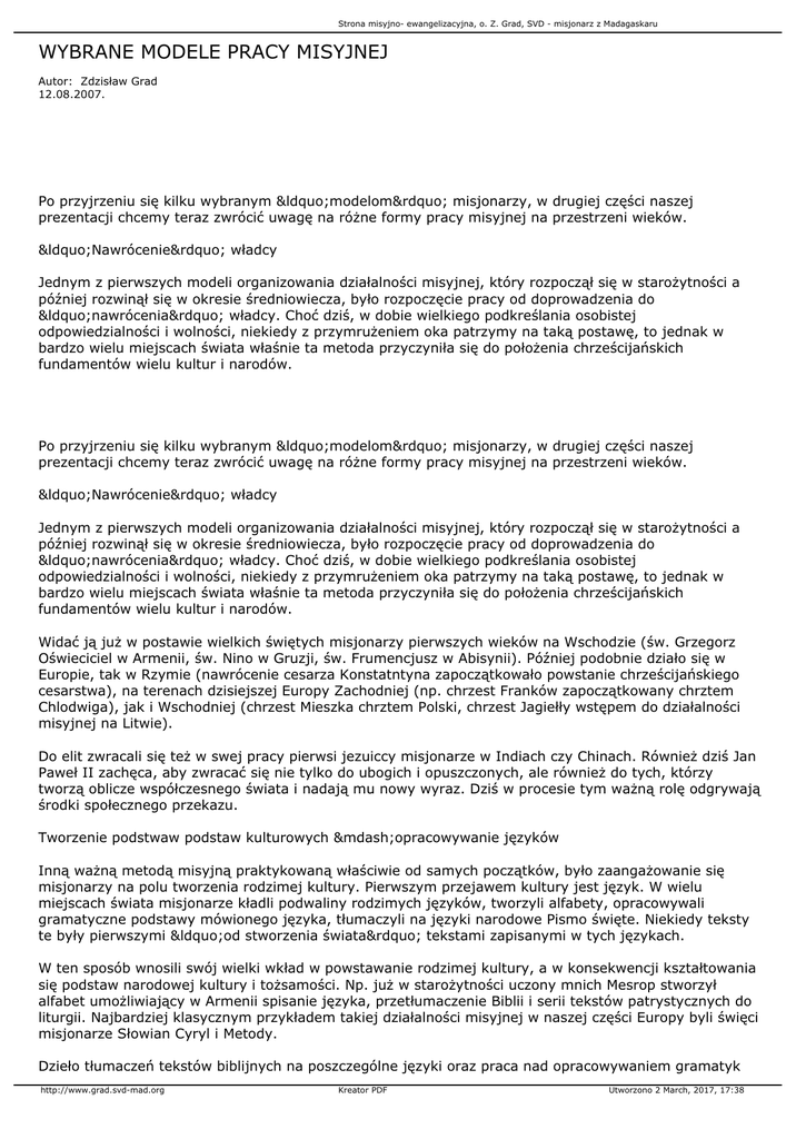 Strona misyjno- ewangelizacyjna, o. Z. Grad, SVD - misjonarz z Madagaskaru WYBRANE MODELE PRACY MISYJNEJ Autor: Zdzisław Grad 12.08.2007. Po przyjrzeniu się kilku wybranym “modelom” misjonarzy, w drugiej części naszej prezentacji chcemy teraz zwrócić uwagę na różne formy pracy misyjnej na przestrzeni wieków. “Nawrócenie” władcy Jednym z pierwszych modeli organizowania działalności misyjnej, który rozpoczął się w starożytności a później rozwinął się w okresie średniowiecza, było rozpoczęcie pracy od doprowadzenia do “nawrócenia” władcy. Choć dziś, w dobie wielkiego podkreślania osobistej odpowiedzialności i wolności, niekiedy z przymrużeniem oka patrzymy na taką postawę, to jednak w bardzo wielu miejscach świata właśnie ta metoda przyczyniła się do położenia chrześcijańskich fundamentów wielu kultur i narodów. Po przyjrzeniu się kilku wybranym “modelom” misjonarzy, w drugiej części naszej prezentacji chcemy teraz zwrócić uwagę na różne formy pracy misyjnej na przestrzeni wieków. “Nawrócenie” władcy Jednym z pierwszych modeli organizowania działalności misyjnej, który rozpoczął się w starożytności a później rozwinął się w okresie średniowiecza, było rozpoczęcie pracy od doprowadzenia do “nawrócenia” władcy. Choć dziś, w dobie wielkiego podkreślania osobistej odpowiedzialności i wolności, niekiedy z przymrużeniem oka patrzymy na taką postawę, to jednak w bardzo wielu miejscach świata właśnie ta metoda przyczyniła się do położenia chrześcijańskich fundamentów wielu kultur i narodów. Widać ją już w postawie wielkich świętych misjonarzy pierwszych wieków na Wschodzie (św. Grzegorz Oświeciciel w Armenii, św. Nino w Gruzji, św. Frumencjusz w Abisynii). Później podobnie działo się w Europie, tak w Rzymie (nawrócenie cesarza Konstatntyna zapoczątkowało powstanie chrześcijańskiego cesarstwa), na terenach dzisiejszej Europy Zachodniej (np. chrzest Franków zapoczątkowany chrztem Chlodwiga), jak i Wschodniej (chrzest Mieszka chrztem Polski, chrzest Jagiełły wstępem do działalności misyjnej na Litwie). Do elit zwracali się też w swej pracy pierwsi jezuiccy misjonarze w Indiach czy Chinach. Również dziś Jan Paweł II zachęca, aby zwracać się nie tylko do ubogich i opuszczonych, ale również do tych, którzy tworzą oblicze współczesnego świata i nadają mu nowy wyraz. Dziś w procesie tym ważną rolę odgrywają środki społecznego przekazu. Tworzenie podstwaw podstaw kulturowych —opracowywanie języków Inną ważną metodą misyjną praktykowaną właściwie od samych początków, było zaangażowanie się misjonarzy na polu tworzenia rodzimej kultury. Pierwszym przejawem kultury jest język. W wielu miejscach świata misjonarze kładli podwaliny rodzimych języków, tworzyli alfabety, opracowywali gramatyczne podstawy mówionego języka, tłumaczyli na języki narodowe Pismo święte. Niekiedy teksty te były pierwszymi “od stworzenia świata” tekstami zapisanymi w tych językach. W ten sposób wnosili swój wielki wkład w powstawanie rodzimej kultury, a w konsekwencji kształtowania się podstaw narodowej kultury i tożsamości. Np. już w starożytności uczony mnich Mesrop stworzył alfabet umożliwiający w Armenii spisanie języka, przetłumaczenie Biblii i serii tekstów patrystycznych do liturgii. Najbardziej klasycznym przykładem takiej działalności misyjnej w naszej części Europy byli święci misjonarze Słowian Cyryl i Metody. Dzieło tłumaczeń tekstów biblijnych na poszczególne języki oraz praca nad opracowywaniem gramatyk http://www.grad.svd-mad.org Kreator PDF Utworzono 2 March, 2017, 17:38 Strona misyjno- ewangelizacyjna, o. Z. Grad, SVD - misjonarz z Madagaskaru lokalnych ludów połączona z wydawaniem pierwszych dzieł lokalnej literatury trwa do dziś i jest stale aktualna. Do takiej pracy potrzeba nie tylko prostych, choćby i pobożnych misjonarzy, ale prawdziwych uczonych, którzy byliby w stanie stworzyć podstawy języka pisanego i znaleźć odpowiednie formy dla bogatego wyrażenia wartości rodzimej kultury. W języku polskim zauważamy, że literatura zaczęła się rodzić wraz z treściami ewangelicznymi (pierwszy znany utwór — Bogurodzica). W naszej sztuce i kulturze odegrały i odgrywają wielką rolę treści chrześcijańskie, podobnie było i jest w wielu innych narodach. Jeden z twórców armeńskich stwierdził, że nie można oddzielić chrześcijaństwa od duszy armeńskiej, tak jak nie można oddzielić ciała od skóry. Kierując się w wielu miejscach świata do kultur niepiśmiennych misjonarze opracowując gramatyki poszczególnych ludów czy tworząc przekłady biblijne, kładli podstawy wielu kultur, np. w krajach Afryki, czy wśród Indian obu Ameryk. Inną jednak postawę musieli przyjąć misjonarze, gdy napotykali kultury wysoko rozwinięte, posiadające już swe spisane tradycje, niekiedy starsze od chrześcijańskich (np. Indie czy Chiny). W takich wypadkach okazywało się często, że jako dzieci swej epoki misjonarze mieli wielkie trudności, aby głosić Ewangelię, wyrażać ją w znakach i symbolach innych kultur. Gdy poszczególni misjonarze podejmowali takie próby, niejednokrotnie byli oskarżani o zdradę Ewangelii (np. problem tzw. “rytów chińskich”). Dziś choć wiele się mówi o zaangażowaniu w dzieło inkulturacji, wciąż wydaje się, że problem ten nie znalazł jeszcze właściwego rozwiązania. Nawracanie “siłą” Cokolwiek byśmy myśleli o tej metodzie, sięgnięto po nią również. Wobec nieskuteczności bardziej łagodnych metod sięgano po metody radykalniejsze. Sposób nawracani “siłą” widać w niektórych “traktatach pokojowych” narzucanych podbitym plemionom przez Karola Wielkiego (chrzest albo śmierć). Jeszcze bardziej metodę tę rozwinęli krzyżowcy, którzy także mieli swój udział w dziele ewangelizacji. Krucjaty w