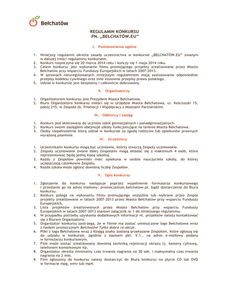 REGULAMIN KONKURSU PN. „BEŁCHATÓW.EU” I. Postanowienia ogólne 1. Niniejszy regulamin określa zasady uczestnictwa w konkursie „BEŁCHATÓW.EU” zwanym w dalszej treści regulaminu konkursem. 2. Konkurs rozpoczyna się 20 marca 2014 roku i kończy się 1 maja 2014 roku. 3. Celem konkursu jest wykonanie filmu promującego projekty zrealizowane przez Miasto Bełchatów przy wsparciu Funduszy Europejskich w latach 2007-2013. 4. W sprawach nieuregulowanych niniejszym regulaminem mają zastosowanie odpowiednie przepisy kodeksu cywilnego oraz inne stosowne przepisy prawa polskiego. 5. Udział w konkursie jest bezpłatny i całkowicie dobrowolny. II. Organizatorzy 1. Organizatorem konkursu jest Prezydent Miasta Bełchatowa. 2. Biuro Organizatora konkursu mieści się w Urzędzie Miasta Bełchatowa, ul. Kościuszki 15, pokój 215, w Zespole ds. Promocji i Współpracy z Miastami Partnerskimi. III. Odbiorcy i zasięg 1. Konkurs jest skierowany do uczniów szkół gimnazjalnych i ponadgimnazjalnych. 2. Konkurs swoim zasięgiem obejmuje szkoły funkcjonujące na terenie Miasta Bełchatowa. 3. Osoby niepełnoletnie biorą udział w konkursie za zgodą rodziców lub opiekunów prawnych wyrażoną pisemnie. IV. Uczestnicy 1. Uczestnikami konkursu mogą być uczniowie, którzy stworzą Zespoły uczniowskie. 2. Zespoły uczniowskie zwane dalej Zespołami mogą składać się z maksimum 4 osób, które reprezentować będą jedną klasę szkolną. 3. Każdy z Zespołów powinien mieć opiekuna w osobie nauczyciela szkoły, do której uczęszczają członkowie Zespołu. 4. Każda szkoła może zgłosić dowolną liczbę Zespołów. V. Opis konkursu 1. Zgłoszenie do konkursu następuje poprzez wypełnienie formularza konkursowego i przesłanie go na adres mailowy: [email protected], bądź dostarczenie do Biura konkursu. 2. Konkurs polega na wykonaniu filmu promującego wszystkie lub wybrane przez Zespół projekty zrealizowane w latach 2007-2013 przez Miasto Bełchatów przy wsparciu Funduszy Europejskich. 3. Lista projektów zrealizowanych przez Miasto Bełchatów przy wsparciu Funduszy Europejskich w latach 2007-2013 stanowi załącznik nr 1 do niniejszego regulaminu. 4. W przypadku potrzeby uzyskania dodatkowych informacji nt. projektów należy kontaktować się z Biurem Organizatora. 5. Organizator konkursu zastrzega, że w filmie ma zostać umieszczone logo Bełchatowa wraz z hasłem promocyjnym Bełchatów Tylko dobre re:akcje. 6. Pliki z logo Bełchatowa wraz z Księgą znaku zostaną przekazane Zespołom, które zgłoszą się do udziału w konkursie, zgodnie z zapisem pkt. V.1., na adres e-mailowy podany w formularzu konkursowym. 7. Film może zostać zrealizowany dowolną techniką rejestracji obrazu tj. kamerą cyfrową, telefonem komórkowym itp. 8. Organizator określa minimalny czas trwania nagrania na 30 sek. i maksymalny czas trwania nagrania na 2 min. 9. Film zgłoszony do konkursu należy dostarczyć do Biura konkursu na płycie CD lub DVD w formacie mpg, wmv lub mp4. 10. Materiał filmowy nie może być sprzeczny z powszechnie obowiązującym prawem, porządkiem publicznym i dobrymi obyczajami. 11. Do filmu należy dołączyć krótkie uzasadnienie (do 600 znaków) wyjaśniające, dlaczego to właśnie projekty zapromowane w filmie są ważne dla mieszkańców Bełchatowa. 12. Każdy Zespół uczniowski może zgłosić jedną pracę konkursową. 13. Oceniane będą tylko prace zbiorowe. 14. Praca konkursowa musi być utworem nienagradzalnym wcześniej w innych konkursach, nieobciążonym wadami prawnymi, obciążeniami lub roszczeniami osób trzecich. 15. Poprzez zgłoszenie do konkursu uczestnicy oświadczają, że są autorami pracy i przysługują im do niej wyłączne i nieograniczone terytorialnie prawa autorskie, osobiste i majątkowe. 16. Uczestnicy konkursu przesyłają prace konkursowe na własny koszt. VI. Zasady uczestnictwa w konkursie 1. Każdy Zespół chcący wziąć udział w konkursie musi być reprezentowany przez opiekuna w osobie nauczyciela, który jako koordynator Zespołu jest odpowiedzialny za kontakt Zespołu z Organizatorem przez cały czas trwania konkursu. 2. Koordynator zobowiązany jest zarejestrować Zespół w konkursie poprzez wypełnienie formularza konkursowego, stanowiącego załącznik nr 2 do niniejszego regulaminu, a następnie: a) przesłanie go zeskanowanego drogą elektroniczną na adres: [email protected] lub b) dostarczenie go do siedziby Biura konkursowego, w terminie do 28 marca 2014r. 3. W ciągu dwóch dni roboczych nauczyciel zgłaszający Zespół otrzyma e-mailowe potwierdzenie przyjęcia zgłoszenia, co jest potwierdzeniem uczestnictwa w konkursie. 4. Zespół zobowiązany jest do dostarczenia filmu na opisanej płycie CD/DVD do Biura konkursowego, do dnia 18 kwietnia 2014r., do godz. 15.00. VII. Zasady rozstrzygnięcia konkursu 1. Oceny zgłoszonych filmów dokona Komisja konkursowa powołana przez Organizatora. 2. Komisja konkursowa przy ocenie zgłoszonych do konkursu filmów będzie kierować się w szczególności wartością promocyjną dla Miasta Bełchatowa i poziomem artystycznym ocenianych filmów, a także ich jakością, scenariuszem i pomysłowością. Każdy z członków Komisji będzie mógł przyznać ocenianej pracy od 1 do 10 punktów, które następnie będą sumowane. Zwycięży projekt, który otrzyma najwyższą liczbę punktów. 3. Decyzja Komisji konkursowej jest ostateczna i nie przysługuje od niej odwołanie. 4. Komisja zastrzega sobie prawo do nierozstrzygnięcia bądź odwołania konkursu. VIII. Nagrody i zakończenie konkursu 1. Nagroda zostanie przyznana za zdobycie I miejsca. 2. Komisja Konkursowa zastrzega sobie prawo do przyznania wyróżnienia. 3. Nagrody dla finalistów zostaną wręczone podczas oficjalnego rozstrzygnięcia w 10-tą rocznicę wstąpienia Polski do Unii Europejskiej tj. 1 maja 2014r. 4. O terminie i miejscu oficjalnego rozstrzygnięcia Zespoły zostaną poinformowane za po