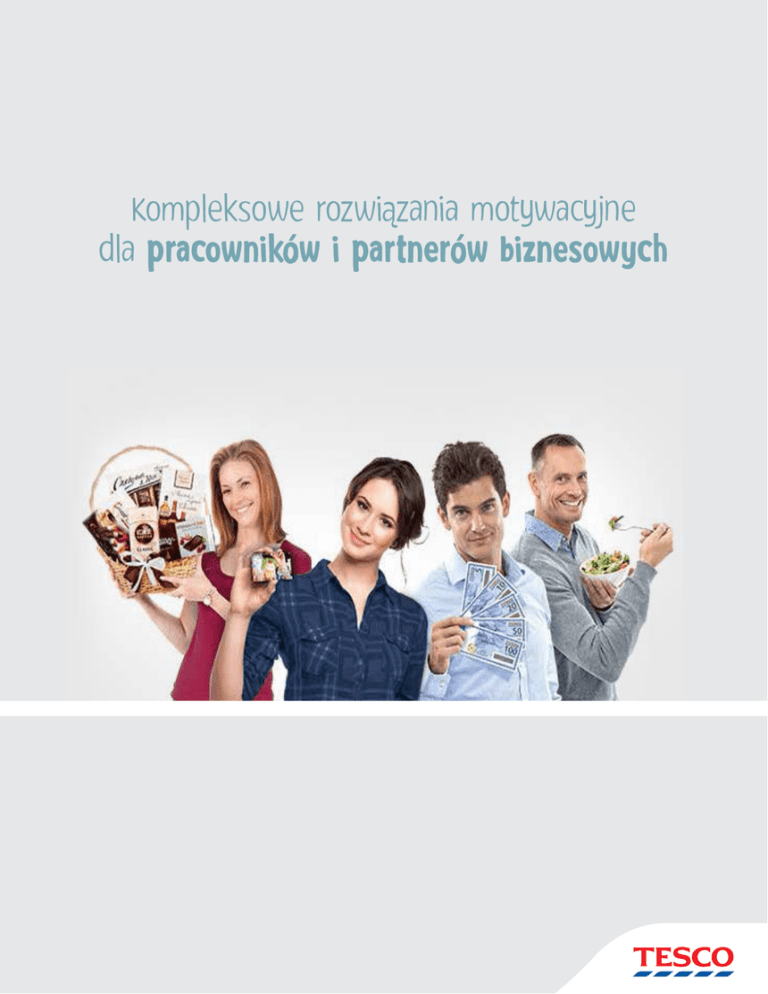 Kompleksowe rozwiązania motywacyjne dla pracowników i partnerów biznesowych Przygotowaliśmy dla Państwa: Tesco działa na rynku polskim od kilkunastu lat W tym czasie staliśmy się czołową siecią sklepów samoobsługowych na polskim rynku z ponad 440 sklepami, od hipermarketów, po małe osiedlowe supermarkety. Tygodniowo obsługujemy 5 milionów Klientów. Asortyment naszych sklepów to ponad 50 tysięcy różnych produktów, przygotowanych z myślą o każdym Kliencie. przedpłacone karty podarunkowe bony podarunkowe zestawy prezentowe bony i karty żywieniowe „Dbamy o naszych Klientów każdego dnia coraz lepiej”. Nasza oferta Nowoczesny system motywowania pracowników wymaga stosowania nowoczesnych rozwiązań. Oferta przygotowana przez nasz zespół jest odpowiedzią na potrzeby pracodawców. Bazując na kilkuletnim doświadczeniu opracowaliśmy pakiet narzędzi, które pozwolą na nagradzanie Państwa pracowników w zależności od struktury firmy, ilości pracowników, czy złożoności systemu motywacyjnego. Wszystkie rozwiązania są zgodne ze standardami prawnymi obowiązującymi w Polsce. Zapraszamy do bliższego poznania naszej oferty. Służymy pomocą we wdrożeniu odpowiedniego programu w Państwa firmie. zespół TESCO www.tes www. w.tesco.pl/bony-paczki Przedpłacone karty podarunkowe Elegancka forma premiowania pracowników i kontrahentów Tradycyjnie ale równie efektywnie Przedpłacone karty podarunkowe to rozwiązanie, które coraz chętniej doceniają nasi Klienci. Oferujemy karty dedykowane dla firm i Klientów indywidualnych. Karty podarunkowe to nie tylko sposób motywowania pracowników, ale i doskonałe narzędzie marketingowe, które jest stosowane np. przy okazji konkursów konsumenckich. Zróżnicowana grafika pozwala na dobranie odpowiedniej karty w zależności od przeznaczenia. Obok kart podarunkowych możecie Państwo skorzystać również z kart żywieniowych, które pozwalają na zakup artykułów spożywczych z wyłączeniem wszelkich używek. Tradycyjne bony towarowe są często stosowanym narzędziem motywacji i wsparcia finansowego pracowników z Funduszu Świadczeń Socjalnych lub środków obrotowych firmy. Są uniwersalnym prezentem stosowanym w trakcie całego roku kalendarzowego. Najczęściej wykorzystywane są przy okazji świąt Bożego Narodzenia i Wielkanocy, ale są też doskonałym upominkiem z okazji wszelkiego rodzaju świąt branżowych oraz ważnych wydarzeń w życiu pracowników (ślub, narodziny dziecka). Bony to także sposób na wsparcie pracowników w trudnej sytuacji finansowej, inny niż w formie gotówki. Nasi Klienci wykorzystują je również przy działaniach marketingowych, a także jako wsparcie efektywności współpracy z partnerami czy klientami firmy. Z naszymi kartami zyskujesz! Możesz doładować kartę dowolną wartością od 10 zł do 2000 zł w trakcie rocznej ważności jednorazowo lub systematycznie www.tes www. w.tesco.pl/bony-paczki Co jeszcze zyskasz? Nie poniesiesz żadnych dodatkowych kosztów Oferujemy Ci bardzo szeroki wybór grafiki kart w tym biznesowe i dziecięce, a tylko u nas karty biznesowe otrzymasz w eleganckim etui Do zamówionych bonów otrzymasz eleganckie koperty Nie poniesiesz żadnych dodatkowych kosztów i oszczędzisz swój czas. Zamówienie jest naprawdę proste! Zapłacisz, jak Ci wygodnie - przelewem lub na konto sprzedającego, kartą płatniczą lub gotówką przed odbiorem bonów towarowych Zapłacisz tak, jak Ci wygodnie - przelewem na konto sprzedającego, kartą płatniczą lub gotówką przed odbiorem kart podarunkowych Dowieziemy zamówienie do Twojej firmy przez profesjonalną firmę ochroniarską (przy zamówieniu pow. 50 tys.) Dowieziemy zamówienie do Twojej firmy lub wyślemy je nawet do wielu lokalizacji Obdarowani łatwo zrealizują bony w ponad 440 sklepach, 71 punktach gastronomicznych i 29 stacjach paliw Tesco Obdarowany łatwo i wielokrotnie zrealizuje środki z karty w ponad 440 sklepach, 71 punktach gastronomicznych i 29 stacjach paliw Tesco Chcesz umieścić logo Twojej firmy, dodatkową informację? Umożliwimy Ci personalizację! Przy dużych zamówieniach - bonusy! Przy dużych zamówieniach - dodatkowe bonusy! Bony podarunkowe / Bony towarowe Zestawy prezentowe Podaruj prezent, który ucieszy i zapadnie w pamięć Tesco posiada wieloletnie doświadczenie w przygotowywaniu zestawów prezentowych. Nasze zestawy to gwarancja rzetelnego przygotowania i realizacji każdego zamówienia. W stałej ofercie sprzedaży posiadamy zestawy prezentowe komponowane z asortymentu dostępnego w naszych placówkach. W Tesco zamówić można zestawy na każdą okazję! Jako jedyna sieć sklepów samoobsługowych na rynku polskim przygotowujemy gotowe zestawy prezentowe w trakcie całego roku kalendarzowego. Przygotowujemy ponad 190 tys. sztuk gotowych zestawów prezentowych dostępnych w kilkunastu rodzajach zróżnicowanych ceną, rodzajem produktów i rodzajem opakowania. W ofercie mamy zestawy dla dorosłych, dla dzieci, z alkoholem i bez. Ponadto realizujemy indywidualne propozycje paczek, które są odpowiedzią na Państwa potrzeby związane z okazją, ceną, wielkością i sposobem opakowania. Dzięki zestawom prezentowym zyskujesz: Szeroki wybór wśród zestawów gotowych lub kompozycji na życzenie Na Państwa życzenie możemy przygotować dowolny zestaw prezentowy dostosowany do Państwa budżetu ozdoby słodycze alkohol przekąski przetwory kawa upominek Różnorodny asortyment w stale niskich cenach Oszczędność czasu - przygotujemy dla Ciebie propozycję zestawu Szybką realizację zamówienia kosz lub tekturowa tacka Możliwość zamieszczenia akcentu firmowego w zestawie Dostępność różnych opakowań Wygodna płatność - przelewem na konto sprzedającego, kartą płatniczą lub gotówką przed odbiorem kart podarunkowych www.tes www. w.tesco.pl/bony-paczki Cena paczki zależy od ceny składowych produktów, a za opakowanie płacisz 0,99 z