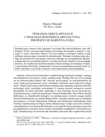 Teologia w Polsce 8,2 (2014), s. 191-205 Marcin Walczak* WT KUL, Lublin TEOLOGIA SEKULARYZACJI I TEOLOGIA POSTSEKULARYZACYJNA. PROPOZYCJE HARVEYA COXA Sekularyzacja stanowi dziś ogromne wyzwanie dla chrześcijaństwa oraz dla teologii. Proces zeświecczania kultury prowokuje do pytania o miejsce i rolę wiary w życiu człowieka. Harvey Cox jest jednym z teologów, którzy swoją refleksję umieszczają w kontekście sekularyzacji. Teologia i sekularyzacja okazują się przedziwnie powiązane: pierwsza domaga się uwzględnienia drugiej, a druga staje się zrozumiała jedynie w świetle pierwszej. Intuicje Coxa pomagają dostrzec, że współczesny kontekst niejako zmusza teologię do realnego związku z egzystencją człowieka. Dogmatyka w świecie postsekularyzacyjnym musi na nowo odzyskać swój ścisły związek z doświadczeniem chrześcijańskim. Jednym z kluczowych elementów współczesnego kontekstu teologii i samego chrześcijaństwa jest proces zwany sekularyzacją. Według Harveya Coxa polega on na zeświecczaniu kultury lub, mówiąc precyzyjniej, na uniezależnianiu się coraz większych przestrzeni życia i działania człowieka spod wpływów religijnych1. Namysł nad samym fenomenem sekularyzacji obejmuje dziedziny filozofii, politologii, etyki, socjologii, psychologii. Z czasem również teologowie zaczęli przyglądać się temu zjawisku, upatrując w nim istotnego locum theologicum. Najważniejszymi z nich byli protestanci: Dietrich Bonhoeffer, Paul Tillich, Rudolf Bultmann, a z katolickich teologów na sekularyzację zwrócili uwagę choćby Edward Schillebeeckx czy Johann Baptist Metz. Teologia sekularyzacji to dziedzina prowadząca w świetle Objawienia refleksję nad fenomenem odchodzenia ludzi i kultury współczesnej od religii. Sama sekularyzacja wydaje się na tyle istotnym i nieuchronnym wyzwaniem dla Kościoła, że nie sposób uznać ją jedynie za pewien przypadłościowy element, który można ewentualnie uwzględnić w dzisiejszej teologii. Sekularyzacja ma bowiem tak kolosalne znaczenie dla współczesnej myśli * 1 Marcin Walczak (ur. 1990) − doktorant w Instytucie Teologii Dogmatycznej KUL; e-mail: [email protected]. Por. H. Cox, The Secular City, New York 1965, s. 17; por. M. Marczewski, J. Mariański, Sekularyzacja, EK 17, Lublin 2012, kol. 1374-1376. Marcin Walczak teologicznej, że można wręcz mówić o potrzebie teologii postsekularyzacyjnej, czyli takiej teologii, która konstruuje się już nie w zderzeniu z heretyckimi nurtami, jak to było w epoce Ojców Kościoła, lecz w zderzeniu z absolutnie świecką kulturą współczesną. Teologiem, który z jednej strony był jednym z pierwszych przedstawicieli teologicznego namysłu nad samą sekularyzacją, a z drugiej podejmował próbę tworzenia teologii z uwzględnieniem przemian sekularyzacyjnych w świecie, jest amerykański baptysta Harvey Cox2. Przez swój wkład w refleksję teologiczną na temat sekularyzacji zasługuje na szczególną uwagę. Dziwi zatem, że w polskiej teologii Cox pozostaje raczej niezauważany. Jego zasadnicze intuicje zostaną przedstawione w niniejszym artykule. Zostanie też pokrótce ukazana droga, jaką przeszła refleksja nad sekularyzacją, zanim doszło do rozwoju tak zwanej teologii sekularyzacji. Pomoże to zrozumieć samą myśl Coxa i umieścić ją w nurcie szerokiego namysłu nad zeświecczeniem kultury. Omawiany teolog podejmuje bowiem wprost wiele idei zapoczątkowanych przez takich myślicieli, jak: Nietzsche, Weber, Bonhoeffer, Gogarten czy Tillich3. ZARYS DZIEJÓW REFLEKSJI NAD SEKULARYZACJĄ Można uznać, że swego rodzaju prekursorem, czy wręcz postacią profetyczną dla namysłu nad sekularyzacją, był Fryderyk Nietzsche4. W jego Wiedzy radosnej odnaleźć można znane sformułowanie, które stało się znamienne dla całej 2 3 4 H. Cox urodził się w 1929 roku w Malvern w stanie Pensylwania. Oprócz sekularyzacji tematami jego badań były choćby teologia wyzwolenia, dialog międzyreligijny i ruch zielonoświątkowy. Do przejścia na emeryturę w 2009 roku wykładał w Harvard Divinity School. Por. biogram naukowy na stronie uczelni: http://www.hds.harvard.edu/people/faculty/harvey-g-cox-jr [dostęp: 26.03.2014]. Trzeba zaznaczyć, iż kanon kluczowych nazwisk i etapów refleksji nad sekularyzacją jest dyskusyjny. W niniejszym artykule zostały wymienione szczególnie te postaci, których myśl pomaga umiejscowić i zrozumieć propozycje H. Coxa. Andrzej Napiórkowski w swoim artykule wskazuje na zasadniczą rolę innych myślicieli, niż jest to zaproponowane tutaj. Jako prekursorów myśli sekularyzacyjnej przedstawia np. Davida Hume’a, G.W. Hegla i L. Feuerbacha. Z kolei w dziedzinie teologicznej już refleksji nad sekularyzacją zwraca uwagę na znaczenie myśli K. Bartha. Por. A. Napiórkowski, Współczesny sekularyzm a teologia sekularyzacji jako wyzwania dla wiary, „Teologia Praktyczna” 14 (2013), s. 17-39. Natomiast W. Kulbat akcentuje głównie rolę samych teologów sekularyzacji, szczególnie wskazując na Bultmanna i Metza. Prezentuje także interesujące poglądy amerykańskiego filozofa religii Louisa Dupré. Por. W. Kulbat, Nowe koncepcje sekularyzacji w perspektywie teologicznej, „Łódzkie Studia Teologiczne” 19 (2010), s. 117-144. Nota bene, zarówno Napiórkowski, jak i Kulbat jedynie zdawkowo wspominają o Coksie. Wpływ Nietzschego na teologię sekularyzacji pozostaje niekwestionowany. Szczególnie wyraźny jest wpływ tego filozofa na myśl D. Bonhoeffera, który z kolei niejako patronuje całemu nurtowi teologii sekularyzacji. Sam Cox odwołuje się wprost do postulatów Bonhoeffera, uważając się za jego spadkobiercę. Por. H. Cox, The Secular City, s. 241. 192 TwP 8,2 (2014) Teologia sekularyzacji i teologia postsekularyzacyjna kultury nadchodzącego XX stulecia. Nietzsche pisze: „Bóg umarł! Bóg nie żyje! Myśmy go zabili!”5. Pisząc o umierającym Bogu, Nietzsche stał się zwiastunem zmi