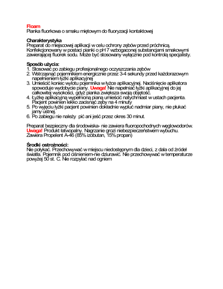 Floam Pianka fluorkowa o smaku miętowym do fluoryzacji kontaktowej Charakterystyka Preparat do miejscowej aplikacji w celu ochrony zębów przed próchnicą. Konfekcjonowany w postaci pianki o pH 7 wzbogaconej substancjami smakowymi zawierającej fluorek sodu. Może być stosowany wyłącznie pod kontrolą specjalisty. Sposób użycia: 1. Stosować po zabiegu profesjonalnego oczyszczania zębów 2. Wstrząsnąć pojemnikiem energicznie przez 3-4 sekundy przed każdorazowym napełnieniem łyżki aplikacyjnej 3. Umieścić koniec wylotu pojemnika w łyżce aplikacyjnej. Naciśnięcie aplikatora spowoduje wydobycie piany. Uwaga! Nie napełniać łyżki aplikacyjnej do jej całkowitej wysokości, gdyż pianka zwiększa swoją objętość. 4. Łyżkę aplikacyjną wypełnioną pianą umieścić natychmiast w ustach pacjenta. Pacjent powinien lekko zacisnąć zęby na 4 minuty 5. Po wyjęciu łyżki pacjent powinien dokładnie wypluć nadmiar piany, nie płukać jamy ustnej. 6. Po zabiegu nie należy pić ani jeść przez okres 30 minut. Preparat bezpieczny dla środowiska- nie zawiera fluoropochodnych węglowodorów. Uwaga! Produkt łatwopalny. Nagrzanie grozi niebezpieczeństwem wybuchu. Zawiera Propelent A-46 (85% izobutan, 15% propan) Środki ostrożności: Nie połykać. Przechowywać w miejscu niedostępnym dla dzieci, z dala od źródeł światła. Pojemnik pod ciśnieniem-nie dziurawić. Nie przechowywać w temperaturze powyżej 50 st. C. Nie rozpylać nad ogniem