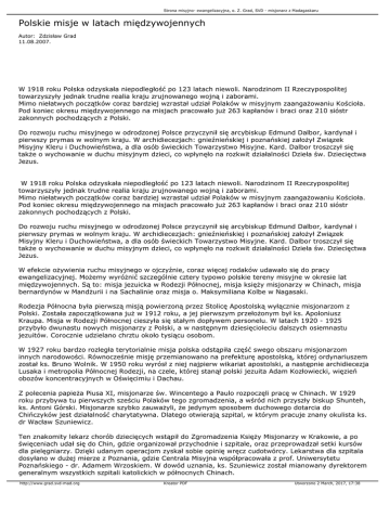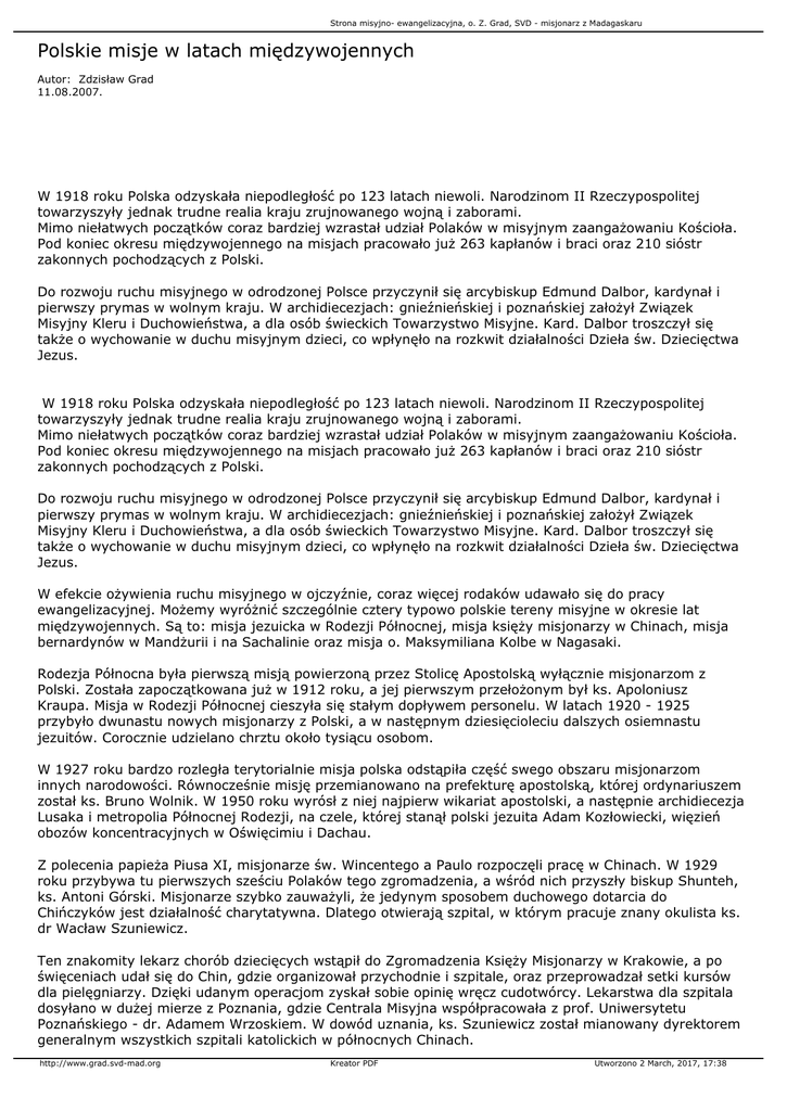 Strona misyjno- ewangelizacyjna, o. Z. Grad, SVD - misjonarz z Madagaskaru Polskie misje w latach międzywojennych Autor: Zdzisław Grad 11.08.2007. W 1918 roku Polska odzyskała niepodległość po 123 latach niewoli. Narodzinom II Rzeczypospolitej towarzyszyły jednak trudne realia kraju zrujnowanego wojną i zaborami. Mimo niełatwych początków coraz bardziej wzrastał udział Polaków w misyjnym zaangażowaniu Kościoła. Pod koniec okresu międzywojennego na misjach pracowało już 263 kapłanów i braci oraz 210 sióstr zakonnych pochodzących z Polski. Do rozwoju ruchu misyjnego w odrodzonej Polsce przyczynił się arcybiskup Edmund Dalbor, kardynał i pierwszy prymas w wolnym kraju. W archidiecezjach: gnieźnieńskiej i poznańskiej założył Związek Misyjny Kleru i Duchowieństwa, a dla osób świeckich Towarzystwo Misyjne. Kard. Dalbor troszczył się także o wychowanie w duchu misyjnym dzieci, co wpłynęło na rozkwit działalności Dzieła św. Dziecięctwa Jezus. W 1918 roku Polska odzyskała niepodległość po 123 latach niewoli. Narodzinom II Rzeczypospolitej towarzyszyły jednak trudne realia kraju zrujnowanego wojną i zaborami. Mimo niełatwych początków coraz bardziej wzrastał udział Polaków w misyjnym zaangażowaniu Kościoła. Pod koniec okresu międzywojennego na misjach pracowało już 263 kapłanów i braci oraz 210 sióstr zakonnych pochodzących z Polski. Do rozwoju ruchu misyjnego w odrodzonej Polsce przyczynił się arcybiskup Edmund Dalbor, kardynał i pierwszy prymas w wolnym kraju. W archidiecezjach: gnieźnieńskiej i poznańskiej założył Związek Misyjny Kleru i Duchowieństwa, a dla osób świeckich Towarzystwo Misyjne. Kard. Dalbor troszczył się także o wychowanie w duchu misyjnym dzieci, co wpłynęło na rozkwit działalności Dzieła św. Dziecięctwa Jezus. W efekcie ożywienia ruchu misyjnego w ojczyźnie, coraz więcej rodaków udawało się do pracy ewangelizacyjnej. Możemy wyróżnić szczególnie cztery typowo polskie tereny misyjne w okresie lat międzywojennych. Są to: misja jezuicka w Rodezji Północnej, misja księży misjonarzy w Chinach, misja bernardynów w Mandżurii i na Sachalinie oraz misja o. Maksymiliana Kolbe w Nagasaki. Rodezja Północna była pierwszą misją powierzoną przez Stolicę Apostolską wyłącznie misjonarzom z Polski. Została zapoczątkowana już w 1912 roku, a jej pierwszym przełożonym był ks. Apoloniusz Kraupa. Misja w Rodezji Północnej cieszyła się stałym dopływem personelu. W latach 1920 - 1925 przybyło dwunastu nowych misjonarzy z Polski, a w następnym dziesięcioleciu dalszych osiemnastu jezuitów. Corocznie udzielano chrztu około tysiącu osobom. W 1927 roku bardzo rozległa terytorialnie misja polska odstąpiła część swego obszaru misjonarzom innych narodowości. Równocześnie misję przemianowano na prefekturę apostolską, której ordynariuszem został ks. Bruno Wolnik. W 1950 roku wyrósł z niej najpierw wikariat apostolski, a następnie archidiecezja Lusaka i metropolia Północnej Rodezji, na czele, której stanął polski jezuita Adam Kozłowiecki, więzień obozów koncentracyjnych w Oświęcimiu i Dachau. Z polecenia papieża Piusa XI, misjonarze św. Wincentego a Paulo rozpoczęli pracę w Chinach. W 1929 roku przybywa tu pierwszych sześciu Polaków tego zgromadzenia, a wśród nich przyszły biskup Shunteh, ks. Antoni Górski. Misjonarze szybko zauważyli, że jedynym sposobem duchowego dotarcia do Chińczyków jest działalność charytatywna. Dlatego otwierają szpital, w którym pracuje znany okulista ks. dr Wacław Szuniewicz. Ten znakomity lekarz chorób dziecięcych wstąpił do Zgromadzenia Księży Misjonarzy w Krakowie, a po święceniach udał się do Chin, gdzie organizował przychodnie i szpitale, oraz przeprowadzał setki kursów dla pielęgniarzy. Dzięki udanym operacjom zyskał sobie opinię wręcz cudotwórcy. Lekarstwa dla szpitala dosyłano w dużej mierze z Poznania, gdzie Centrala Misyjna współpracowała z prof. Uniwersytetu Poznańskiego - dr. Adamem Wrzoskiem. W dowód uznania, ks. Szuniewicz został mianowany dyrektorem generalnym wszystkich szpitali katolickich w północnych Chinach. http://www.grad.svd-mad.org Kreator PDF Utworzono 2 March, 2017, 17:38 Strona misyjno- ewangelizacyjna, o. Z. Grad, SVD - misjonarz z Madagaskaru Pracę misyjną w Państwie Środka podejmowali Polacy należący także do innych zakonów. Działali tu m.in. dominikanie i werbiści. Wśród tych ostatnich warto wymienić, pochodzącego ze Śląska, o. Franciszka Białasa, który założył Katolicki Uniwersytet Fu-Jen w Pekinie oraz czasopismo i instytut sinologiczny „Monumenta Serica”. W Chinach pracowali też jego współbracia: o. Augustyn Zmarzły i o. Ludwik Gołąb. Najwybitniejszą polską i katolicką placówką na Dalekim Wschodzie była parafia harbińska w Mandżurii, która liczyła 5 tys. wiernych. Miasto to zostało założone przez Rosjan w związku z budową kolei wschodniochińskiej i było miejscem pracy wielu zesłanych Polaków. W Harbinie powstało gimnazjum polskie i przez pewien czas istniało nawet niższe seminarium, przeniesione tu z Władywostoku. Proboszcz parafii harbińskiej redagował „Tygodnik Polski”. W duszpasterstwie, oprócz kilku polskich kapłanów, pracowały także polskie siostry zakonne. W 1924 roku administratorem wikariatu apostolskiego Syberii z siedzibą właśnie w Harbinie został franciszkanin, o. Gerard Piotrowski, wcześniej gorliwie apostołujący w Chinach. Po pięciu latach polecono mu zorganizowanie nowej placówki w Japonii na wyspie Karafuto, noszącej też nazwę Sachalin. W Japonii pracował już inny franciszkanin o. Angellus Kowarz, który został wysłany na Sachalin, by zaopatrywać potrzeby duchowe garstki Polaków, a jednocześnie rozwinąć misję wśród kolonistów japońskich. W 1932 roku Sachalin, z 560 katolikami, stał się niezależną prefekturą apostolską Karafuto. Ci