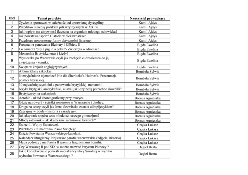 kod 1 2 3 4 5 6 7 8 9 10 11 12 13 14 15 16 17 18 19 20 21 22 23 24 25 26 27 28 Temat projektu Żywienie sportowca w zależności od uprawianej dyscypliny. Przedstaw sukcesy polskich piłkarzy ręcznych w XXI w. Jaki wpływ ma aktywność fizyczna na organizm młodego człowieka? Jak powstawał sport? Historia w ciekawostkach. Przedstaw nowoczesne formy aktywności fizycznej. Prównanie panowania Elżbiety I Elżbiety II Co oznacza 'buy a pig in a poke?'- Zwierzęta w idiomach. Monarchia Brytyjska teraz i kiedyś Wycieczka po Warszawie czyli jak zachęcić cudzoziemca do jej zwiedzenia - komiks. Święta w krajach anglojęzycznych Album:Klany szkockie. Niewyjaśnione tajemnice? Nie dla Sherlocka'a Holmes'a. Prezentacja postaci literackiej. 30 najważniejszych dni z panowania brytyjskiej monarchii Języka brytyjski, amerykański, australijski-czy będą potrzebne słowniki? Brytyjczycy na wakacjach. Aerobic - układ choreograficzny przy muzyce. Gdzie na rower? - ścieżki rowerowe w Warszawie i okolicy. Droga na szczyt czyli jak Irena Szewińska została olimpijczykiem? Zagrajmy w boule - historia i zasady gry. Jak aktywnie spędza czas młodzież naszego gimnazjum? Młody ratownik - jak skutecznie zatamowac krwotok? Święci II Wojny Światowej. Przekłady i tłumaczenia Pisma Świętego. Księża Powstania Warszawskiego-kapelani. Kalendarz liturgiczny. Najstarsze parafie warszawskie (zdjęcia, historia). Mapa podróży Jana Pawła II razem z fragmentami homilii. Czy Warszawę II poł.XIX w można nazwać Paryżem Północy ? Jakie konsekwencje ponieśli mieszkańcy ulicy Smolnej w wyniku wybuchu Powstania Warszawskiego ? Nauczyciel prowadzący Kamil Ajdys Kamil Ajdys Kamil Ajdys Kamil Ajdys Kamil Ajdys Bigda Ewelina Bigda Ewelina Bigda Ewelina Bigda Ewelina Bigda Ewelina Bombała Sylwia Bombała Sylwia Bombała Sylwia Bombała Sylwia Bombała Sylwia Bornus Agnieszka Bornus Agnieszka Bornus Agnieszka Bornus Agnieszka Bornus Agnieszka Bornus Agnieszka Czajka Łukasz Czajka Łukasz Czajka Łukasz Czajka Łukasz Czajka Łukasz Degiel Beata Degiel Beata 29 30 31 32 33 34 35 36 37 38 39 40 41 42 43 44 45 46 47 48 49 50 51 52 Dlaczego wybuchło Powstanie Warszawskie ? W jaki sposób Warszawiacy walczyli z okupantem niemieckim ? Represje niemieckie na Polakach w czasie II wojny światowej Czym zachwyca oraz przeraża fauna Ameryki Południowej? Unde malum? (Skąd zło?) Rozważ problem na podstawie koncepcji wybranych filozofów. Jaki obraz miasta nowoczesnego wyłania się z Ziemi obicanej Jaki wpływ wywarła teoria Freuda na współczesną kulturę? Rozważ problem na wybranych przykładach. Jaki obraz Szatana kreuje Michaił Bułhakow w powieści Mistrz i Małgorzata ? W jaki sposób ukazany został Bóg w Hymnach Jana Kasprowicza? Embrion czy człowiek? Początek życia jako problem filozoficzny. Jakie były źródła postaw dekadenckich w kulturze na przełomie XIX i XX wieku? Jakie są przyczyny fascynacji epoką wiktoriańską w kulturze współczesnej? Jakie czynniki sprzyjają a jakie zagrażają zdrowiu nastolatka? Fenomen biegania-dlaczego jego popularnosc rośnie? Zaproponuj zestaw ćwiczeń kształtujących prawidłową postawę z przyborem. Zaprezentuj historię,tradycję i sukcesy Warszawskiego Klubu Wioślarskiego. Na czym polega zdrowe żywienie nastolatka? Język komentatorów sportowych. Czy możemy nauczyć się j.polskiego z internetu? Śladami skamandrytów po Warszawie. Czy w Śródmieściu można przyjemnie i pożytecznie spędzić czas? Dlaczego jesteśmy podatni na reklamę? Język reklamy. Literackie Powiśle. Na obiedzie czwartkowym u króla Stasia. Inscenizacja. Degiel Beata Degiel Beata Degiel Beata Deniziak Michał Deniziak Michał Deniziak Michał Deniziak Michał Deniziak Michał Deniziak Michał Deniziak Michał Deniziak Michał Deniziak Michał Dorociak Marzena Dorociak Marzena Dorociak Marzena Dorociak Marzena Dorociak Marzena Filocha Magdalena Filocha Magdalena Filocha Magdalena Filocha Magdalena Filocha Magdalena Floriańczyk Wanda Floriańczyk Wanda 53 54 55 56 57 58 59 60 61 62 63 64 65 66 67 68 69 70 71 72 73 74 75 76 77 78 79 80 81 Jeden dzień w rosyjskiej szkole w Klerykowie. Inscenizacja. Wiosna w poezji i piosence. Inscenizacja. Dlaczego Ogród Saski odgrywał dużą rolę w historii Warszawy? Pokolenie Kolumbów. Gazetka. Literacka Warszawa w okresie pozytywizmu. Jaki wpływ miały osiągnięcia sztuki średniowiecznej na dalszy rozwój architektury, rzeźby Po co nam ten artysta? - rola artysty w społeczeństwie. Polskie święta w kulturze ludowej na podstawie wybranego regionu Polski. Sztuka-jak zrobić coś z niczego-recykling. Ciekawoski architektoniczne Warszawy-fotoreportaż. Motyw anioła. Znajdź wybrane przykłady na przestrzeni różnych epok i wskaż funkcje tego motywu. Rola ilustracji w książkach. Sam zostaję ilustratorem. Jakie ślady francuskie możemy odkryć w Warszawie? Jakie symbole Francji znamy i co one oznaczają? Czego możemy się dowiedzieć od Mikołajka i jego kumpli? Jakie francuskie katedry znamy i co w nich odkrywamy? Jakie słynne osoby związane z Polską i Francją znamy? Pokolenie Kolumbów. Gazetka. Jakie utwory muzyczne można omawiać na lekcjach języka polskiego? Nowe zakończenia omawianych lektur. Nasz tomik poezji miłosnej. Tworzymy współczesne wersje naszych lektur (inscenizacja). Z którymi mijscami w Warszawie związany był F. Chopin? Film. Jak wyglądały podróże F. Chopina po Polsce?- wystawa. Czy dostrzegasz w swoim otoczeniu skutek XV-XVI-wiecznych odkryć geograficznych? Piosenka gimnazjalisty - zespół wokalny lub wokalno - instrumentalny. Jaką rolę w historii Polski pełniła Mennica Warszawska? Warszawa dziś i wczoraj. Porównanie na podstawie obrazów Canaletta. Najciekawsze instrumenty świata - prezentacja multimedialna. Floriańczyk Wanda Floriańczyk Wanda Floriańczyk Wanda Floriańczyk Wanda Floriańczyk Wanda Joanna Jaworska - Nizioł Joanna Jaworska - Nizioł Joanna Jawors