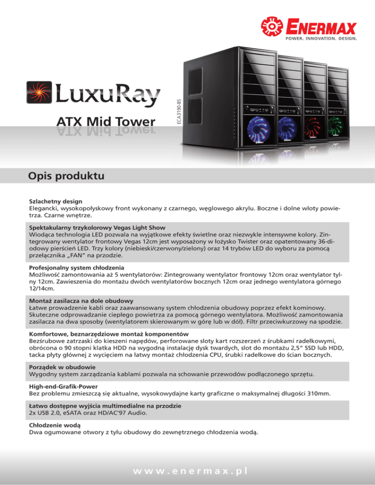 ECA3190-BS ATX Mid Tower Opis produktu Szlachetny design Elegancki, wysokopołyskowy front wykonany z czarnego, węglowego akrylu. Boczne i dolne wloty powietrza. Czarne wnętrze. Spektakularny trzykolorowy Vegas Light Show Wiodąca technologia LED pozwala na wyjątkowe efekty świetlne oraz niezwykle intensywne kolory. Zintegrowany wentylator frontowy Vegas 12cm jest wyposażony w łożysko Twister oraz opatentowany 36-diodowy pierścień LED. Trzy kolory (niebieski/czerwony/zielony) oraz 14 trybów LED do wyboru za pomocą przełącznika „FAN” na przodzie. Profesjonalny system chłodzenia Możliwość zamontowania aż 5 wentylatorów: Zintegrowany wentylator frontowy 12cm oraz wentylator tylny 12cm. Zawieszenia do montażu dwóch wentylatorów bocznych 12cm oraz jednego wentylatora górnego 12/14cm. Montaż zasilacza na dole obudowy Łatwe prowadzenie kabli oraz zaawansowany system chłodzenia obudowy poprzez efekt kominowy. Skuteczne odprowadzanie ciepłego powietrza za pomocą górnego wentylatora. Możliwość zamontowania zasilacza na dwa sposoby (wentylatorem skierowanym w górę lub w dół). Filtr przeciwkurzowy na spodzie. Komfortowe, beznarzędziowe montaż komponentów Bezśrubowe zatrzaski do kieszeni napędów, perforowane sloty kart rozszerzeń z śrubkami radełkowymi, obrócona o 90 stopni klatka HDD na wygodną instalację dysk twardych, slot do montażu 2,5” SSD lub HDD, tacka płyty głównej z wycięciem na łatwy montaż chłodzenia CPU, śrubki radełkowe do ścian bocznych. Porządek w obudowie Wygodny system zarządzania kablami pozwala na schowanie przewodów podłączonego sprzętu. High-end-Grafik-Power Bez problemu zmieszczą się aktualne, wysokowydajne karty graficzne o maksymalnej długości 310mm. Łatwo dostępne wyjścia multimedialne na przodzie 2x USB 2.0, eSATA oraz HD/AC’97 Audio. Chłodzenie wodą Dwa ogumowane otwory z tyłu obudowy do zewnętrznego chłodzenia wodą. www.enermax.pl Wiodąca technologia LED: Trzykolorowy Vegas Light Show M1 M2 M3 M4 M5 M6 M7 M8 M9 M10 M11 M12 M13 M14 M1: Niebieski – all LEDs on M2: Czerwony – all LEDs on M3: Zielony – all LEDs on M4: Combo – trzykolorowe podświetlenie M5: Niebieski – Propeller M6: Niebieski – Triple Propeller M7: Czerwony –Propeller M8: Czerwony – Triple Propeller M9: Zielony – Propeller M10: Zielony – Triple Propeller M11: Combo –Propeller M12: Combo – Triple Propeller M13: Vegas (1-4 na przemian) M14: All LEDs off Uwagi: Wentylator jest wyposażony w funkcję pamięci, która zapisuje wybrany przed wyłączeniem systemu tryb LED. Aby wyłączyć podświetlenie, można naciśnąć przycisk „FAN” na przednim panelu obudowy przez ok. 3 sekundy. Profesjonalny system chłodzenia Maksymalna długość VGA TYŁ Wylot powietrza 1x wentylator 12cm do chłodzenia CPU/VGA GÓRA Wylot powietrza 1x wentylator 12cm lub 14cm do chłodzenia CPU FRONT Wlot powietrza 1x wentylator 12cm do chłodzenia HDD BOK Wlot powietrza 2x wentylatory 12cm do chłodzenia CPU/VGA Pozwala na instalację kart graficznych o maksymalnej długości 310mm. Dane techniczne Model ECA3190-BS Typ obudowy ATX Midi Tower Wymiary (mm) T470 x B200 x H445 Materiał SECC Kieszenie na dysk ODD 5x HDD 5x SDD 1x Standard płyty głównej ATX & Micro ATX Front I/O 2x USB 2.0, eSATA, HD/AC’97 Audio Chłodzenie powietrzem front 1x wentylator Vegas 12cm zintegrowany tył 1x wentylator 12cm zintegrowany góra 1x wentylator 12/14cm opcjonalny bok 2x wentylatory 12cm opcjonalne Ilość slotów na karty rozszerzeń 7 Otwory do chłodzenia wodą 2 www.enermax.pl Sprawdzona jakość
