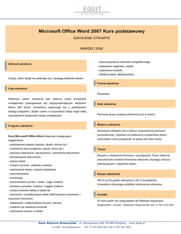 Microsoft Office Word 2007 Kurs podstawowy SZKOLENIE OTWARTE MARZEC 2009 - wykorzystywanie słownika ortograficznego Adresat szkolenia - ustawianie nagłówka i stopki - ustawienia drukarki - drukowanie dokumentu. Osoby, które dotąd nie zetknęły się z obsługą edytorów tekstu. Forma szkolenia Cele szkolenia Warsztaty Głównym celem szkolenia jest nabycie przez kursantów umiejętności posługiwania się najpopularniejszym edytorem Data szkolenia tekstu MS Word. Uczestnicy zapoznają się z podstawami obsługi programu, dzięki czemu w przyszłości będą mogli dalej Pierwsze grupy zostaną utworzone juŜ w marcu. samodzielnie doskonalić swoje umiejętności. Miejsce szkolenia Program szkolenia Szkolenie odbędzie się w dobrze wyposaŜonej pracowni komputerowej. ZaleŜnie od preferencji uczestników jedno Kurs Microsoft Office Word obejmuje następujące stanowisko moŜe przypadać na jedną lub dwie osoby. zagadnienia: - podstawowe pojęcia (spacja, akapit, strona itp.) - omówienie okna programu (paski, ikony itp.) Trener - operacja otwierania, zapisywania i zamykania dokumentu Ekspert w dziedzinie finansów i zarządzania. Przez wiele lat - formatowanie dokumentu pracował jako analityk finansowy aktywnie uŜywając arkuszy - edycja tekstu kalkulacyjnych i edytorów tekstu. - zmiana czcionki, wielkości znaków - wyrównanie tekstu, wcięcia akapitowe - wypunktowanie Koszt szkolenia - numeracja 300 zł za 20 godzin lekcyjnych (20 zł za godzinę). - wyszukiwanie wyrazu, znaku, ciągu znaków Uczestnicy otrzymają certyfikat ukończenia szkolenia. - zamiana wyrazów, znaków i ciągów znaków - zmiana kolorów tekstu a takŜe tła - tworzenie i modyfikowanie tabel (definiowanie szerokości i wysokości komórek) Kontakt W razie pytań lub uwag jestem do Państwa dyspozycji: - dodawanie i odejmowanie kolumn, wierszy Organizator i trener: Wojciech Moszczyński tel. 0 791 513 822 - scalanie lub dzielenie komórek - sortowanie danych w tabeli Equit Wojciech Moszczyński ul. Warszawska 52B, 05-805 Otrębusy e-mail: [email protected] www.equit.pl tel. 0 725 926 463 lub 0 791 513 822