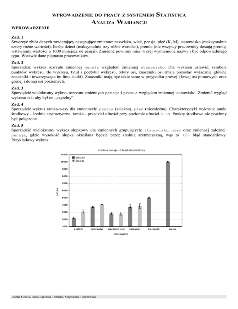 WPROWADZENIE DO PRACY Z SYSTEMEM STATISTICA ANALIZA WARIANCJI WPROWADZENIE Zad. 1 Stworzyć zbiór danych zawierający następujące zmienne: nazwisko, wiek, pensja, płeć (K, M), stanowisko (maksymalnie cztery różne wartości), liczba dzieci (maksymalnie trzy różne wartości), premia (nie wszyscy pracownicy dostają premię, wstawiamy wartości o 1000 mniejsze od pensji). Zmienne powinny mieć wyżej wymienione nazwy i być odpowiedniego typu. Wstawić dane piętnastu pracowników. Zad. 2 Sporządzić wykres rozrzutu zmiennej pensja względem zmiennej stanowisko. Dla wykresu ustawić: symbole punktów wykresu, tło wykresu, tytuł i podtytuł wykresu, tytuły osi, znaczniki osi (mają pozostać wyłącznie główne znaczniki i towarzyszące im linie siatki). Znaczniki mają być takie same w przypadku prawej i lewej osi pionowych oraz górnej i dolnej osi poziomych. Zad. 3 Sporządzić wielokrotny wykres rozrzutu zmiennych pensja i premia względem zmiennej stanowisko. Zmienić wygląd wykresu tak, aby był on „czytelny”. Zad. 4 Sporządzić wykres ramka-wąsy dla zmiennych: pensja (zależna), płeć (niezależna). Charakterystyki wykresu: punkt środkowy - średnia arytmetyczna, ramka - przedział ufności przy poziomie ufności 0.99. Punkty środkowe nie powinny być połączone. Zad. 5 Sporządzić wielokrotny wykres słupkowy dla zmiennych grupujących: stanowisko, płeć oraz zmiennej zależnej: pensja, gdzie wysokość słupka określana będzie przez średnią arytmetyczną, wąs to +/- błąd standardowy. Przykładowy wykres: średnia pensja +/- błąd standardowy 11000 10000 plec: M plec: K 9000 8000 pensja 7000 6000 5000 4000 3000 2000 1000 analityk informatyk przedstaw iciel stanowisko Joanna Gościk, Anna Łupińska-Dubicka, Magdalena Topczewska księgow y kierow nik prezes ANALIZA WARIANCJI Zadanie 1 W pliku powiaty.sta umieszczone są dane dotyczące przyrostu naturalnego oraz liczby mieszkańców na km 2 z uwzględnieniem podziału na województwa i rodzaj powiatu (miejskie, wewnętrzne i graniczne) na rok 2000. Na poziomie istotności 0.05 i 0.01 zweryfikować hipotezę, że przeciętny przyrost naturalny w powiatach miejskich, wewnętrznych i granicznych jest taki sam. 1. Przy użyciu testów: • Levene'a, • Cochrana, Bartletta i Hartleya. sprawdzić, czy spełnione są założenia testu analizy wariancji. Sporządzić wykres normalności rozkładu zmiennej zależnej w obrębie każdej z grup. ANOVA → Jednoczynnikowa ANOVA → opcja Więcej wyników → karta Założenia 2. Wyznaczyć średnie brzegowe i odchylenia standardowe oraz 95% przedziały ufności dla każdego efektu. Sporządzić wykres oczekiwanych średnich brzegowych. karta Podsumowanie → Statystyki podklas karta Podsumowanie → przycisk Średnie/Wykresy 3. Przeanalizować tabelę analizy wariancji. karta Podsumowanie → Wyniki jednowym. 4. Przy użyciu testu po fakcie Tukeya sprawdzić, która z metod powoduje odrzucenie hipotezy zerowej. karta Post-hoc → Istotne różnice 5. Wyznaczyć grupy jednorodne. karta Post-hoc → Jednorodne grupy Zadanie 2 W pliku nadcisnienie.sta zawarto porównanie czterech metod leczenia nadciśnienia. W badaniu wzięło udział 40 pacjentów, których losowo przypisano do jednej z porównywanych metod. W eksperymencie uwzględniono trzy nowe metody leczenia oraz metodę tradycyjną (IV). Oceniano zmiany ciśnienia rozkurczowego krwi po zastosowaniu leczenia. Wartości ujemne oznaczają wzrost ciśnienia. Zweryfikować hipotezę o braku różnic pomiędzy badanymi metodami leczenia. 1. Wyznaczyć tabelę analizy wariancji. 2. Wyznaczyć średnie grupowe dla zmian ciśnienia przy zastosowaniu metod leczenia. Sporządzić skategoryzowane wykresy ramka-wąsy. Czy można stwierdzić, że nowe metody leczenia są lepsze od tradycyjnej? Odpowiedź należy uzasadnić. karta średnie → obserwowane, nieważone → obserwowane, ważone → oczekiwane, brzegowe Wykresy → wykresy skategoryzowane → ramka wąsy zakładka Więcej → wąs: min-maks właściwości wykresu → kategoryzacja → wygląd kategorii: nałożone 3. W jakim stopniu znajomość zastosowanej metody wyjaśnia zmiany ciśnienia u pacjenta? Ocenę siły zależności w próbie określa następujący wzór: SS efekt 2 = ⋅100 SS całkowite gdzie: SSefekt - suma kwadratów związana z danym efektem SScałkowite - całkowita suma kwadratów dane bierzemy z karta Podsumowanie → Wyniki jednowym. Joanna Gościk, Anna Łupińska-Dubicka, Magdalena Topczewska Zadanie 3 Plik miazdzyca.sta zawiera dane o 120 pacjentach, wśród których badano stężenie cholesterolu LDL. Chorzy leczeni byli czterema różnymi środkami farmakologicznymi aplikowanymi w pięciu różnych dawkach. Dodatkowo w trakcie leczenia stosowano dwa rodzaje diet. 1. Wyznaczyć tabelę analizy wariacji. (ANOVA → ANOVA dla układów czynnikowych → opcja Więcej wyników → karta Podsumowanie → Wszystkie efekty). Jaki wpływ ma poziom każdego z czynników na średnią wartość LDL? Jakie jest współdziałanie między parami czynników? Czy istnieje trójczynnikowa interakcja między rozpatrywanymi czynnikami? 2. Sporządzić wykresy średnich ważonych z uwzględnieniem błędów standardowych (z 99% przedziałami ufności) dla interakcji wszystkich par czynników. średnie/wykresy (ustawiamy poziom ufności) → średnie: ważone wyśw. +/- błd. std. NASTĘPNE ZAJĘCIA: ANALIZA REGRESJI Joanna Gościk, Anna Łupińska-Dubicka, Magdalena Topczewska