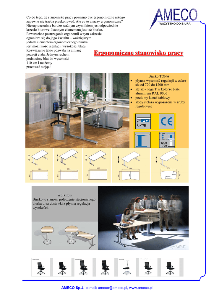 Co do tego, Ŝe stanowisko pracy powinno być ergonomiczne nikogo zapewne nie trzeba przekonywać. Ale co to znaczy ergonomiczne? Niezaprzeczalnie bardzo waŜnym czynnikiem jest odpowiednie krzesło biurowe. Istotnym elementem jest teŜ biurko. Powszechne postrzeganie ergonomii w tym zakresie ogranicza się do jego kształtu – waŜniejszym jednak elementem ergonomicznego biurka jest moŜliwość regulacji wysokości blatu. Rozwiązanie takie pozwala na zmianę pozycji ciała. Jednym ruchem podnosimy blat do wysokości 110 cm i moŜemy pracować stojąc! Ergonomiczne stanowisko pracy Biurko TONA • płynna wysokość regulacji w zakresie od 720 do 1200 mm • stelaŜ - noga T w kolorze białe aluminium RAL 9006 • poziomy kanał kablowy • stopy stelaŜa wyposaŜone w śruby regulacyjne Workflow Biurko to stanowi połączenie stacjonarnego biurka oraz dostawki z płynną regulacją wysokości. AMECO Sp.J. e-mail: [email protected], www.ameco.pl