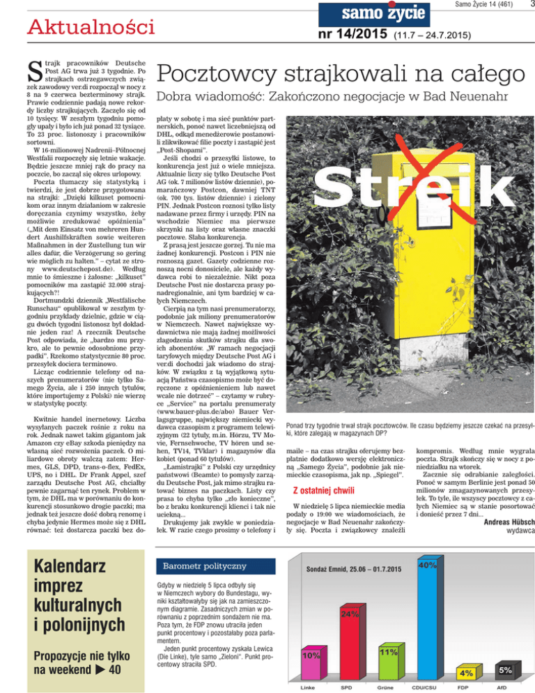 Samo Życie 14 (461) Aktualnoœci S trajk pracowników Deutsche Post AG trwa ju¿ 3 tygodnie. Po strajkach ostrzegawczych zwi¹zek zawodowy ver.di rozpocz¹³ w nocy z 8 na 9 czerwca bezterminowy strajk. Prawie codziennie padaj¹ nowe rekordy liczby strajkuj¹cych. Zaczê³o siê od 10 tysiêcy. W zesz³ym tygodniu pomog³y upa³y i by³o ich ju¿ ponad 32 tysi¹ce. To 23 proc. listonoszy i pracowników sortowni. W 16-milionowej Nadrenii–Pó³nocnej Westfalii rozpoczê³y siê letnie wakacje. Bêdzie jeszcze mniej r¹k do pracy na poczcie, bo zacz¹³ siê okres urlopowy. Poczta t³umaczy siê statystyk¹ i twierdzi, ¿e jest dobrze przygotowana na strajki: „Dziêki kilkuset pomocnikom oraz innym dzia³aniom w zakresie dorêczania czynimy wszystko, ¿eby mo¿liwie zredukowaæ opóŸnienia” („Mit dem Einsatz von mehreren Hundert Aushilfskräften sowie weiteren Maßnahmen in der Zustellung tun wir alles dafür, die Verzögerung so gering wie möglich zu halten.” – cytat ze strony www.deutschepost.de). Wed³ug mnie to œmieszne i ¿a³osne: „kilkuset” pomocników ma zast¹piæ 32.000 strajkuj¹cych?! Dortmundzki dziennik „Westfälische Runschau“ opublikowa³ w zesz³ym tygodniu przyk³ady dzielnic, gdzie w ci¹gu dwóch tygodni listonosz by³ dok³adnie jeden raz! A rzecznik Deutsche Post odpowiada, ¿e „bardzo mu przykro, ale to pewnie odosobnione przypadki”. Rzekomo statystycznie 80 proc. przesy³ek dociera terminowo. Licz¹c codziennie telefony od naszych prenumeratorów (nie tylko Samego ¯ycia, ale i 250 innych tytu³ów, które importujemy z Polski) nie wierzê w statystykê poczty. Kwitnie handel inernetowy. Liczba wysy³anych paczek roœnie z roku na rok. Jednak nawet takim gigantom jak Amazon czy eBay szkoda pieniêdzy na w³asn¹ sieæ rozwo¿enia paczek. O miliardowe obroty walcz¹ zatem: Hermes, GLS, DPD, trans-o-flex, FedEx, UPS, no i DHL. Dr Frank Appel, szef zarz¹du Deutsche Post AG, chcia³by pewnie zagarn¹æ ten rynek. Problem w tym, ¿e DHL ma w porównaniu do konkurencji stosunkowo drogie paczki; ma jednak te¿ jeszcze doœæ dobr¹ renomê i chyba jedynie Hermes mo¿e siê z DHL równaæ: te¿ dostarcza paczki bez do- Kalendarz imprez kulturalnych i polonijnych Propozycje nie tylko na weekend X 40 nr 14/2015 3 (11.7 – 24.7.2015) Pocztowcy strajkowali na ca³ego Dobra wiadomoœæ: Zakoñczono negocjacje w Bad Neuenahr p³aty w sobotê i ma sieæ punktów partnerskich, ponoæ nawet liczebniejsz¹ od DHL, odk¹d mened¿erowie postanowili zlikwikowaæ filie poczty i zast¹piæ jest „Post-Shopami”. Jeœli chodzi o przesy³ki listowe, to konkurencja jest ju¿ o wiele mniejsza. Aktualnie liczy siê tylko Deutsche Post AG (ok. 7 milionów listów dziennie), pomarañczowy Postcon, dawniej TNT (ok. 700 tys. listów dziennie) i zielony PIN. Jednak Postcon roznosi tylko listy nadawane przez firmy i urzêdy. PIN na wschodzie Niemiec ma pierwsze skrzynki na listy oraz w³asne znaczki pocztowe. S³aba konkurencja. Z pras¹ jest jeszcze gorzej. Tu nie ma ¿adnej konkurencji. Postcon i PIN nie roznosz¹ gazet. Gazety codzienne roznosz¹ nocni donosiciele, ale ka¿dy wydawca robi to niezale¿nie. Nikt poza Deutsche Post nie dostarcza prasy ponadregionalnie, ani tym bardziej w ca³ych Niemczech. Cierpi¹ na tym nasi prenumeratorzy, podobnie jak miliony prenumeratorów w Niemczech. Nawet najwiêksze wydawnictwa nie maj¹ ¿adnej mo¿liwoœci z³agodzenia skutków strajku dla swoich abonentów. „W ramach negocjacji taryfowych miêdzy Deutsche Post AG i ver.di dochodzi jak wiadomo do strajków. W zwi¹zku z t¹ wyj¹tkow¹ sytuacj¹ Pañstwa czasopismo mo¿e byæ dorêczone z opóŸnienieniem lub nawet wcale nie dotrzeæ” – czytamy w rubryce „Service” na portalu prenumeraty (www.bauer-plus.de/abo) Bauer Verlagsgruppe, najwiêkszy niemiecki wydawca czasopism z programem telewizyjnym (22 tytu³y, m.in. Hörzu, TV Movie, Fernsehwoche, TV hören und sehen, TV14, TVklar) i magazynów dla kobiet (ponad 60 tytu³ów). „£amistrajki” z Polski czy urzêdnicy pañstwowi (Beamte) to pomys³y zarz¹du Deutsche Post, jak mimo strajku ratowaæ biznes na paczkach. Listy czy prasa to chyba tylko „z³o konieczne”, bo z braku konkurencji klienci i tak nie uciekn¹... Drukujemy jak zwykle w poniedzia³ek. W razie czego prosimy o telefony i Barometr polityczny Gdyby w niedzielę 5 lipca odbyły się w Niemczech wybory do Bundestagu, wyniki kształtowałyby się jak na zamieszczonym diagramie. Zasadniczych zmian w porównaniu z poprzednim sondażem nie ma. Poza tym, że FDP znowu utraciła jeden punkt procentowy i pozostałaby poza parlamentem. Jeden punkt procentowy zyskała Lewica (Die Linke), tyle samo „Zieloni“. Punkt procentowy straciła SPD. Ponad trzy tygodnie trwał strajk pocztowców. Ile czasu będziemy jeszcze czekać na przesyłki, które zalegają w magazynach DP? maile – na czas strajku oferujemy bezp³atnie dodatkowo wersjê elektroniczn¹ „Samego ¯ycia”, podobnie jak niemieckie czasopisma, jak np. „Spiegel”. Z ostatniej chwili W niedzielê 5 lipca niemieckie media poda³y o 19:00 we wiadomoœciach, ¿e negocjacje w Bad Neuenahr zakoñczy³y siê. Poczta i zwi¹zkowcy znaleŸli Sondaż Emnid, 25.06 – 01.7.2015 kompromis. Wed³ug mnie wygra³a poczta. Strajk skoñczy siê w nocy z poniedzia³ku na wtorek. Zacznie siê odrabianie zaleg³oœci. Ponoæ w samym Berlinie jest ponad 50 milionów zmagazynowanych przesy³ek. To tyle, ile wszyscy pocztowcy z ca³ych Niemiec s¹ w stanie posortowaæ i donieœæ przez 7 dni... Andreas Hübsch wydawca