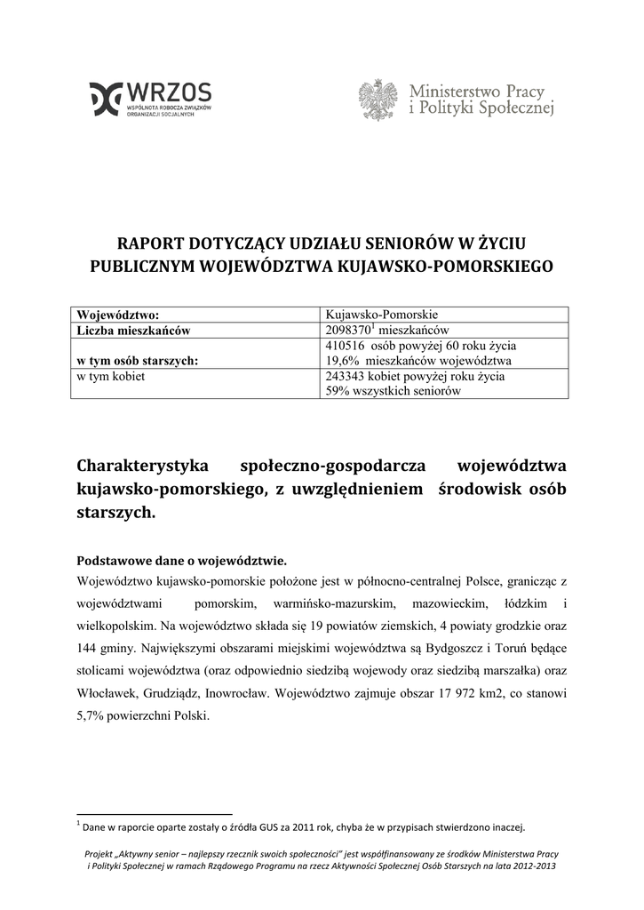 RAPORT DOTYCZĄCY UDZIAŁU SENIORÓW W ŻYCIU PUBLICZNYM WOJEWÓDZTWA KUJAWSKO-POMORSKIEGO Województwo: Liczba mieszkańców Kujawsko-Pomorskie 20983701 mieszkańców 410516 osób powyżej 60 roku życia 19,6% mieszkańców województwa 243343 kobiet powyżej roku życia 59% wszystkich seniorów w tym osób starszych: w tym kobiet Charakterystyka społeczno-gospodarcza województwa kujawsko-pomorskiego, z uwzględnieniem środowisk osób starszych. Podstawowe dane o województwie. Województwo kujawsko-pomorskie położone jest w północno-centralnej Polsce, granicząc z województwami pomorskim, warmińsko-mazurskim, mazowieckim, łódzkim i wielkopolskim. Na województwo składa się 19 powiatów ziemskich, 4 powiaty grodzkie oraz 144 gminy. Największymi obszarami miejskimi województwa są Bydgoszcz i Toruń będące stolicami województwa (oraz odpowiednio siedzibą wojewody oraz siedzibą marszałka) oraz Włocławek, Grudziądz, Inowrocław. Województwo zajmuje obszar 17 972 km2, co stanowi 5,7% powierzchni Polski. 1 Dane w raporcie oparte zostały o źródła GUS za 2011 rok, chyba że w przypisach stwierdzono inaczej. Projekt „Aktywny senior – najlepszy rzecznik swoich społeczności” jest współfinansowany ze środków Ministerstwa Pracy i Polityki Społecznej w ramach Rządowego Programu na rzecz Aktywności Społecznej Osób Starszych na lata 2012-2013 Strona |2 Ludność województwa Województwo kujawsko-pomorskie zamieszkuje 2098370 osób, z czego 52% kobiet oraz 48% mężczyzn. Większa część ( ok. 60%) osób zamieszkuje obszary miejskie. Dominującą grupą ludności są osoby w wieku produkcyjnym (pomiędzy 18 a 60 rokiem życia kobiety i 18 a 65 rokiem życia mężczyźni) stanowiące 64,4 % ogółu mieszkańców, natomiast osoby w wieku poprodukcyjnym ( powyżej 60 roku życia kobiety oraz 65 roku życia mężczyźni) stanowią 16, 6% mieszkańców (różnica z danymi podanymi w tabeli na wstępie polega na uwzględnieniu w nich mężczyzn pomiędzy 60 a 65 rokiem życia). Bardziej szczegółowy rozkład populacji jest następujący: Wykres 1: Wiek Jak widać na powyższym wykresie do grona seniorów w ciągu najbliższych kilku lat dołączy spora grupa osób, które obecnie są na ostatnim etapie swojej kariery zawodowej, czyli osoby pomiędzy 50 a 65 rokiem życia. W efekcie liczba osób w województwie w wieku poprodukcyjnym powoli będzie się zbliżać do 1/5 całej populacji. Województwo wykazuje także mały, aczkolwiek dodatni przyrost naturalny na 1000 osób wynoszący 0,63 ( dla Polski 0,34). Wśród mieszkańców występuje dosyć wysokie saldo migracji wewnętrznych i zagranicznych na pobyt stały na 1000 ludności wynoszące -0,8 (przy 0,11 dla Polski). Obecnie prognozy demograficzne przewidują stopniowy spadek ludności województwa do poniżej dwóch milionów mieszkańców w granicach 2030 roku2. 2 Kujawsko-Pomorskie Analizy Regionalne. Prognozy rozwoju województwa kujawsko-pomorskiego 2030+ http://www.kujawsko-pomorskie.pl/strategia/downloads/badania/analizy/analizy1.pdf [dostępne grudzień 2012r.] Projekt „Aktywny senior – najlepszy rzecznik swoich społeczności” jest współfinansowany ze środków Ministerstwa Pracy i Polityki Społecznej w ramach Rządowego Programu na rzecz Aktywności Społecznej Osób Starszych na lata 2012-2013 Strona |3 Bydgoszcz, posiada 361 tys. mieszkańców, (co stanowi 28,6% mieszkańców miast oraz 17,5% mieszkańców województwa). Toruń posiada 207 tys. (skupiając odpowiednio: 16,4% i 10,0%), Włocławek 118 tys. – (9,4% i 5,7%) a Grudziądz 99 tys. – (7,8% i 4,8%). Do grupy dużych miast można zaliczyć również Inowrocław posiadający 76 tysięcy mieszkańców. Grupę miast średniej wielkości tworzy 16 ośrodków liczących od 10 do 30 tys. mieszkańców. Seniorzy w województwie Przedział wiekowy Ogółem (w nawiasach jaki W tym kobiet ( w % stanową wszystkich nawiasach jaki stanowią seniorów) % grupy wiekowej) 60-64 lat 137274 [33,44%] 74077 [53,96%] 65-69 lat 78486 [19,12%] 43997 [56,06%] 70-74 lat 68026 [16,57%] 40364 [59,34%] 75-79 lat 57658 [14,05%] 36219 [62,82%] 80-84 lat 41150 [10,02%] 27703 [67,32%] 85 lat i więcej 27922 [6,80%] 20983 [75,15%] Tabela 1: Seniorzy – wiek Wykres 2: Płeć Projekt „Aktywny senior – najlepszy rzecznik swoich społeczności” jest współfinansowany ze środków Ministerstwa Pracy i Polityki Społecznej w ramach Rządowego Programu na rzecz Aktywności Społecznej Osób Starszych na lata 2012-2013 Strona |4 Wykres 3: Śmiertelność Seniorzy w większości zamieszkują obszary miejskie3, nawet w nieco większym stopniu niż ogół mieszkańców (gdzie liczba osób mieszkających w mieście wynosi 63%). Rozkład ten jest także widoczny w poszczególnych przedziałach wiekowych. Występują pewne różnice ze względu na płeć seniorów mieszkających w miastach oraz na wsi. Więcej kobiet w najwyższych przedziałach wiekowych mieszka na wsi i liczba ta ma tendencje wzrostową 3 Dane odnoszące się do zamieszkania seniorów dotyczą stanu na 2010 rok. Projekt „Aktywny senior – najlepszy rzecznik swoich społeczności” jest współfinansowany ze środków Ministerstwa Pracy i Polityki Społecznej w ramach Rządowego Programu na rzecz Aktywności Społecznej Osób Starszych na lata 2012-2013 Strona |5 wraz z wiekiem. W przedziale od 60 do 64 lat kobiety stanowią 51% seniorów, natomiast już w przedziale osób powyżej 80 roku życia stanowią aż 70% seniorów na wsi. Odwrotne zjawisko ma miejsce w miastach gdzie w przedziale od 60 do 64 lat kobiety stanowią 66% seniorów, a w przedziale osób powyżej 80 roku życia stanowią 62% seniorów w mieście. Poniższy wykres przedstawia rozkład zamieszkania seniorów pomiędzy na wsią a miastem: Wykres 4: Miejsce zamieszkania seniorów Osoby w wieku poprodukcyjnym, co zostało już wcześnie zauważone będą się stopniowo stawały coraz większą częścią populacji. Estymu