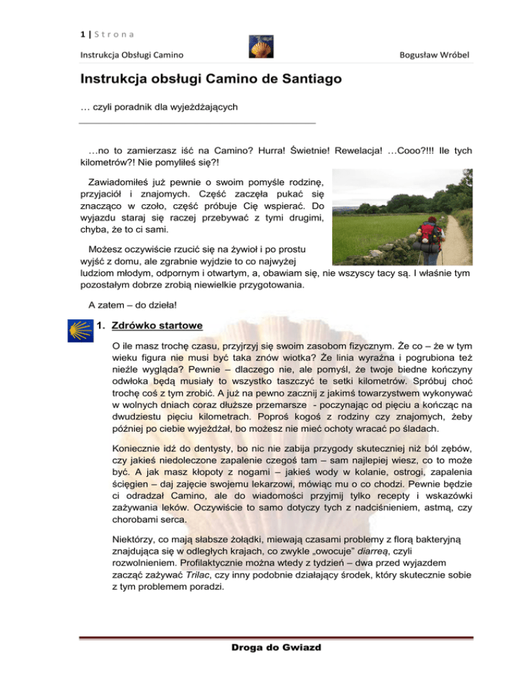 1|Strona Instrukcja Obsługi Camino Bogusław Wróbel Instrukcja obsługi Camino de Santiago … czyli poradnik dla wyjeżdżających …no to zamierzasz iść na Camino? Hurra! Świetnie! Rewelacja! …Cooo?!!! Ile tych kilometrów?! Nie pomyliłeś się?! Zawiadomiłeś już pewnie o swoim pomyśle rodzinę, przyjaciół i znajomych. Część zaczęła pukać się znacząco w czoło, część próbuje Cię wspierać. Do wyjazdu staraj się raczej przebywać z tymi drugimi, chyba, że to ci sami. Możesz oczywiście rzucić się na żywioł i po prostu wyjść z domu, ale zgrabnie wyjdzie to co najwyżej ludziom młodym, odpornym i otwartym, a, obawiam się, nie wszyscy tacy są. I właśnie tym pozostałym dobrze zrobią niewielkie przygotowania. A zatem – do dzieła! 1. Zdrówko startowe O ile masz trochę czasu, przyjrzyj się swoim zasobom fizycznym. Że co – że w tym wieku figura nie musi być taka znów wiotka? Że linia wyraźna i pogrubiona też nieźle wygląda? Pewnie – dlaczego nie, ale pomyśl, że twoje biedne kończyny odwłoka będą musiały to wszystko taszczyć te setki kilometrów. Spróbuj choć trochę coś z tym zrobić. A już na pewno zacznij z jakimś towarzystwem wykonywać w wolnych dniach coraz dłuższe przemarsze - poczynając od pięciu a kończąc na dwudziestu pięciu kilometrach. Poproś kogoś z rodziny czy znajomych, żeby później po ciebie wyjeżdżał, bo możesz nie mieć ochoty wracać po śladach. Koniecznie idź do dentysty, bo nic nie zabija przygody skuteczniej niż ból zębów, czy jakieś niedoleczone zapalenie czegoś tam – sam najlepiej wiesz, co to może być. A jak masz kłopoty z nogami – jakieś wody w kolanie, ostrogi, zapalenia ścięgien – daj zajęcie swojemu lekarzowi, mówiąc mu o co chodzi. Pewnie będzie ci odradzał Camino, ale do wiadomości przyjmij tylko recepty i wskazówki zażywania leków. Oczywiście to samo dotyczy tych z nadciśnieniem, astmą, czy chorobami serca. Niektórzy, co mają słabsze żołądki, miewają czasami problemy z florą bakteryjną znajdująca się w odległych krajach, co zwykle „owocuje” diarreą, czyli rozwolnieniem. Profilaktycznie można wtedy z tydzień – dwa przed wyjazdem zacząć zażywać Trilac, czy inny podobnie działający środek, który skutecznie sobie z tym problemem poradzi. Droga do Gwiazd 2|Strona Instrukcja Obsługi Camino Bogusław Wróbel 2 . Dojazd Santiago de Compostella znajduje się mianowicie w Hiszpanii. A to dosyć daleko stąd, choć słowo „daleko” ma w tym wypadku znaczenie nie do końca określone. Z czasem bowiem spotkasz ludzi, którzy swoje Camino rozpoczęli w domu - np. w Lyonie, Paryżu, Madrycie, czy Stutgarcie (jakieś 2400 km od Santiago) i nie był to dla nich zbyt wieki dystans. Tym niemniej jednak najczęstszym ograniczeniem jest czas – po prostu możesz wyjechać na tyle a tyle dni i kwita. A wtedy najtańszym i najszybszym sposobem dostania się na początek szlaku, jak też powrotu, są samoloty. Wystarczy wtedy jedynie ustalić termin wylotu i przylotu, lotnisko najbliższe początku trasy, którą zamierzasz przejść i najbliższe twojego miejsca zamieszkania. Do wyszukiwania najlepszy chyba jest adres: www.skyscanner.pl. Połączeń z Polski do zbyt wielu miejsc w Hiszpanii nie ma – wybór Madrytu czy Barcelony nie jest najtańszy – do przejechania będzie jeszcze pół Hiszpanii rozwinięta - sieć natomiast jest połączeń z nieźle Londynu Stansted np. do Bilbao. Jeżeli kupimy bilety ze dwa miesiące wcześniej nie będzie problemu z umiarkowane miejscami (np. w i koszty 2009 r., będą mimo niekorzystnego kursu złotówki, z Wrocławia do Londynu i dalej do Bilbao a z powrotem - z Santiago do Londynu i w końcu do Wrocławia można było polecieć z plecakiem nadawanym na bagaż za niewiele więcej niż dziewięćset złotych). Z Bilbao autobus np. do Pampeluny kosztuje 13,50 € (w 2009 r.). Połączeń autobusowych można szukać (niestety po hiszpańsku) na stronie www.movelia.es. Z lotnisk autobusy miejskie za 1,50 – 3,00 € (w zależności od tego, jak daleko jest lotnisko od miasta) zawiozą cię najczęściej na główny dworzec autobusowy. Jednak nawet jeśli już trafisz radośnie do Hiszpanii, to pozostanie problem znalezienia się na szlaku. Spis miejscowości przez które przechodzi Camino jest w każdym przewodniku (np. w pobranym ze strony internetowej). O ile w mniejszych miejscowościach znalezienie alberge i żółtych strzałek nie będzie stanowić problemu - wystarczy że wystękasz do kogoś pytająco: „Camino?” a każdy wskaże ci właściwy kierunek, to w dużych miastach może to nie być takie proste. Droga do Gwiazd 3|Strona Instrukcja Obsługi Camino Bogusław Wróbel Przywołując swoje ewentualne zasoby angielskiego będziesz pewnie typował odpowiednie osoby do zapytania, wybierając oczywiście młodsze, słusznie rozumując, że pewnie uczyły się angielskiego w szkole. I będziesz miał rację, zapewne zrozumieją o co chodzi, tyle, że w ich szkołach mało opowiadano z reguły o tym gdzie szukać schroniska. To wiedzą najczęściej ludzie, powiedzmy, bardziej już doświadczeni, ale ci z kolei mało znają języki… Dobrze jest zatem poszukać adresu alberge na planach miast publikowanych w internecie lub satelitarnych zdjęciach w Google, zaznaczając interesujący nas punkt – wtedy będzie łatwiej. 3. Pierwszy krok Do Alberge najlepiej jest trafić około 13 – 14 – później może być gęsto. Ustawiamy się grzecznie w ewentualnej kolejce do biurka hostalera(y), które z reguły jest przy wejściu. Po dotarciu do niego mówimy, że zaczynamy dopiero Camino, lub, w razie braku zrozumienia, powtarzamy słowo „Start”, co z reguły załatwia problem. Dostajemy kartkę A4 do wypełnienia i staramy się powpisywać co trzeba, gdzie trzeba. Bez jakichkolwiek polskich literek z „ć”, „ź”, „ś” itp. Najlepiej drukowanymi, bo później hostaler