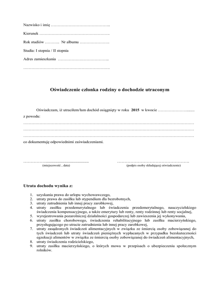 Nazwisko i imię …………………………………….. Kierunek ……………………………………………. Rok studiów ……….. Nr albumu …………………. Studia: I stopnia / II stopnia Adres zamieszkania ……………………………….. ………………………………………………………. Oświadczenie członka rodziny o dochodzie utraconym Oświadczam, iż utraciłem/łam dochód osiągnięty w roku 2015 w kwocie …………………........ z powodu: ……………………………………………………………………………………………………………… ……………………………………………………………………………………………………………… ……………………………………………………………………………………………………………… co dokumentuję odpowiednimi zaświadczeniami. ……………....................................... …………………………………………. (miejscowość , data) (podpis osoby składającej oświadczenie) Utrata dochodu wynika z: 1. 2. 3. 4. 5. 6. 7. 8. 9. uzyskania prawa do urlopu wychowawczego, utraty prawa do zasiłku lub stypendium dla bezrobotnych, utraty zatrudnienia lub innej pracy zarobkowej, utraty zasiłku przedemerytalnego lub świadczenia przedemerytalnego, nauczycielskiego świadczenia kompensacyjnego, a także emerytury lub renty, renty rodzinnej lub renty socjalnej, wyrejestrowania pozarolniczej działalności gospodarczej lub zawieszenia jej wykonywania, utraty zasiłku chorobowego, świadczenia rehabilitacyjnego lub zasiłku macierzyńskiego, przysługującego po utracie zatrudnienia lub innej pracy zarobkowej, utraty zasądzonych świadczeń alimentacyjnych w związku ze śmiercią osoby zobowiązanej do tych świadczeń lub utraty świadczeń pieniężnych wypłacanych w przypadku bezskuteczności egzekucji alimentów w związku ze śmiercią osoby zobowiązanej do świadczeń alimentacyjnych, utraty świadczenia rodzicielskiego, utraty zasiłku macierzyńskiego, o których mowa w przepisach o ubezpieczeniu społecznym rolników.