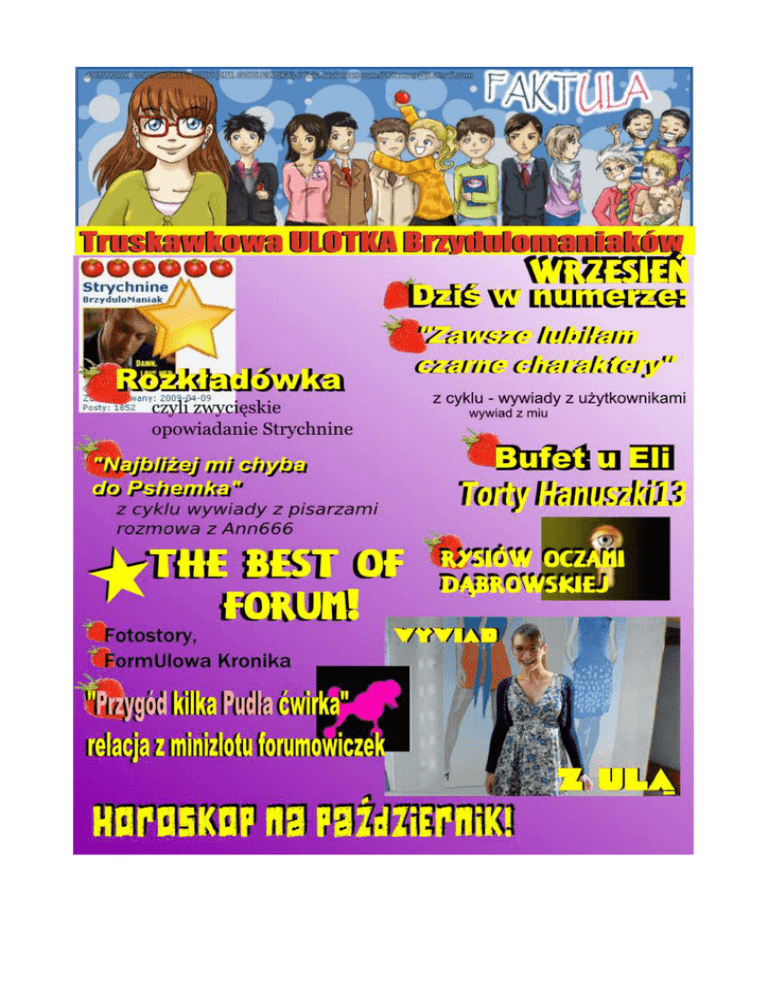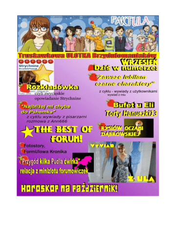 *** Pora na pomidora! Nadszedł długo oczekiwany koniec sezonu ogórkowego. Wraz z nowymi odcinkami rozpoczął się sezon pomidorowy. Żelazne sztaby zamków chroniących tajny bunkier szefowej FOMu – Papuki drgnęły. Odcinek 162 sprawił, że pierwsi linkożercy wystawili nosy ze swych nor. W kierunku tych nosów poleciały pierwsze pomidory. Drodzy linkożercy, to wasza wina! To przez was tyle dobroczynnego bromu się marnuje! Przemyślcie swoje zachowanie, a wasze grzechy będą wam wybaczone. *** Układy są wszędzie. Na forum wielokrotnie padało pytanie „Skąd ON je ma?”. Tajemnica została wyjaśniona! ON ma tajny układ z prezesem. Prawdopodobnie już w tej chwili ON posiada je wszystkie. Nie proście jednak, by wam je udostępnił. Nie próbujcie go przekupić. Dla NIEGO liczą się w życiu trzy rzeczy – honor, harmider i hrupki! Pojawiły się plotki, iż istotny jest także hipopotam. Niestety zainteresowany nie potwierdza i nie zaprzecza. *** Pudelek na tropie. W poprzednim wydaniu broszurki informowaliśmy o tajnym spotkaniu kilku uczestniczek oficjalnego zlotu fanów "Brzyduli". Wówczas szczegóły tego spotkania pozostały znane tylko nielicznym. Przy kolejnych spotkaniach forumowiczki nie były już tak uważne i specjalnemu wysłannikowi, Pudelkowi, udało się ustrzelić kilka obciążających fotek. W dalszym ciągu jednak nie wiadomo jakie ważkie tematy były podejmowane i czy zapadły jakieś decyzje dotyczące dalszych losów forum. *** Problemy z gwiazdą. Odbył się kolejny konkurs literacki. Po raz kolejny pierwsze miejsce zajęła Strychnine. Na drugim miejscu, z niewielką stratą do zwyciężczyni, uplasowała się Uluma. Panie podzielą się nagrodami. Nagrodę rzeczową otrzyma Uluma, Strychnine natomiast gwiazdkę. Wszyscy zastanawiają się, gdzie i jak Root wsadzi kolejną. Tak czy inaczej, Root – trzymamy kciuki! *** Z ostatniej chwili! Forum ostatnimi czasy stało się bardzo tajemnicze. Tajne zloty, tajne układy. W ostatnich dniach kolejna forumowiczka wyjawiła nam swój mroczny sekret! Najpierw podzieliła się z nami jedynie informacją o jego istnieniu. Podejrzewaliśmy ją o romans z Filipem Bobkiem, nawet o bycie Filipem Bobkiem, a także o trzeci sutek. Rzeczywistość po raz kolejny okazała się bardziej interesująca niż wymyślone scenariusze. Dotychczas zdeklarowana Markoholiczka zmieniła obiekt uwielbienia. ONA WOLI ALEKSA! Wywiad z miu - najwierniejszą fanką Lwa i TVN-u Pytanie 1: Witaj miu! Dziękuję, że zgodziłaś się udzielić wywiadu naszej redakcji :P Miu - wiesz, że ja jestem Twoją najwierniejszą fanką, tłumy Cię kochają - potęguje to przede wszystkim Twoja przebojowość i otwartość. Czy od dnia narodzin chciałaś mówić wcześniej niż inni agugu i raczkować w wieku dwóch miesięcy? Miu: Do 2 roku życia nic nie mówiłam. Tak wiem, trudno w to uwierzyć :P dopiero tuż przed 2 urodzinami powiedziałam twa magiczne słowa: MOJE i DAJ :P i do tej pory mi tak zostało ;) Pytanie 2: Lubisz przebywać z ludźmi czy wolisz częściej poprowadzić wewnętrzny monolog w zaciszu własnego mieszkania? Miu: Lubię przebywać z ludźmi, którzy maja takie fazy jak ja :D absurdalne poczucie humoru i 1001 pomysłów na minutę. Dlatego tak dobrze dogaduję się z Kacmurką :D Pytanie 3: Dziękuję miu, dwie najsmaczniejsze połówki chleba odnalazły się w piekarni Niestety, muszę ukrócić moją dalszą prywatę i zadać Ci kolejne pytanie Jak trafiłaś na nasze forum? Miu: Chciałam pogadać z prawdziwymi fanami serialu i udało się ;) Pytanie 4: Co najbardziej podoba Ci się na forum, a co w pierwszej kolejności byś zmieniła? Miu: Lubię poranki i nocne rozmowy. A co bym zmieniła? Mniej rozmów o Marku, więcej o Lwie : P Pytanie 5: Jak trafiłaś w objęcia Brzyduli ? Oglądałaś wcześniej jakieś inne wersje, czy był to zupełny przypadek? Miu: Oglądałam wersję kolumbijską na TVNie. Pytanie 6: Jaka jest Twoja ulubiona serialowa postać? Miu: Tu będzie zaskoczenie :P wiem, że nikt się tego nie spodziewał :P Imię tej postaci zaczyna się na L ;) Pytanie 7: Dlaczego właśnie Lew :P? Miu: Cud, miód i precelki po prostu. Przystojny mężczyzna pełen namiętności. Chodzący ideał. Pytanie 8: Twoja przygoda z serialem skończyła się na 141 odcinku. Chcesz powiedzieć parę słów do reżyserów ? Miu: Uważam, że zniknięcia Lwa było największym błędem scenarzystów. Po jego odejściu, serial obniży ł loty i schodzi na psy. Ale cóż, 141 odcinek na zawsze w moim sercu :D Pytanie 9: Którą z serialowych postaci chciałabyś zagrać? Miu: Paulinę. Zawsze lubiłam czarne charaktery. Wolałam Balladynę od Aliny ;) Pytanie 10: Skąd się wziął pomysł na Twój forumowy nick? Dlaczego akurat miu? Miu: Mój kolega Serb nie umiał odmieniać mojego imienia, i skrócił je. Tak powstała Miu. Pytanie 11: Czym zajmujesz się na co dzień? Miu: Wspieram serbskich bojowników o wolność: chlebem, pieśnią i dobrym słowem, Pytanie 12: Bez czego nie wyobrażasz sobie życia? Miu: Bez ludzi, Serbii i TVNu Pytanie 13: Masz jakieś motto życiowe, słowny amulet, który pomaga przebrnąć przez codzienność? Miu: Nic się nie dzieje przypadkowo…. Pytanie 14: Miu, doszły mnie słuchy, że czeka Cię niebawem zasłużony urlop, zdradź nam nazwę tajemniczego miejsca, do którego się udajesz Miu: Jadę do domu A skoro jestem serbska księżniczką to dom mam tylko jeden Pytanie 15: Dziękuję Ci bardzo za rozmowę. Czy chciałabyś powiedzieć na koniec coś do swych znajomych obywateli forum ? Miu: Róbcie lampiony dziewczyny, bo nie znacie dnia ani godziny :P Stałam właśnie w kuchni i gotowałam obiad dla Bartusia, gdy nagle mój wzrok przypadkiem skierował się w stronę okna. Nie miałam zamiaru tam zerkać, ale poczułam, że muszę. A gdy już to się stało, moją uwagę przykuł idący ulicą mężczyzna. Jak co dzień o tej porze prowadził z przedszkola swoją ma
