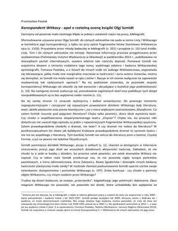 Przemysław Pawlak Korespondent Witkacy - apel o rzetelną ocenę książki Olgi Szmidt Zacznijmy od pozornie mało istotnego błędu w jednej z ostatnich części tej pracy, bibliografii. Sformułowanie używane przez Olgę Szmidt: do różnych adresatów nie pada w tomie Listy I Witkacego w kontekście jego korespondencji, a tylko raz przy opisie fragmentów listów Stanisława Witkiewicza ojca (s. 1102). Przywołany przez młodą badaczkę w bibliografii (s. 201) i przypisie (s. 15) tytuł źródła: Listy. Tom I do różnych adresatów nie istnieje. Natomiast informacja prasowa przygotowana przez wydawnictwo (Paostwowy Instytut Wydawniczy w likwidacji) w październiku 2013 r., publikowana na dziesiątkach portali internetowych, zawiera właśnie taki nieścisły dopisek. Ponieważ Szmidt nie wspomina słowem o istnieniu redaktora tego tomu, wybitnego edytora i badacza Witkacowskiej epistolografii, Tomasza Pawlaka, a o listach do innych osób niż Jadwiga Witkiewiczowa, wypowiada się lekceważąco, jakby miały one marginalne znaczenie w twórczości i życiu autora Szewców, można się domyślad, że Szmidt nie miała nawet w ręku Listów I. Bazuje w ich ocenie wyłącznie na zapowiedzi wydawniczej lub zasłyszanych opiniach.1 Na tej podstawie stwierdza, że pozostałe zespoły korespondencji Witkacego nie okazały się tak wyraziste i decydujące o kształcie jego podmiotowości (s. 10). Na następnej stronie asekuruje się: poszukiwanie zaginionych dzieł oraz publikacje tych dotąd nieopublikowanych są tu bez wątpienia nader istotne (s. 11). Na tej samej stronie 11 smaczek stylistyczny i bełkot semantyczny: Do pewnego momentu najpopularniejszymi i cieszącymi się najwyższym poważaniem dziełami Witkacego były literatura, teatr, dzieła plastyczne oraz pisma teoretyczne i, już z nieco większymi zastrzeżeniami, filozoficzne. Co zatem Szmidt rozumie pod pojęciem literatura? Chyba tylko powieści, skoro obok wymienia teatr. Czy chodzi o współtworzenie eksperymentalnego teatru „Elsynor”? Chyba nie, bo przecież nikt dotychczas nie uważał tego epizodu za jeden z najważniejszych fragmentów Witkacowskiej spuścizny. Zatem prawdopodobnie chodziło o dramat, nie teatr? A czy dramat nie należy do literatury? W postkonceptualnym (to słowo jak byłabysie) Krakowie prawdopodobnie dramat to synonim teatru i nie ma nic wspólnego z literaturą. Tym bardziej Szmidt nie zalicza do literatury pism o teatrze, Czystej Formie, a już na pewno nie tekstów filozoficznych. Szmidt pomniejsza dorobek Witkacego, pisząc o setkach (s. 12, również w dostępnym w Internecie streszczeniu pracy) jego dzieł we wszystkich dziedzinach aktywności twórczej. Zakładam, że nie chodzi tu o setki w każdej z dziedzin, bo przecież setek powieści, ani setek dramatów Witkacy nie napisał. Czy w takim razie Szmidt przekonuje nas, że nie powstały nigdy tysiące portretów pastelowych, a Irena Jakimowiczowa, Anna Żakiewicz, Beata Zgodzioska i dziesiątki innych badaczy twórczości plastycznej miały zwidy? W rozdziale Zamiast podsumowania Szmidt uparcie uściśla swoje twierdzenie: Autoportretów i portretów Witkacego (s. 197). Znów konfuzja - czy chodzi o portrety zdjęte Witkacemu, czy innym osobom przez Witkacego? Trudno się dziwid badaczce, że oswaja „przeciwnika”, bagatelizując jego potencjał i dokonania. Opus magnum Witkacego nie powstało, nie powstało też dzieło, które uchodziłoby bez wątpienia za 1 Dziwna jest też decyzja, by w bibliografii, a także w tekście głównym pracy o Listach do żony nie wspomnied o roku 2005 dacie pierwodruku I wydania listów z lat 1923-1927. Szmidt podaje wszędzie rok 2009, korzysta zatem z dodruku do I wydania, co może dezorientowad czytelnika. Nie znając dziejów tego wydania, można pomyśled, że Listy do żony nie ukazywały się chronologicznie (tom listów z lat 1928-1931 ukazał się w 2007 r.). Na spotkaniach autorskich w 2015 r., a więc już po wydaniu Listów II (wol. I) w opracowaniu Tomasza Pawlaka, Stefana Okołowicza i Janusza Deglera (Warszawa 2014), Szmidt nie wspomina o zmianie swojej opinii na temat korespondencji S. I. Witkiewicza do innych adresatów niż jego żona. arcydzieło (s. 196). Witkacego trudno niekontrowersyjnie uznad za wirtuoza jakiegoś gatunku, niełatwo ustawid jego powieści czy dramaty w szeregu arcydzieł; filozofii i teorii także wielu miało niemało do zarzucenia (s. 12). Zatem Szewcy przez pomyłkę dostali się na listę lektur szkolnych, a profesorowie uniwersyteccy z Anną Krajewską, Ewą Łubieniewską, Januszem Deglerem, Lechem Sokołem na czele, duby smalone plotą? Nie odbieram prawa do kontrowersyjnej opinii, oczekuję jednak dowodów na poparcie tej tezy. Dowodów Szmidt podad nie może, ponieważ do dramatów, pism teoretycznych o teatrze i Czystej Formie i pism filozoficznych w ogóle nie sięga! Żadnego wydania tych tekstów Witkacego nie znajdujemy w bibliografii, co nie oznacza, że nie dowiadujemy się, że Czysta forma była, jako projekt, estetycznym ekstremum i że pozostała teoretycznym projektem (s. 194 i 195). W sumie 18 razy Olga Szmidt używa słów Hauptwerk i Główniak, bolejąc nad... niespełnieniem się marzenia Witkacego o wydaniu jego Hauptwerku. Witkacy miał rację – wyjście Hauptwerku byłoby koocem, ostateczną rozgrywką (s. 193). Byłoby? Czy badaczka naprawdę nie wie o najważniejszym dziele filozoficznym Witkacego, opublikowanym w 1935 r. pod tytułem Pojęcia i twierdzenia implikowane przez pojęcie istnienia? Przecież autor sam w listach określał tę pracę mianem swojego Hauptwerku/Główniaka. Szmidt ani razu nie wspomina o tej publikacji, wykuwając wręcz nowy termin witkacologiczny: nieświadomy Hauptwerk (s. 9 i 10) w odniesieniu do całości korespondencji z Jadwigą Witkiewiczową. Na fałszywym założeniu, że Witkacemu nie udało się nigdy świadomie ukooczyd Główniaka, Szmidt buduje karkołomną tezę o konstytutywnej