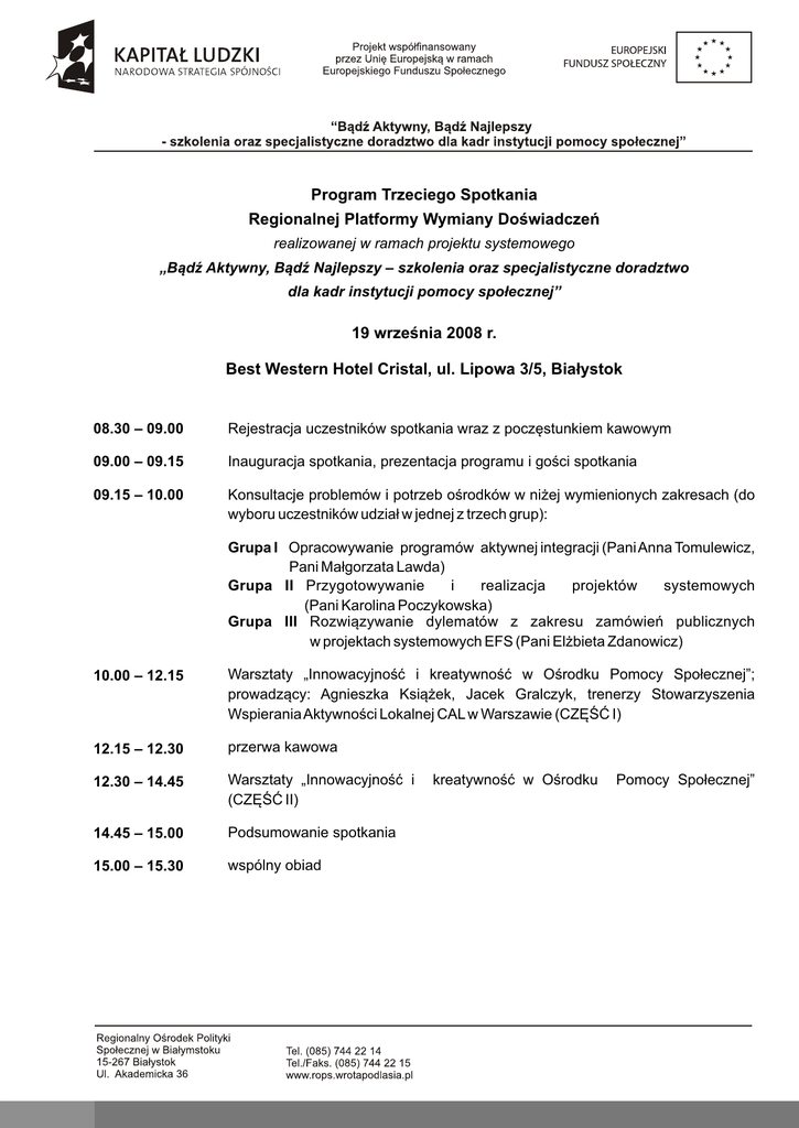 Program Trzeciego Spotkania Regionalnej Platformy Wymiany Doświadczeń realizowanej w ramach projektu systemowego „Bądź Aktywny, Bądź Najlepszy – szkolenia oraz specjalistyczne doradztwo dla kadr instytucji pomocy społecznej” 19 września 2008 r. Best Western Hotel Cristal, ul. Lipowa 3/5, Białystok 08.30 – 09.00 Rejestracja uczestników spotkania wraz z poczęstunkiem kawowym 09.00 – 09.15 Inauguracja spotkania, prezentacja programu i gości spotkania 09.15 – 10.00 Konsultacje problemów i potrzeb ośrodków w niżej wymienionych zakresach (do wyboru uczestników udział w jednej z trzech grup): Grupa I Opracowywanie programów aktywnej integracji (Pani Anna Tomulewicz, Pani Małgorzata Lawda) Grupa II Przygotowywanie i realizacja projektów systemowych (Pani Karolina Poczykowska) Grupa III Rozwiązywanie dylematów z zakresu zamówień publicznych w projektach systemowych EFS (Pani Elżbieta Zdanowicz) 10.00 – 12.15 Warsztaty „Innowacyjność i kreatywność w Ośrodku Pomocy Społecznej”; prowadzący: Agnieszka Książek, Jacek Gralczyk, trenerzy Stowarzyszenia Wspierania Aktywności Lokalnej CAL w Warszawie (CZĘŚĆ I) 12.15 – 12.30 przerwa kawowa 12.30 – 14.45 Warsztaty „Innowacyjność i (CZĘŚĆ II) 14.45 – 15.00 Podsumowanie spotkania 15.00 – 15.30 wspólny obiad kreatywność w Ośrodku Pomocy Społecznej”