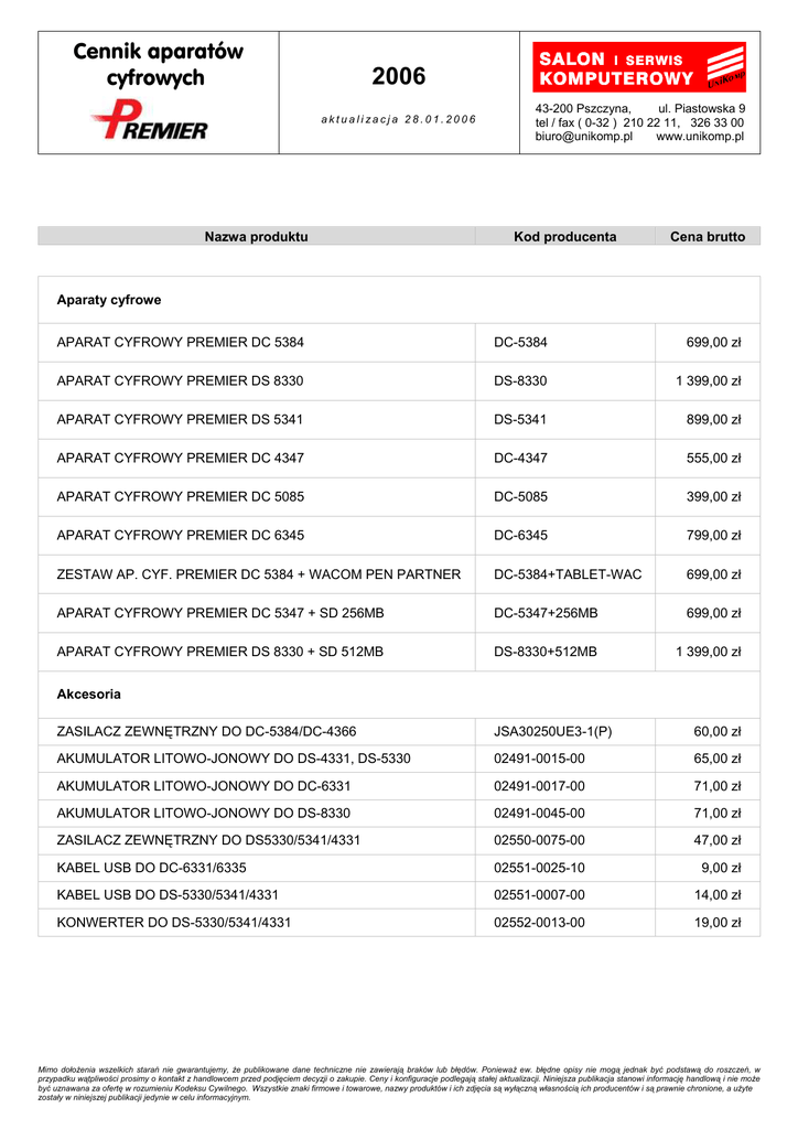 Cennik aparatów cyfrowych 2006 aktuali zacja 28.01.2006 Nazwa produktu 43-200 Pszczyna, ul. Piastowska 9 tel / fax ( 0-32 ) 210 22 11, 326 33 00 [email protected] www.unikomp.pl Kod producenta Cena brutto Aparaty cyfrowe APARAT CYFROWY PREMIER DC 5384 DC-5384 699,00 zł APARAT CYFROWY PREMIER DS 8330 DS-8330 1 399,00 zł APARAT CYFROWY PREMIER DS 5341 DS-5341 899,00 zł APARAT CYFROWY PREMIER DC 4347 DC-4347 555,00 zł APARAT CYFROWY PREMIER DC 5085 DC-5085 399,00 zł APARAT CYFROWY PREMIER DC 6345 DC-6345 799,00 zł ZESTAW AP. CYF. PREMIER DC 5384 + WACOM PEN PARTNER DC-5384+TABLET-WAC 699,00 zł APARAT CYFROWY PREMIER DC 5347 + SD 256MB DC-5347+256MB 699,00 zł APARAT CYFROWY PREMIER DS 8330 + SD 512MB DS-8330+512MB 1 399,00 zł Akcesoria ZASILACZ ZEWNĘTRZNY DO DC-5384/DC-4366 JSA30250UE3-1(P) 60,00 zł AKUMULATOR LITOWO-JONOWY DO DS-4331, DS-5330 02491-0015-00 65,00 zł AKUMULATOR LITOWO-JONOWY DO DC-6331 02491-0017-00 71,00 zł AKUMULATOR LITOWO-JONOWY DO DS-8330 02491-0045-00 71,00 zł ZASILACZ ZEWNĘTRZNY DO DS5330/5341/4331 02550-0075-00 47,00 zł KABEL USB DO DC-6331/6335 02551-0025-10 9,00 zł KABEL USB DO DS-5330/5341/4331 02551-0007-00 14,00 zł KONWERTER DO DS-5330/5341/4331 02552-0013-00 19,00 zł Mimo dołożenia wszelkich starań nie gwarantujemy, że publikowane dane techniczne nie zawierają braków lub błędów. Ponieważ ew. błędne opisy nie mogą jednak być podstawą do roszczeń, w przypadku wątpliwości prosimy o kontakt z handlowcem przed podjęciem decyzji o zakupie. Ceny i konfiguracje podlegają stałej aktualizacji. Niniejsza publikacja stanowi informację handlową i nie może być uznawana za ofertę w rozumieniu Kodeksu Cywilnego. Wszystkie znaki firmowe i towarowe, nazwy produktów i ich zdjęcia są wyłączną własnością ich producentów i są prawnie chronione, a użyte zostały w niniejszej publikacji jedynie w celu informacyjnym.