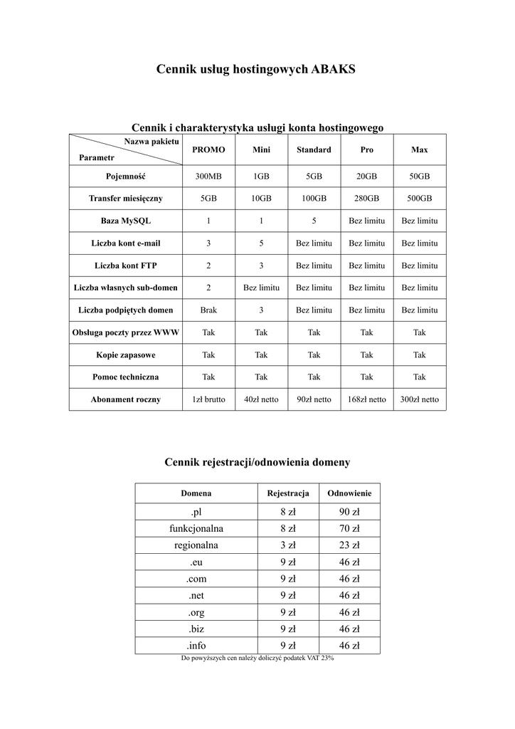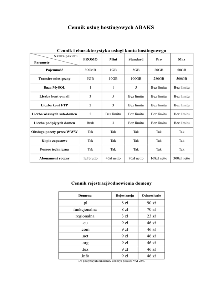 Cennik usług hostingowych ABAKS Cennik i charakterystyka usługi konta hostingowego Nazwa pakietu PROMO Mini Standard Pro Max Pojemność 300MB 1GB 5GB 20GB 50GB Transfer miesięczny 5GB 10GB 100GB 280GB 500GB Baza MySQL 1 1 5 Bez limitu Bez limitu Liczba kont e-mail 3 5 Bez limitu Bez limitu Bez limitu Liczba kont FTP 2 3 Bez limitu Bez limitu Bez limitu Liczba własnych sub-domen 2 Bez limitu Bez limitu Bez limitu Bez limitu Liczba podpiętych domen Brak 3 Bez limitu Bez limitu Bez limitu Obsługa poczty przez WWW Tak Tak Tak Tak Tak Kopie zapasowe Tak Tak Tak Tak Tak Pomoc techniczna Tak Tak Tak Tak Tak Abonament roczny 1zł brutto 40zł netto 90zł netto 168zł netto 300zł netto Parametr Cennik rejestracji/odnowienia domeny Domena Rejestracja Odnowienie .pl 8 zł 90 zł funkcjonalna 8 zł 70 zł regionalna 3 zł 23 zł .eu 9 zł 46 zł .com 9 zł 46 zł .net 9 zł 46 zł .org 9 zł 46 zł .biz 9 zł 46 zł .info 9 zł 46 zł Do powyższych cen należy doliczyć podatek VAT 23%