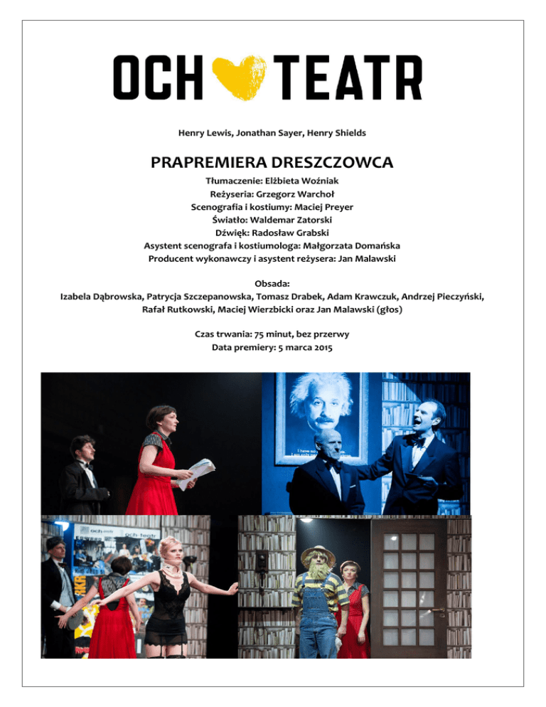 Henry Lewis, Jonathan Sayer, Henry Shields PRAPREMIERA DRESZCZOWCA Tłumaczenie: Elżbieta Woźniak Reżyseria: Grzegorz Warchoł Scenografia i kostiumy: Maciej Preyer Światło: Waldemar Zatorski Dźwięk: Radosław Grabski Asystent scenografa i kostiumologa: Małgorzata Domańska Producent wykonawczy i asystent reżysera: Jan Malawski Obsada: Izabela Dąbrowska, Patrycja Szczepanowska, Tomasz Drabek, Adam Krawczuk, Andrzej Pieczyński, Rafał Rutkowski, Maciej Wierzbicki oraz Jan Malawski (głos) Czas trwania: 75 minut, bez przerwy Data premiery: 5 marca 2015 Opis spektaklu: Prapremiera dreszczowca to adaptacja sztuki, która w Londynie święci tryumfy jako The Play That Goes Wrong. Zabawna opowieść o amatorskim teatrze, o tym, że wszystko, co złe, może zdarzyć się właśnie w dniu premiery... Komedia o aktorach i ich pracy, o kulisach teatru, o mechanizmach i kłopotach tworzenia iluzji. Wykładowcy i studenci pewnej uczelni prowadzą grupę teatralną i zamierzają wystawić napisaną w latach 20. sztukę o tajemniczym morderstwie. Zbliżają się do premiery, ale wszystko idzie nie tak, jak powinno. Nieszczęśliwe wypadki, które tylko teoretycznie mogłyby mieć miejsce, zdarzają się wszystkie, jeden po drugim. Pech, brak profesjonalizmu, lekkomyślność obsługi i trema aktorów, doprowadzają do istnego pandemonium, widzowie zaś raz po raz doprowadzani są do płaczu ze śmiechu… Czy aktorzy i widzowie dotrwają do ukłonów? Prapremiera dreszczowca napisana została przez zawodowych aktorów. Grana jest z powodzeniem na West Endzie, została też znakomicie przyjęty na festiwalu w Edynburgu. W prestiżowym konkursie "What’s On Stage 2014" otrzymała przyznawany przez publiczność tytuł „najlepszej nowej komedii”. W spektaklu został wykorzystany Hymn Koronacyjny "Zadok the Priest" G.F. Händla w wykonaniu Chóru Akademickiego Politechniki Warszawskiej pod batutą Dariusza Zminickiego. Fragment recenzji: „Spektakl w reżyserii Grzegorza Warchoła bawi, rozśmiesza, nie gubiąc przy tym smaku i wdzięku. Dynamiczna akcja nie daje widzowi chwili oddechu. Przerysowanie postaci, przesadne poruszanie się po scenie, nadęta i sztuczna artykulacja dodają kanciastości, podkreślają brak zdolności aktorskich członków teatrzyku amatorskiego. Perełką jest rola pani dziekan w interpretacji Izabeli Dąbrowskiej, która podczas premiery, zaskakując kolegów, wkracza z impetem na scenę w sukni ściągniętej z pani asystent i zaczyna grać rolę zdradzającej żony. Och-Teatr "Prapremierą dreszczowca" serwuje widzom rozrywkę na wysokim poziomie, okraszoną dobrym, solidnym aktorstwem.»” Kama Pawlicka „Wszystko się sypie: drzwi się zatrzaskują, nieboszczyk ma katar i kicha, nosze pękają, klucze giną, whisky ktoś chowa, a na jej miejsce stawia płyn do naczyń, pies się zawierusza, nawet schody zamieniają się w zjeżdżalnię. Szacowni wykładowcy pewnej uczelni, członkowie trupy amatorskiej wystawiającej "Morderstwo w domu Havershamów", nieustannie są poddawani zaskakującym próbom. Prapremiera sztuki o morderstwie to właściwie składanka niezliczonych awarii tworzących obraz katastrofy scenicznej, a nic bardziej nie cieszy od kłopotów, z którymi borykają się inni. Śmiech przycicha więc tylko chwilami.” Tomasz Miłkowski „Grupa szacownych pracowników naukowych z kilometrami tytułów przed nazwiskami, ma zagrać w amatorskim przedstawieniu, wyreżyserowanym przez siebie. Dalej może być już tylko śmieszniej. Szacowne grono profesorsko - docentowsko - doktorskie, nie przypuszcza nawet, że nie tylko problemy natury naukowej są trudne do rozwiązania. Okazuje się, że dużo więcej kłopotów sprawia odegranie na scenie napisanego już i gotowego do inscenizacji tekstu. I tu właśnie jest ta granica między widzami "cywilami" i "zawodowcami". Jedni i drudzy zaśmiewają się do rozpuku.” Krzysztof Stopczyk IMPRESARIAT TEATRU POLONIA I OCH-TEATRU Iwona Gradkowska Kom. 609 062 817 / [email protected] www.och-teatr.pl