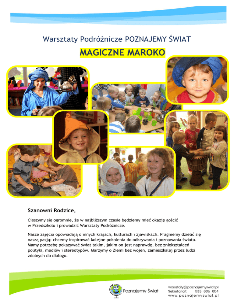 Warsztaty Podróżnicze POZNAJEMY ŚWIAT MAGICZNE MAROKO \ Szanowni Rodzice, Cieszymy się ogromnie, że w najbliższym czasie będziemy mieć okazję gościć w Przedszkolu i prowadzić Warsztaty Podróżnicze. Nasze zajęcia opowiadają o innych krajach, kulturach i zjawiskach. Pragniemy dzielić się naszą pasją: chcemy inspirować kolejne pokolenia do odkrywania i poznawania świata. Mamy potrzebę pokazywać świat takim, jakim on jest naprawdę, bez zniekształceń polityki, mediów i stereotypów. Marzymy o Ziemi bez wojen, zamieszkałej przez ludzi zdolnych do dialogu. Każdy Warsztat prowadzi prawdziwy Podróżnik z wieloletnim doświadczeniem w pracy z dziećmi. Jeśli chcesz poznać naszą Ekipę, zajrzyj na naszą stronę. Na naszych warsztatach „Magiczne Maroko” dzieci będą mieć okazję: Zmierzyć marokańskie stroje i nakrycia głowy, Zagrać na etnicznych instrumentach takich jak hamsa, gnaoua, czy bęben, Napić się marokańskiej herbaty, Poznać sekrety marokańskich farbiarni, Zanurzyć palec w piasku Sahary i poznać jej mieszkańców, Zapalić Lampę Aladyna i usiąść na marokańskim dywanie. Aby inspirować i ułatwiać pracę w obszarze edukacji międzykulturowej stworzyliśmy „Kufer Pomysłów” dla Rodziców i Wychowawców. W Kufrze są kolorowanki, muzyka, przepisy kulinarne, „zrób to sam” i przykłady zabaw z różnych krańców świata. Zachęcamy do wspólnej zabawy! Organizujemy również Podróżnicze Urodziny w Warszawie, Krakowie oraz Mielcu. Zadzwoń i zamów przyjęcie dla Twojego Dziecka: Marta: +48 533 886 804, [email protected] Przygotowaliśmy dla Ciebie specjalny rabat o wartości 50 zł. Masz pytanie? Napisz [email protected]. Zapraszamy - polub nas na Facebooku, by na bieżąco mieć informacje o nowych warsztatach i promocjach. Z podróżniczym pozdrowieniem, Magda i Marcin Musiałowie i cały zespół POZNAJEMY ŚWIAT www.poznajemyswiat.pl