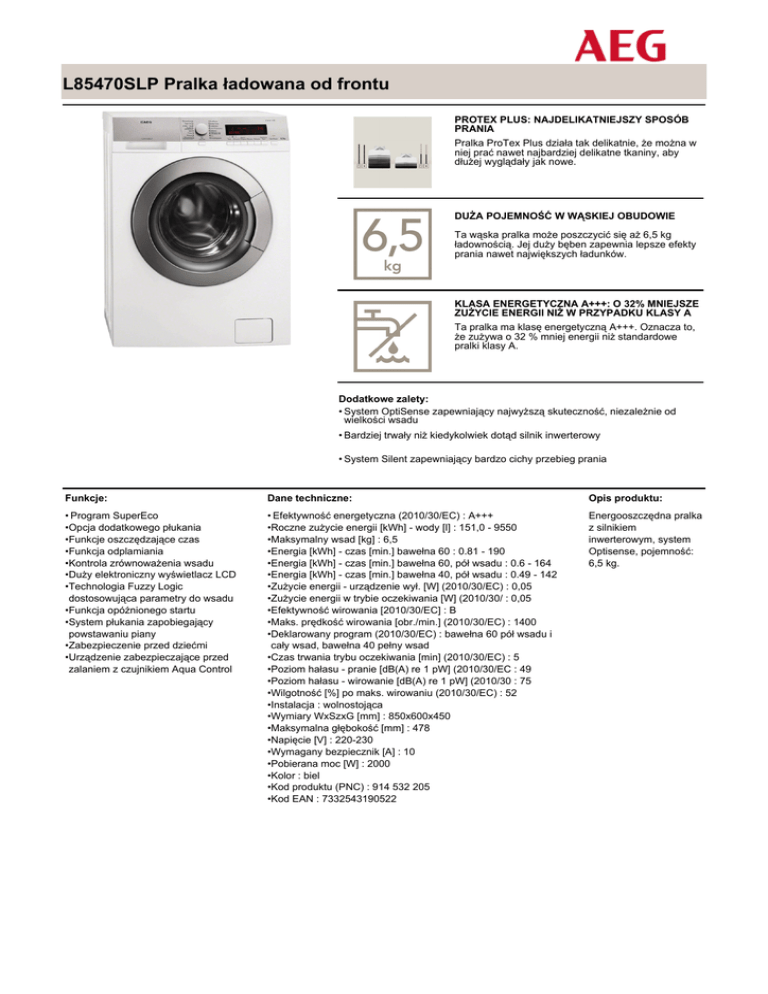 L85470SLP Pralka ładowana od frontu PROTEX PLUS: NAJDELIKATNIEJSZY SPOSÓB PRANIA Pralka ProTex Plus działa tak delikatnie, że można w niej prać nawet najbardziej delikatne tkaniny, aby dłużej wyglądały jak nowe. DUŻA POJEMNOŚĆ W WĄSKIEJ OBUDOWIE Ta wąska pralka może poszczycić się aż 6,5 kg ładownością. Jej duży bęben zapewnia lepsze efekty prania nawet największych ładunków. KLASA ENERGETYCZNA A+++: O 32% MNIEJSZE ZUŻYCIE ENERGII NIŻ W PRZYPADKU KLASY A Ta pralka ma klasę energetyczną A+++. Oznacza to, że zużywa o 32 % mniej energii niż standardowe pralki klasy A. Dodatkowe zalety: • System OptiSense zapewniający najwyższą skuteczność, niezależnie od wielkości wsadu • Bardziej trwały niż kiedykolwiek dotąd silnik inwerterowy • System Silent zapewniający bardzo cichy przebieg prania Funkcje: Dane techniczne: Opis produktu: • Program SuperEco •Opcja dodatkowego płukania •Funkcje oszczędzające czas •Funkcja odplamiania •Kontrola zrównoważenia wsadu •Duży elektroniczny wyświetlacz LCD •Technologia Fuzzy Logic dostosowująca parametry do wsadu •Funkcja opóźnionego startu •System płukania zapobiegający powstawaniu piany •Zabezpieczenie przed dziećmi •Urządzenie zabezpieczające przed zalaniem z czujnikiem Aqua Control • Efektywność energetyczna (2010/30/EC) : A+++ •Roczne zużycie energii [kWh] - wody [l] : 151,0 - 9550 •Maksymalny wsad [kg] : 6,5 •Energia [kWh] - czas [min.] bawełna 60 : 0.81 - 190 •Energia [kWh] - czas [min.] bawełna 60, pół wsadu : 0.6 - 164 •Energia [kWh] - czas [min.] bawełna 40, pół wsadu : 0.49 - 142 •Zużycie energii - urządzenie wył. [W] (2010/30/EC) : 0,05 •Zużycie energii w trybie oczekiwania [W] (2010/30/ : 0,05 •Efektywność wirowania [2010/30/EC] : B •Maks. prędkość wirowania [obr./min.] (2010/30/EC) : 1400 •Deklarowany program (2010/30/EC) : bawełna 60 pół wsadu i cały wsad, bawełna 40 pełny wsad •Czas trwania trybu oczekiwania [min] (2010/30/EC) : 5 •Poziom hałasu - pranie [dB(A) re 1 pW] (2010/30/EC : 49 •Poziom hałasu - wirowanie [dB(A) re 1 pW] (2010/30 : 75 •Wilgotność [%] po maks. wirowaniu (2010/30/EC) : 52 •Instalacja : wolnostojąca •Wymiary WxSzxG [mm] : 850x600x450 •Maksymalna głębokość [mm] : 478 •Napięcie [V] : 220-230 •Wymagany bezpiecznik [A] : 10 •Pobierana moc [W] : 2000 •Kolor : biel •Kod produktu (PNC) : 914 532 205 •Kod EAN : 7332543190522 Energooszczędna pralka z silnikiem inwerterowym, system Optisense, pojemność: 6,5 kg.