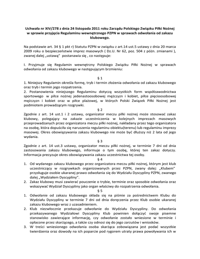Uchwała nr XIV/278 z dnia 24 listopada 2011 roku Zarządu Polskiego Związku Piłki Nożnej w sprawie przyjęcia Regulaminu wewnętrznego PZPN w sprawach odwołania od zakazu klubowego. Na podstawie art. 34 § 1 pkt r) Statutu PZPN w związku z art.14 ust.5 ustawy z dnia 20 marca 2009 roku o bezpieczeostwie imprez masowych ( Dz.U. Nr 62, poz. 504 z póżn. zmianami ), zwanej dalej „ustawą” postanawia się , co następuje: I. Przyjmuje się Regulamin wewnętrzny Polskiego Związku Piłki Nożnej w sprawach odwołania od zakazu klubowego w następującym brzmieniu: §1 1. Niniejszy Regulamin określa formę, tryb i termin złożenia odwołania od zakazu klubowego oraz tryb i termin jego rozpatrzenia. 2. Postanowienia niniejszego Regulaminu dotyczą wszystkich form współzawodnictwa sportowego w piłce nożnej jedenastoosobowej mężczyzn i kobiet, piłce pięcioosobowej mężczyzn i kobiet oraz w piłce plażowej, w których Polski Związek Piłki Nożnej jest podmiotem prowadzącym rozgrywki. §2 Zgodnie z art. 14 ust.1 i 2 ustawy, organizator meczu piłki nożnej może stosowad zakaz klubowy, polegający na zakazie uczestniczenia w kolejnych imprezach masowych przeprowadzanych przez organizatora meczu piłki nożnej, nakładany przez tego organizatora na osobę, która dopuściła się naruszenia regulaminu obiektu(terenu) lub regulaminu imprezy masowej. Okres obowiązywania zakazu klubowego nie może byd dłuższy niż 2 lata od jego wydania. §3 Zgodnie z art. 14 ust.3 ustawy, organizator meczu piłki nożnej, w terminie 7 dni od dnia zastosowania zakazu klubowego, informuje o tym osobę, której ten zakaz dotyczy. Informacja precyzuje okres obowiązywania zakazu uczestnictwa tej osoby. §4 1. Od wydanego zakazu klubowego przez organizatora meczu piłki nożnej, którym jest klub uczestniczący w rozgrywkach organizowanych przez PZPN, zwany dalej: „Klubem” przysługuje osobie ukaranej prawo odwołania się do Wydziału Dyscypliny PZPN, zwanego dalej „Wydziałem Dyscypliny”. 2. Zakaz klubowy musi zawierad pouczenie o trybie, terminie oraz sposobie odwołania oraz wskazywad Wydział Dyscypliny jako organ właściwy do rozpatrzenia odwołania. §5 1. Odwołanie od zakazu klubowego składa się na piśmie za pośrednictwem Klubu do Wydziału Dyscypliny w terminie 7 dni od dnia doręczenia przez Klub osobie ukaranej zakazu klubowego wraz z uzasadnieniem. 2. Klub niezwłocznie przekazuje odwołanie do Wydziału Dyscypliny. Do odwołania przekazywanego Wydziałowi Dyscypliny Klub powinien dołączyd swoje pisemne stanowisko zawierające informację, czy odwołanie zostało wniesione w terminie i opłacone przez skarżącego, a także czy odnosi się do jego zarzutów i wniosków. 3. W treści wniesionego odwołania osoba skarżąca zobowiązana jest podad wszystkie twierdzenia oraz dowody na ich poparcie pod rygorem utraty prawa powoływania ich w toku rozpoznania odwołania, wnioski odwoławcze, a także numery telefonów i adresy mailowe pod jakie Wydział Dyscypliny będzie dokonywał zawiadomienia o wyznaczeniu posiedzenia. W przypadku nie podania ww. informacji uznaje się, że Wydział Dyscypliny nie informuje osób zainteresowanych o posiedzeniu. §6 Wniesienie przez osobę ukaraną odwołania wstrzymuje wykonanie zakazu klubowego. §7 1. Wydział Dyscypliny odrzuca odwołanie, jeżeli zostało wniesione po upływie terminu do jego złożenia lub nie zostało należycie opłacone. 2. Na żądanie Wydziału Dyscypliny osoba ukarana zobowiązana jest na posiedzeniu uprawdopodobnid zachowanie terminu do wniesienia dowołania. §8 1. Rozpoznanie odwołania uzależnione jest od uiszczenia kaucji w kwocie 200,- zł na rachunek bankowy PZPN. 2. Nie później niż do zamknięcia posiedzenia poprzedzającego wydanie przez Wydział Dyscypliny orzeczenia odwołujący może złożyd wniosek o zwrot kaucji. W przypadku uwzględnienia odwołania Wydział Dyscypliny orzeka, iż koszty postępowania odwoławczego w wysokości 200,- zł ponosi Klub. §9 1. Rozpoznanie odwołania odbywa się na posiedzeniu, które nie może odbyd się później niż w terminie 14 dni od daty złożenia odwołania przez osobę ukaraną zakazem klubowym. 2. O posiedzeniu Wydziału Dyscypliny zawiadamia się osobę ukaraną zakazem klubowym oraz Klub wraz z powiadomieniem o prawie uczestnictwa w tym posiedzeniu. § 10 1. Po zakooczeniu postępowania Wydział Dyscypliny wydaje orzeczenie, w którym: 1) oddala odwołanie i utrzymuje w mocy zakaz klubowy; 2) zmienia treśd zakazu klubowego; 3) uchyla zakaz klubowy i przekazuje sprawę do ponownego rozpoznania przez Klub. 2. Po ogłoszeniu orzeczenia Wydział Dyscypliny doręcza je wraz z uzasadnieniem osobie ukaranej zakazem klubowym oraz Klubowi w terminie 14 dni od dnia ogłoszenia. 3. O treści orzeczenia Wydział Dyscypliny informuje także Wydział Bezpieczeostwa na Obiektach Piłkarskich i właściwy Wojewódzki Związek Piłki Nożnej. §11 Orzeczenie Wydziału Dyscypliny wydane na skutek wniesienia jest ostateczne i podlega wykonaniu. § 12 W sprawach nieuregulowanych stosuje się odpowiednio postanowienia Regulaminu Dyscyplinarnego PZPN. II. Niniejsza Uchwała wchodzi w życie z dniem podjęcia.