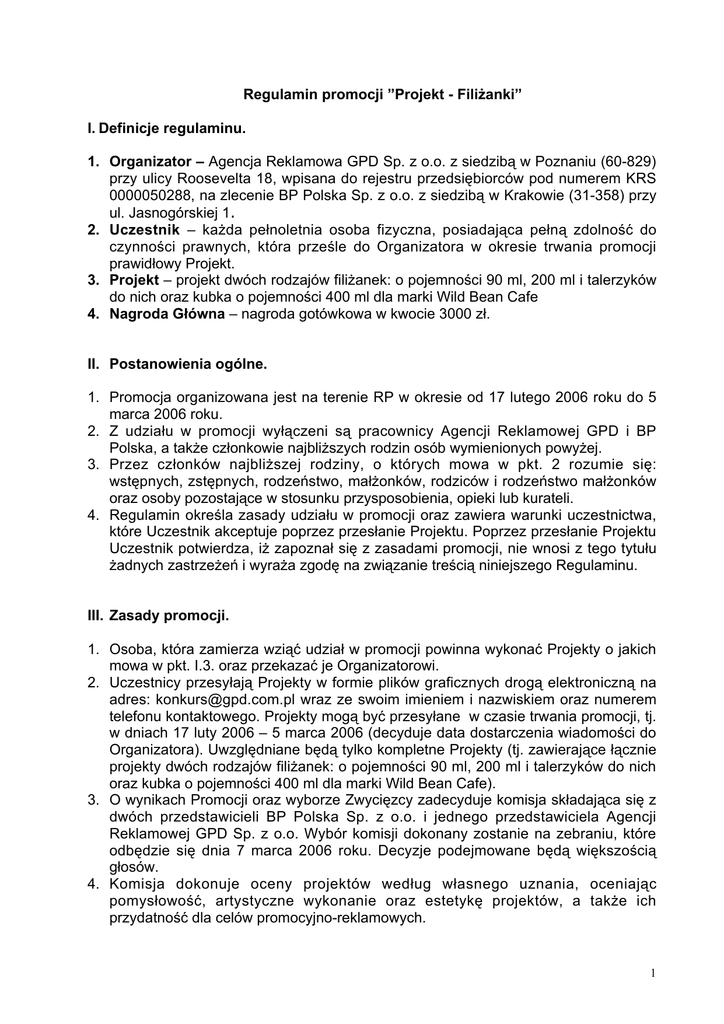 Regulamin promocji ”Projekt - Filiżanki” I. Definicje regulaminu. 1. Organizator – Agencja Reklamowa GPD Sp. z o.o. z siedzibą w Poznaniu (60-829) przy ulicy Roosevelta 18, wpisana do rejestru przedsiębiorców pod numerem KRS 0000050288, na zlecenie BP Polska Sp. z o.o. z siedzibą w Krakowie (31-358) przy ul. Jasnogórskiej 1. 2. Uczestnik – każda pełnoletnia osoba fizyczna, posiadająca pełną zdolność do czynności prawnych, która prześle do Organizatora w okresie trwania promocji prawidłowy Projekt. 3. Projekt – projekt dwóch rodzajów filiżanek: o pojemności 90 ml, 200 ml i talerzyków do nich oraz kubka o pojemności 400 ml dla marki Wild Bean Cafe 4. Nagroda Główna – nagroda gotówkowa w kwocie 3000 zł. II. Postanowienia ogólne. 1. Promocja organizowana jest na terenie RP w okresie od 17 lutego 2006 roku do 5 marca 2006 roku. 2. Z udziału w promocji wyłączeni są pracownicy Agencji Reklamowej GPD i BP Polska, a także członkowie najbliższych rodzin osób wymienionych powyżej. 3. Przez członków najbliższej rodziny, o których mowa w pkt. 2 rozumie się: wstępnych, zstępnych, rodzeństwo, małżonków, rodziców i rodzeństwo małżonków oraz osoby pozostające w stosunku przysposobienia, opieki lub kurateli. 4. Regulamin określa zasady udziału w promocji oraz zawiera warunki uczestnictwa, które Uczestnik akceptuje poprzez przesłanie Projektu. Poprzez przesłanie Projektu Uczestnik potwierdza, iż zapoznał się z zasadami promocji, nie wnosi z tego tytułu żadnych zastrzeżeń i wyraża zgodę na związanie treścią niniejszego Regulaminu. III. Zasady promocji. 1. Osoba, która zamierza wziąć udział w promocji powinna wykonać Projekty o jakich mowa w pkt. I.3. oraz przekazać je Organizatorowi. 2. Uczestnicy przesyłają Projekty w formie plików graficznych drogą elektroniczną na adres: [email protected] wraz ze swoim imieniem i nazwiskiem oraz numerem telefonu kontaktowego. Projekty mogą być przesyłane w czasie trwania promocji, tj. w dniach 17 luty 2006 – 5 marca 2006 (decyduje data dostarczenia wiadomości do Organizatora). Uwzględniane będą tylko kompletne Projekty (tj. zawierające łącznie projekty dwóch rodzajów filiżanek: o pojemności 90 ml, 200 ml i talerzyków do nich oraz kubka o pojemności 400 ml dla marki Wild Bean Cafe). 3. O wynikach Promocji oraz wyborze Zwycięzcy zadecyduje komisja składająca się z dwóch przedstawicieli BP Polska Sp. z o.o. i jednego przedstawiciela Agencji Reklamowej GPD Sp. z o.o. Wybór komisji dokonany zostanie na zebraniu, które odbędzie się dnia 7 marca 2006 roku. Decyzje podejmowane będą większością głosów. 4. Komisja dokonuje oceny projektów według własnego uznania, oceniając pomysłowość, artystyczne wykonanie oraz estetykę projektów, a także ich przydatność dla celów promocyjno-reklamowych. 1 5. Nagrodę otrzymuje Uczestnik, którego Projekt zostanie uznany przez komisję za najlepszy. Organizator zastrzega sobie prawo do odmowy wyłonienia zwycięzcy w przypadku, gdyby nadesłane Projekty nie spełniały przyjętych przez Organizatora kryteriów oraz oczekiwań. 6. Zwycięzca zostanie powiadomiony o wygranej poprzez kontakt telefoniczny w ciągu 3 dni od daty ogłoszenia wyników. W przypadku braku możliwości kontaktu telefonicznego – powiadomienie o wygranej zostanie wysłane na adres e-mail, z którego nadesłany został zwycięski Projekt. Zwycięzca zobowiązany jest potwierdzić otrzymanie wiadomości oraz skontaktować się z Organizatorem w terminie 7 dni od dnia przesłania wiadomości. 7. W wypadku gdyby kontakt ze Zwycięzcą nie został nawiązany, w szczególności gdyby zwycięzca nie odbierał telefonu lub nie odpowiedział na przesłaną wiadomość w zakreślonym wyżej terminie, nagroda przepada. W takim wypadku Komisja może dokonać ponownego wyboru Zwycięzcy. Zapisy powyższe stosuje się odpowiednio do nowo wybranego Zwycięzcy, z tym że ustala się ostateczny termin wydania nagrody na dzień 14.04.2006. Po tej dacie, bez względu na przyczynę braku kontaktu ze Zwycięzcą, nagroda przechodzi na własność Organizatora. 8. Warunkiem odbioru Narody jest przekazanie Organizatorowi praw autorskich do zwycięskiego Projektu. Przekazanie praw nastąpi na podstawie odrębnej umowy, z tym, że prawa te Zwycięzca przekaże bez dodatkowego wynagrodzenia. Przekazanie praw nastąpi na polach eksploatacji na jakich wykorzystywane będą projekty, w szczególności dla celów produkcji filiżanek oraz wprowadzania ich do obrotu. W wypadku gdyby Zwycięzca odmówił podpisania umowy, nagroda przepada. 9. Wszelkie podatki i inne ewentualne świadczenia publicznoprawne wynikające z tytułu otrzymania nagrody w promocji ponosi wyłącznie Uczestnik. 10. Nagroda otrzymana przez Uczestnika nie może być przez niego zamieniona na inną. 11. Organizator zastrzega sobie prawo do zamiany nagrody na inną o równej lub wyższej wartości. IV. Reklamacje: 1. Wszelkie reklamacje dotyczące promocji można zgłaszać na piśmie, na adres Organizatora przez cały czas jej trwania oraz w terminie 7 dni od daty jej zakończenia. 2. Reklamacje zgłoszone po upływie powyższego terminu nie będą rozpatrywane. 3. Odbiór nagrody oznacza zrzeczenie się wszelkich roszczeń w stosunku do Organizatora. 4. Pisemne reklamacje powinny zawierać imię, nazwisko i dokładny adres Uczestnika, jak również dokładny opis i wskazanie przyczyny reklamacji. 5. Reklamacje rozpatrywane będą w terminie 10 dni od dnia ich otrzymania. 6. Reklamacje rozpatrywane będą na podstawie niniejszego regulaminu. 7. O sposobie załatwienia reklamacji Uczestnik zostanie powiadomiony listem poleconym, na adres podany w reklamacji, wysłanym w terminie 7 dni od daty rozpatrzenia reklamacji. 8. Odpowiedzialność Organizatora jest ograniczona względem Uczestnika do wartości nagrody, do której Uczestnik jest uprawniony. 2 V. Postanowienia końcowe: 1. Treść niniejsz