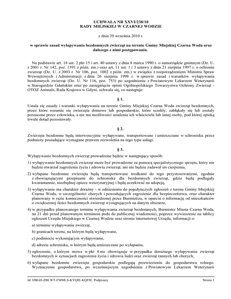 UCHWAŁA NR XXVI/238/10 RADY MIEJSKIEJ W CZARNEJ WODZIE z dnia 29 września 2010 r. w sprawie zasad wyłapywania bezdomnych zwierząt na terenie Gminy Miejskiej Czarna Woda oraz dalszego z nimi postępowania. Na podstawie art. 18 ust. 2 pkt 15 i art. 40 ustawy z dnia 8 marca 1990 r. o samorządzie gminnym (Dz. U. z 2001 r. Nr 142, poz. 1591 z późn. zm.) oraz art. 11 ust. 1 i 3 ustawy z dnia 21 sierpnia 1997 r. o ochronie zwierząt (Dz. U. z 2003 r. Nr 106, poz. 1002 z późn. zm.) w związku z rozporządzeniem Ministra Spraw Wewnętrznych i Administracji z dnia 26 sierpnia 1998 r. w sprawie zasad i warunków wyłapywania bezdomnych zwierząt (Dz. U. Nr 116, poz. 753) po uzgodnieniu z Powiatowym Lekarzem Weterynarii w Starogardzie Gdańskim oraz po zasięgnięciu opinii Ogólnopolskiego Towarzystwa Ochrony Zwierząt OTOZ Animals, Rada Krajowa w Gdyni, uchwala się, co następuje: § 1. Ustala się zasady i warunki wyłapywania na terenie Gminy Miejskiej Czarna Woda zwierząt bezdomnych, przez które rozumie się zwierzęta domowe lub gospodarskie, które uciekły, zabłąkały się lub zostały porzucone przez człowieka, a nie ma możliwości ustalenia ich właściciela lub innej osoby, pod której opieką trwale dotąd pozostawały. § 2. Zwierzęta bezdomne będą interwencyjnie wyłapywane, transportowane i umieszczane w schronisku przez podmioty posiadające wymagane prawem zezwolenia na tego typu usługi. § 3. Wyłapywanie bezdomnych zwierząt prowadzone będzie w następujący sposób: 1) wyłapywanie bezdomnych zwierząt może być prowadzone za pomocą specjalistycznego sprzętu, który nie będzie stwarzał zagrożenia życia i zdrowia zwierząt, ani nie będzie zadawał im cierpienia, 2) wyłapane bezdomne zwierzęta będą transportowane środkami do tego przystosowanymi, zgodnie z obowiązującymi przepisami do schroniska dla bezdomnych zwierząt, gdzie będą podlegały kwarantannie, niezbędnej opiece weterynaryjnej i będą oczekiwać na adopcję, 3) wyłapywanie ma charakter doraźny - w odniesieniu do pojedynczych zgłoszeń z terenu Gminy Miejskiej Czarna Woda, w szczególności chorych i powodujących zagrożenie dla bezpieczeństwa, oraz charakter planowany w razie konieczności stwierdzonej przez Burmistrza, w oparciu o informację od mieszkańców o zwiększonej ilości bezdomnych zwierząt występujących na danym obszarze, 4) w przypadku planowanego terminu wyłapywania zwierząt bezdomnych, Burmistrz Miasta Czarna Woda, na 21 dni przed planowanym terminem poda do publicznej wiadomości, poprzez wywieszenie na tablicy ogłoszeń Urzędu Miejskiego w Czarnej Wodzie oraz stronie internetowej Urzędu, informacji o: a) terminie wyłapywania zwierząt, b) granicach terenu, na którym będą wyłapywane, c) podmiocie wykonującym wyłapywanie, d) adresie schroniska, w którym będą umieszczane po wyłapaniu, 5) ogłoszenie, o którym mowa w pkt 4 nie obowiązuje w przypadku doraźnego wyłapywania zwierząt bezdomnych w sytuacjach zagrożenia życia i zdrowia ludzi oraz zwierząt rannych lub chorych, 6) wyłapane bezdomne zwierzęta gospodarskie podlegają przewiezieniu do gospodarstwa rolnego. Wyznaczenie gospodarstwa, po wcześniejszym uzgodnieniu z Powiatowym Lekarzem Weterynarii Id: IJBGD-ZBLWT-FMMLS-KYQIE-KQFIE. Podpisany Strona 1 w Starogardzie Gdańskim i dalsze postępowanie z wyłapanymi zwierzętami podlega ogłoszeniu w Komunikacie Burmistrza Miasta Czarna Woda, 7) w przypadku ustalenia właściciela zwierzęcia, które zostało schwytane, właściciel ponosi koszty wynikające z obowiązującej umowy z podmiotem wyłapującym bezdomne zwierzęta, kosztów leczenia oraz utrzymania zwierzęcia, 8) koszty, o których mowa w pkt 7 właściciel zwierzęcia ponosi niezależnie od konsekwencji przewidzianych prawem z tytułu pozostawienia zwierzęcia bez właściwego dozoru i ewentualnej odpowiedzialności za szkody spowodowane przez zwierzę, 9) wyłapane zwierzęta bezdomne, w ramach zapobiegania bezdomności zwierząt mogą być: a) wydane nowym właścicielom lub opiekunom, b) sterylizowane lub kastrowane przez lekarza weterynarii, c) poddane uśmierceniu - w przypadku gdy zachodzą przesłanki określone w ustawie z dnia 21 sierpnia 1997r. o ochronie zwierząt (Dz. U. z 2003r. Nr 106, poz. 1002 z późn. zm.) 10) koszty wyłapania i transportu bezdomnych zwierząt oraz ich leczenia i utrzymania pokrywane będą, z budżetu Gminy z zastrzeżeniem pkt 7. § 4. Wykonanie uchwały powierza się Burmistrzowi Miasta Czarna Woda. § 5. Uchwała wchodzi w życie po upływie 14 dni od dnia jej ogłoszenia w Dzienniku Urzędowym Województwa Pomorskiego i podlega wywieszeniu na tablicy ogłoszeń Urzędu Miejskiego w Czarnej Wodzie. Przewodniczący Rady Miejskiej Tadeusz Zaremski Id: IJBGD-ZBLWT-FMMLS-KYQIE-KQFIE. Podpisany Strona 2