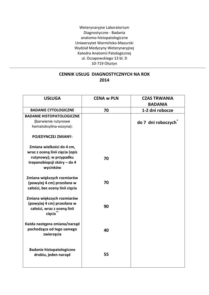 Weterynaryjne Laboratorium Diagnostyczne - Badania anatomo-histopatologiczne Uniwersytet Warmiosko-Mazurski Wydział Medycyny Weterynaryjnej Katedra Anatomii Patologicznej ul. Oczapowskiego 13 bl. D 10-719 Olsztyn CENNIK USŁUG DIAGNOSTYCZNYCH NA ROK 2014 USŁUGA CENA w PLN BADANIE CYTOLOGICZNE BADANIE HISTOPATOLOGICZNE (barwienie rutynowe hematoksylina-eozyna): 70 do 7 dni roboczych* POJEDYNCZEJ ZMIANY: Zmiana wielkości do 4 cm, wraz z oceną linii cięcia (opis rutynowy); w przypadku trepanobiopsji skóry – do 4 wycinków 70 Zmiana większych rozmiarów (powyżej 4 cm) przesłana w całości, bez oceny linii cięcia 70 Zmiana większych rozmiarów (powyżej 4 cm) przesłana w całości, wraz z oceną linii cięcia** 90 Każda następna zmiana/narząd pochodząca od tego samego zwierzęcia 40 Badanie histopatologiczne drobiu, jeden narząd CZAS TRWANIA BADANIA 1-2 dni robocze 55 Przesłanie wyniku drogą elektroniczną wliczone jest w cenę badania. Przesłanie wyniku w formie listu obciążone jest dodatkową opłatą 5 * Czas trwania badania może ulec zmianie w przypadku: - dostarczenia do laboratorium prób nieutrwalonych przeznaczonych do badania techniką parafinową; - konieczności odwapnienia tkanek. ** W przypadku zmian większych rozmiarów, powyżej 4 cm długości, ocena linii cięcia będzie dokonywana po uprzednim zaznaczeniu tej informacji przez lekarza kierującego w skierowaniu BARWIENIA DODATKOWE Rodzaj barwienia AgNOR Azan Trichrome Bieleschowsky Brown-Brenn metoda zmodyfikowana Fontana Masson Grimelius – srebrzenie Grocott Luxol fast blue Klüver i Barbera Mallory Trichrome Cel barwienia Wykrywanie obecności białek srebrochłonnych w regionach organizatorów jąderkowych (NORs). Metoda stosowna do oceny ploidii i aktywności proliferacyjnej komórek nowotworów złośliwych, jako czynników prognostycznych. Wykazanie obecności: włókien mięśniowych, włókien glejowych, kolagenu, retikulum, mezangium kłębuszków nerkowych, erytrocytów i chromatyny jądrowej. Wykazanie obecności: włókienek komórek nerwowych, aksonów, dendrytów i płytek starczych Wykazanie obecności: bakterii Gram dodatnich i Gram ujemnych Wykazanie obecności: melaniny Wykazanie obecności: włókien i ziarnistości srebrochłonnych Wykazanie obecności: grzybów Wykazanie obecności: mieliny i fosfolipidów Wykazanie obecności: kolagenu, retikulum, tkanki chrzęstnej, tkanki kostnej i amyloidu Przeznaczenie Skrawki parafinowe i rozmazy cytologiczne Cena w PLN 50 Skrawki parafinowe 30 Skrawki parafinowe 40 Skrawki parafinowe 50 Skrawki parafinowe Skrawki parafinowe 30 30 Skrawki parafinowe Skrawki parafinowe 30 50 Skrawki parafinowe 30 Masson Trichrome z aniline blue May Grünwald Giemsa Mucicarmine Periodic Acid Schiff (PAS) Sirius Red Van Gieson trichrome Verhoeff Von Kossa Wykazanie obecności: gamet, jąder komórkowych, włókienek komórek nerwowych, neurogleju, kolagenu, włókienek wewnątrzkomórkowych, kwasochłonnych i zasadochłonnych ziarnistości Wykazanie obecności: elementów komórkowych szczególnie komórek krwi, tkanki limfatycznej (śledziona, węzły chłonne), bakterii, pasożytów, cytoplazmatycznych ziarnistości metachromatycznych komórek tucznych Wykazanie obecności: mukopolisacharydów pochodzenia nabłonkowego Wykazanie obecności: wykrywanie wielocukrów śluzowych, glikogenu i glikoproteidów (błon podstawnych) i osłonek niektórych grzybów Wykazanie obecności: amyloidu w tkankach. Barwienie różnicujące włókna kolagenowe od elementów komórkowych tkanki łącznej włóknistej i włókien mięśniowych. Wykazanie obecności: włókien sprężystych. Zastosowanie w patologii naczyń. Wykazanie obecności: jonów wapnia w tkankach Skrawki parafinowe 30 Skrawki parafinowe i rozmazy cytologiczne 30 Skrawki parafinowe 40 Skrawki parafinowe 30 Skrawki parafinowe 40 Skrawki parafinowe 30 Skrawki parafinowe 40 Skrawki parafinowe 30 Barwienia dodatkowe wykonywane są w przypadku, kiedy lekarz kierujący umieści taką informację w skierowaniu na badania cytologiczne, czy histopatologiczne. W przypadku zaistnienia potrzeby wykonania badań dodatkowych w trakcie procesu diagnostycznego, badania takie będą wykonywane po konsultacji z lekarzem kierującym. Czas oczekiwania na wyniki badań dodatkowych do 2 tygodni. PANELE BARWIEŃ IMMUNOHISTOCHEMICZNYCH NOWOTWÓR Chłoniaki Podstawowe różnicowanie nowotworu Nowotwór okrągłokomórkowy Melanoma Panel mezenchymalny Mastocytoma Panel neuroendokrynny Marker proliferacji PRZECIWCIAŁO CD3; CD79a Cytokeratyna; vimetyna CENA w PLN 150 150 CD3; CD79a: CD18; MHCII S-100 vimentyna; SMA; desmina tryptaza cytokeratyna; vimentyna, chromogranina A, NSE Ki-67 220 90 180 90 220 100 Barwienia immunohistochemiczne wykonywane są w przypadku, kiedy lekarz kierujący umieści taką informację w skierowaniu na badania cytologiczne, czy histopatologiczne. W przypadku zaistnienia potrzeby wykonania badań immunohistochemicznych w trakcie procesu diagnostycznego, badania takie będą wykonywane po konsultacji z lekarzem kierującym. Czas oczekiwania na wyniki badań immunohistochemicznych do 3 tygodni.