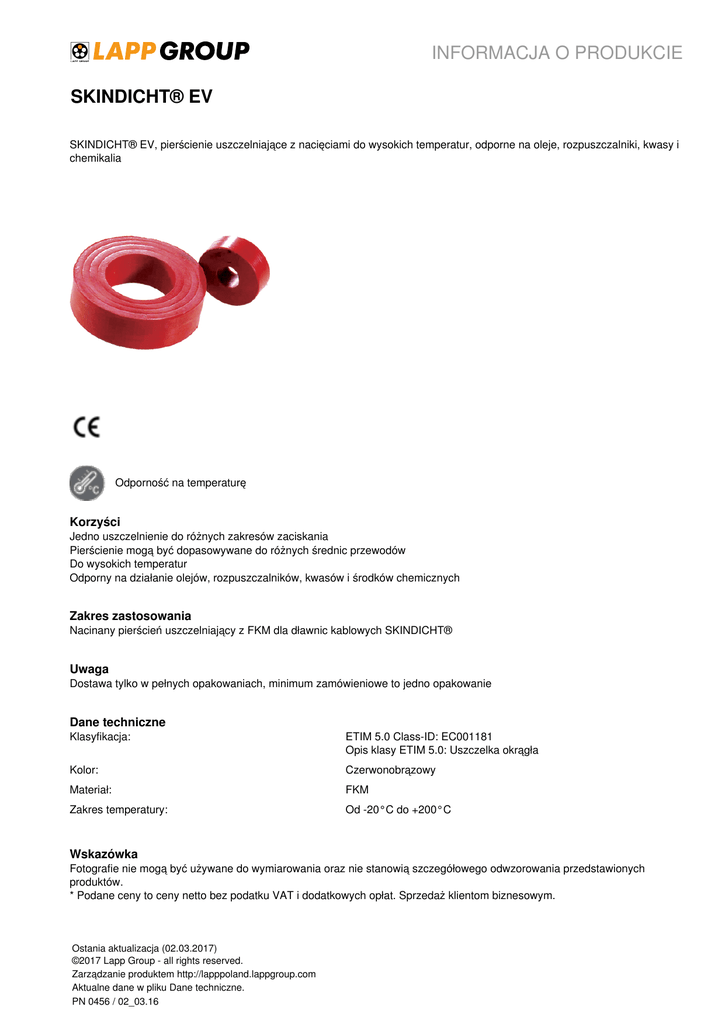 INFORMACJA O PRODUKCIE SKINDICHT® EV SKINDICHT® EV, pierścienie uszczelniające z nacięciami do wysokich temperatur, odporne na oleje, rozpuszczalniki, kwasy i chemikalia Odporność na temperaturę Korzyści Jedno uszczelnienie do różnych zakresów zaciskania Pierścienie mogą być dopasowywane do różnych średnic przewodów Do wysokich temperatur Odporny na działanie olejów, rozpuszczalników, kwasów i środków chemicznych Zakres zastosowania Nacinany pierścień uszczelniający z FKM dla dławnic kablowych SKINDICHT® Uwaga Dostawa tylko w pełnych opakowaniach, minimum zamówieniowe to jedno opakowanie Dane techniczne Klasyfikacja: ETIM 5.0 Class-ID: EC001181 Opis klasy ETIM 5.0: Uszczelka okrągła Kolor: Czerwonobrązowy Materiał: FKM Zakres temperatury: Od -20°C do +200°C Wskazówka Fotografie nie mogą być używane do wymiarowania oraz nie stanowią szczegółowego odwzorowania przedstawionych produktów. * Podane ceny to ceny netto bez podatku VAT i dodatkowych opłat. Sprzedaż klientom biznesowym. Ostania aktualizacja (02.03.2017) ©2017 Lapp Group - all rights reserved. Zarządzanie produktem http://lapppoland.lappgroup.com Aktualne dane w pliku Dane techniczne. PN 0456 / 02_03.16 Powered by TCPDF (www.tcpdf.org) Oznaczenie produktu/rozmiar Średnica zewn. x otwory [mm] Grubość [mm] 52010340 EV 11 7/10/12,5 6 52010350 EV 13,5 7/10,5/13/16 6,5 52010360 EV 16 8/10,5/13,5/16 7,5 52010370 EV 21 11/15/18/20 8 52010380 EV 29 19/23/27/31 9,5 52010390 EV 36 25/28/31/35 12 52010410 EV 42 35,5/39/42,5/46 14 SKINDICHT® EV SKINDICHT® EV Ostania aktualizacja (02.03.2017) ©2017 Lapp Group - all rights reserved. Zarządzanie produktem http://lapppoland.lappgroup.com Aktualne dane w pliku Dane techniczne. PN 0456 / 02_03.16 INFORMACJA O PRODUKCIE Powered by TCPDF (www.tcpdf.org) Numer katalogowy